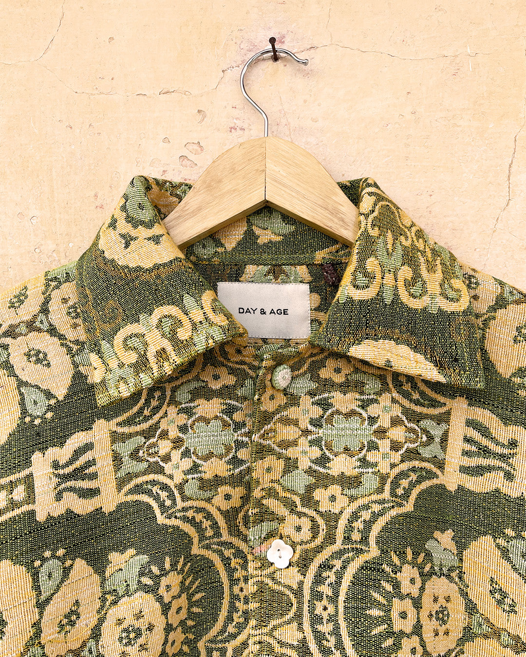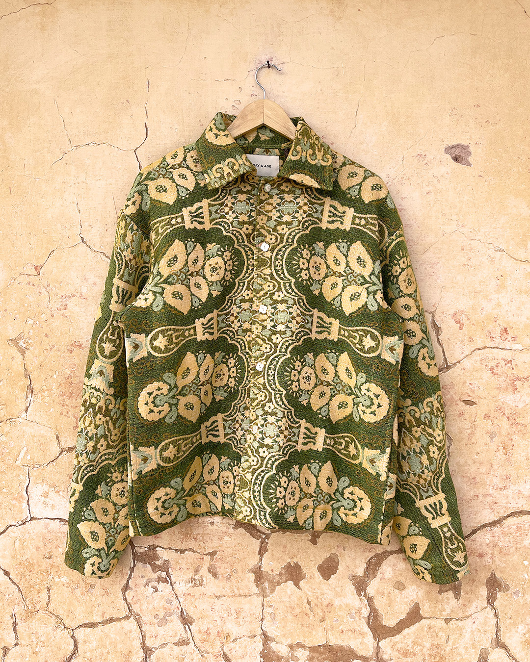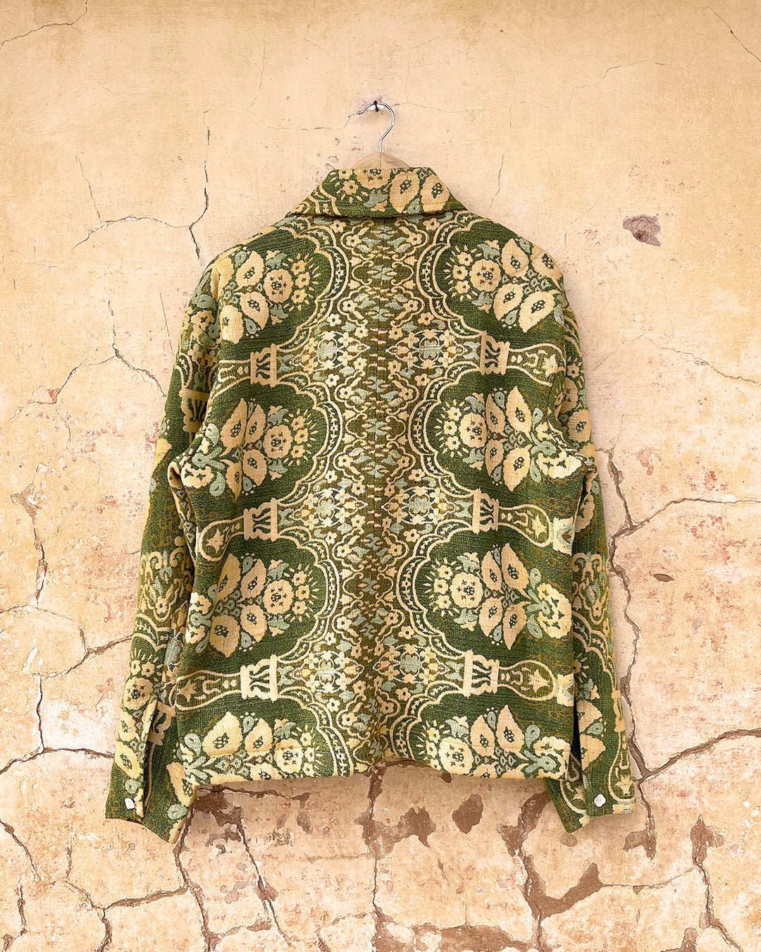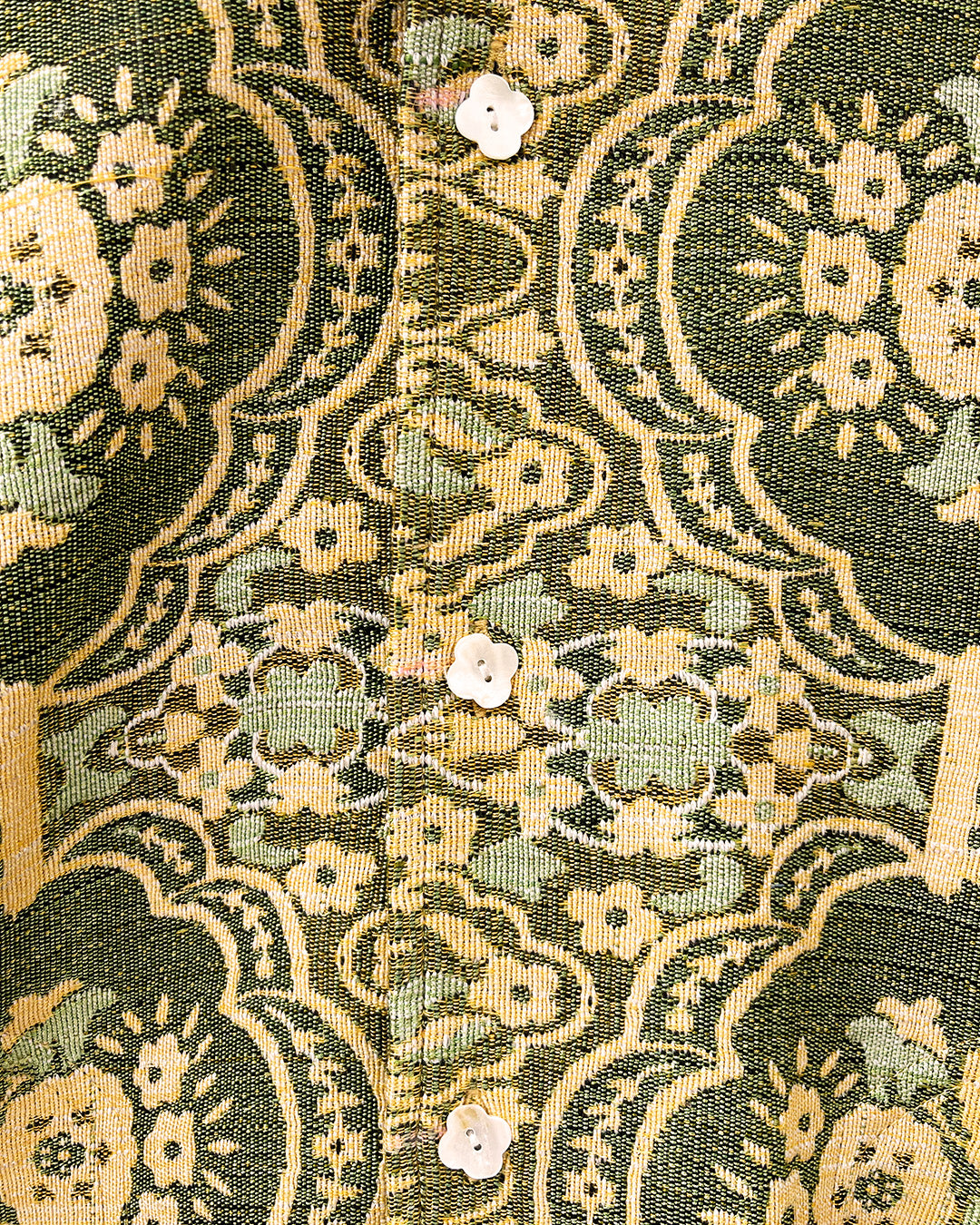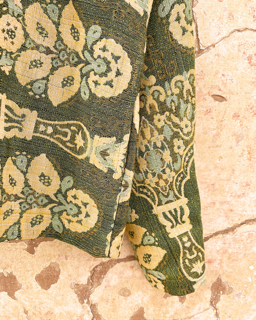 This garment is made from a vintage handwoven jacquard bedspread from India.