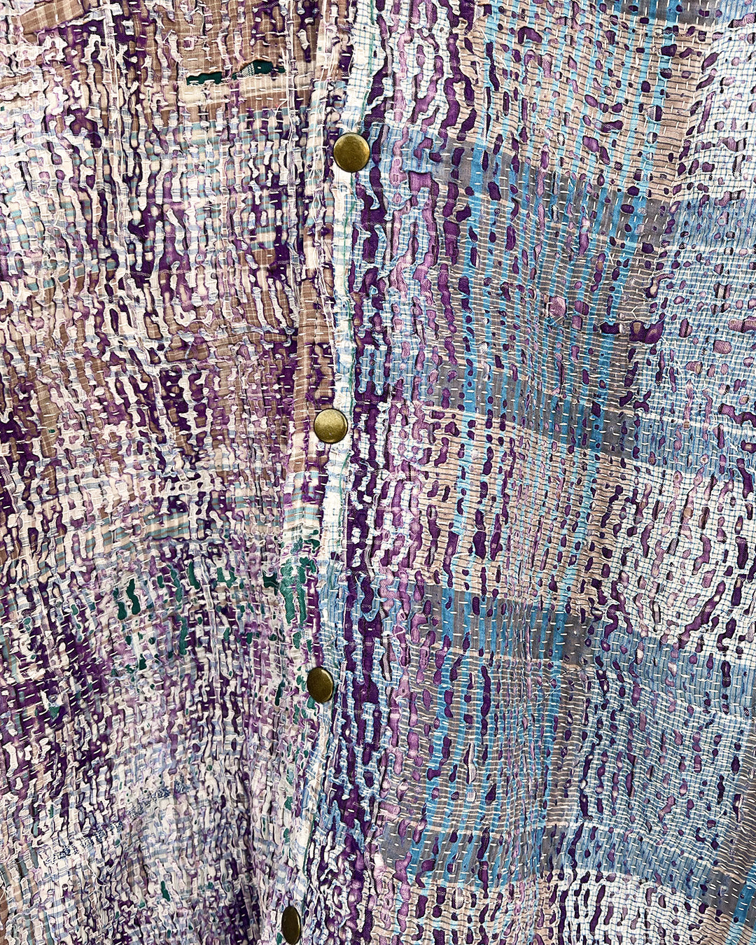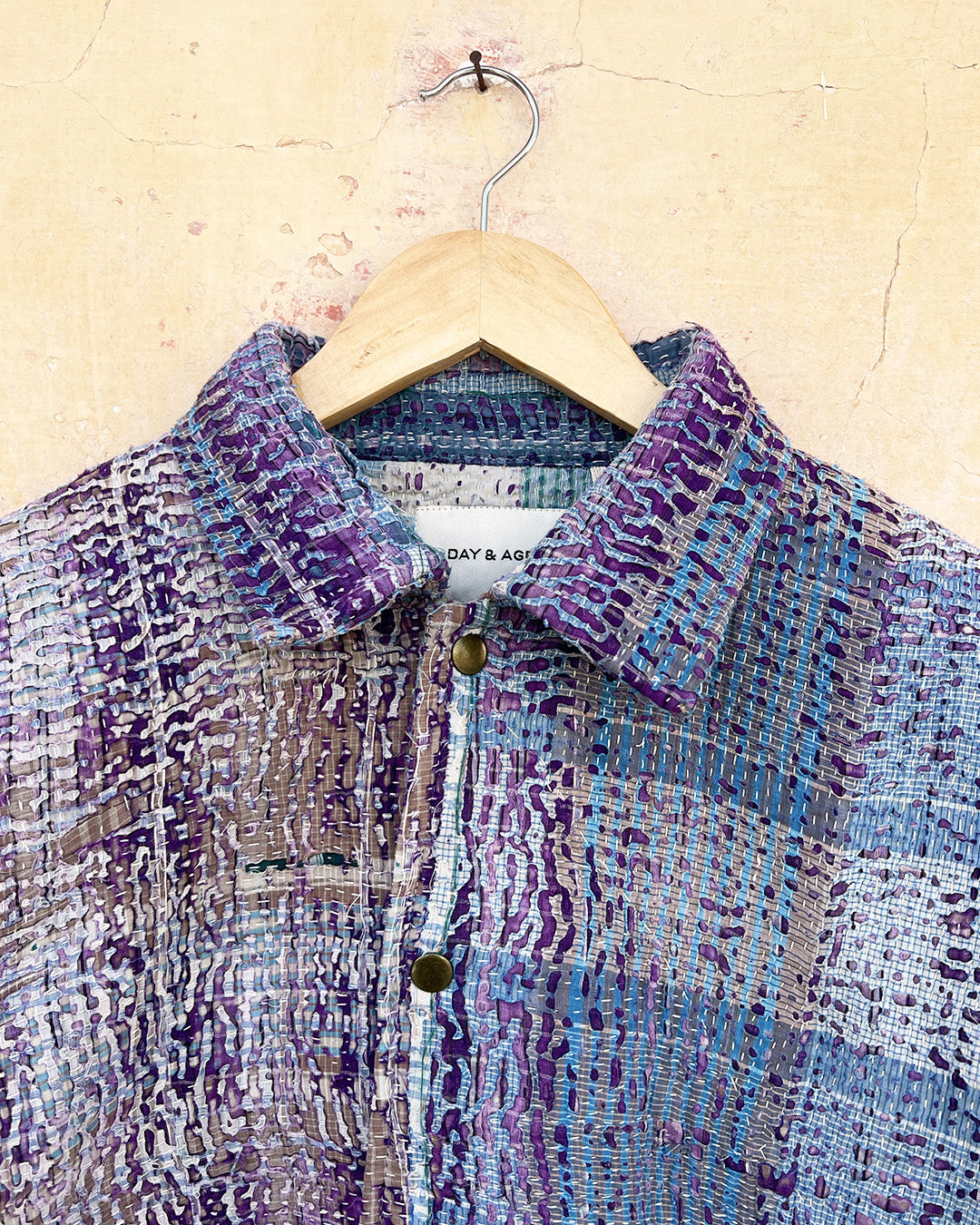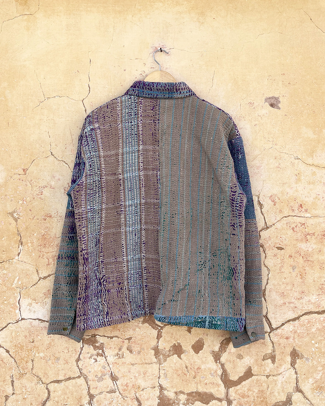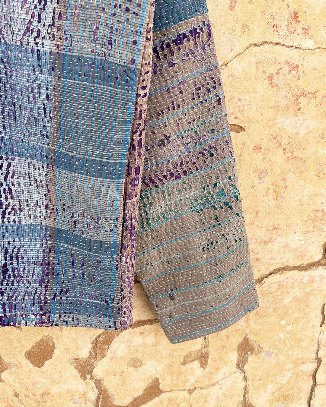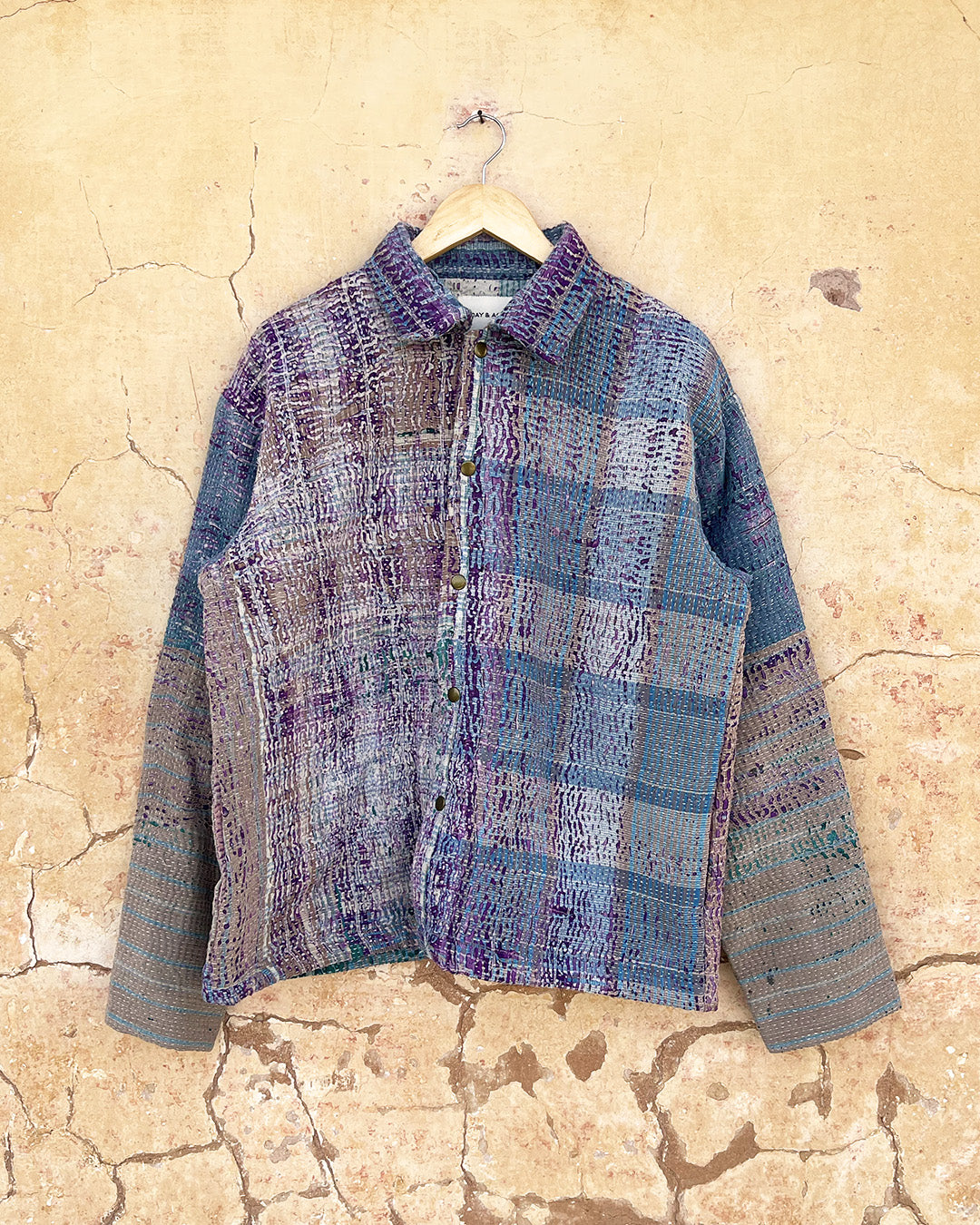 Kantha quilts are crafted from repurposed saris and fabrics and feature repairs, darning, and patchwork. These unique details not only add character but ensure durable, one-of-a-kind garments with a rich up-cycling heritage. We embrace the distressed patches alongside the intricate stitch work in the most unlikely colours.