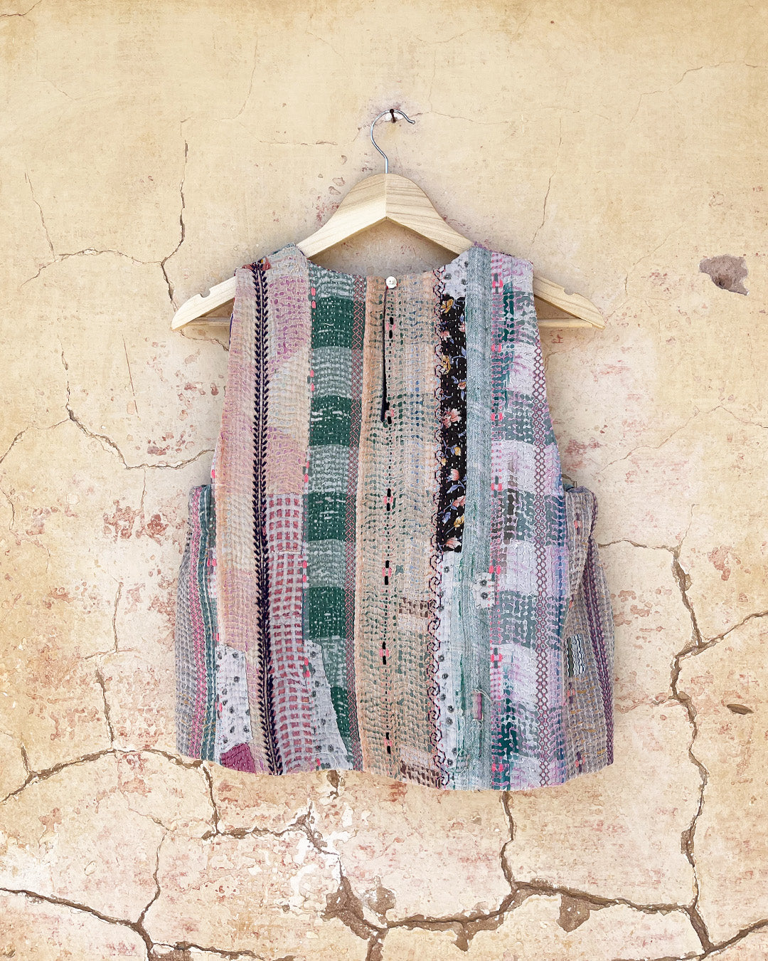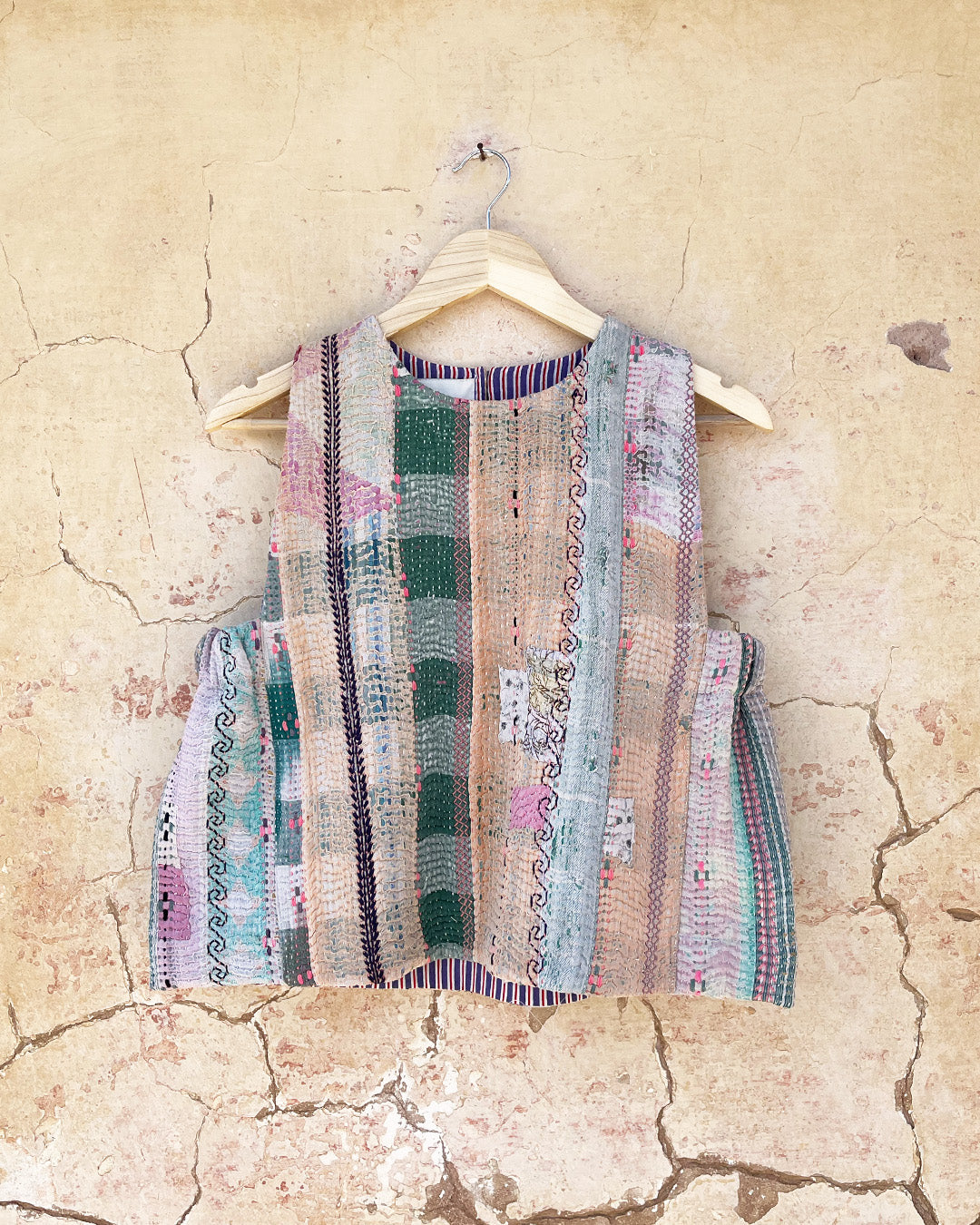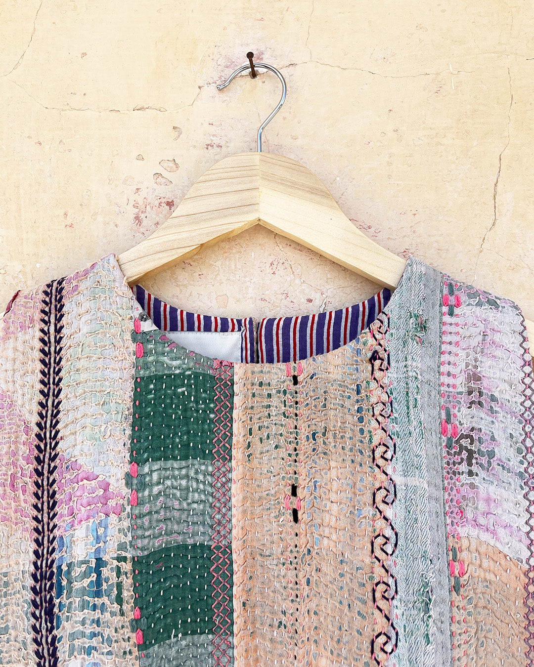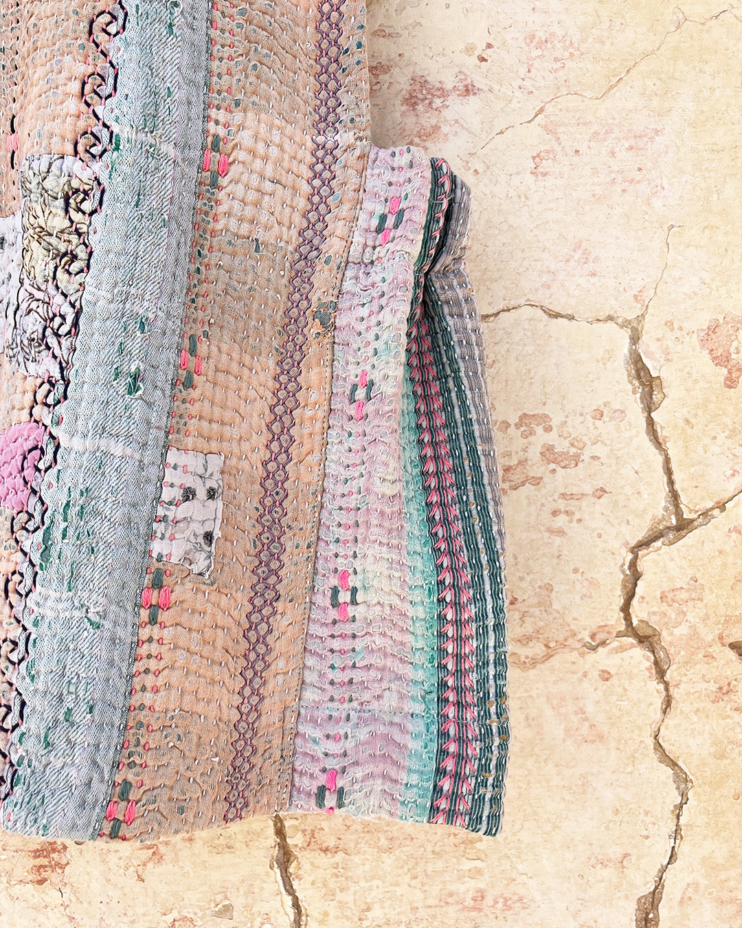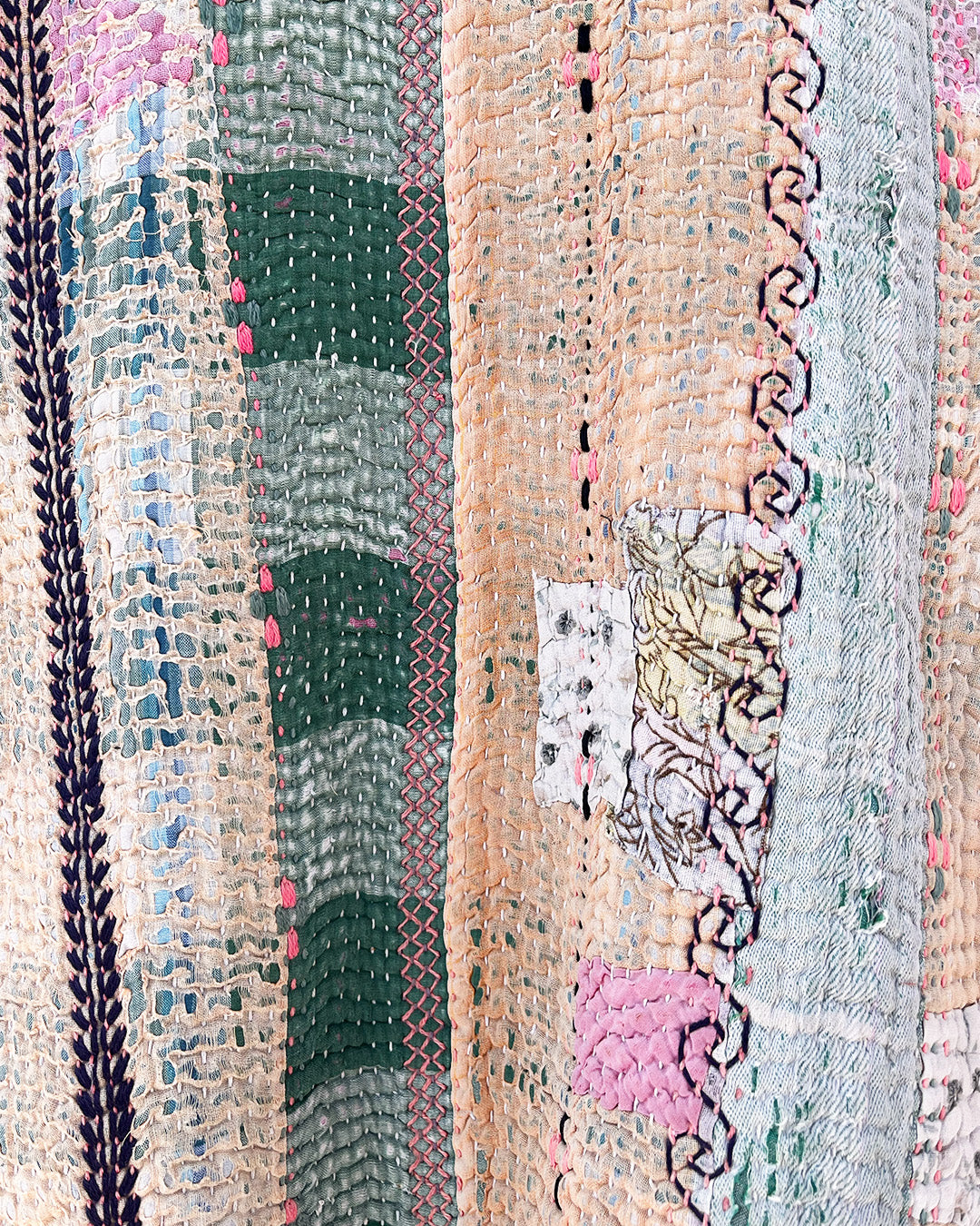 Kantha quilts are crafted from repurposed saris and fabrics and feature repairs, darning, and patchwork. These unique details not only add character but ensure durable, one-of-a-kind garments with a rich up-cycling heritage. We embrace the distressed patches alongside the intricate stitch work in the most unlikely colours.