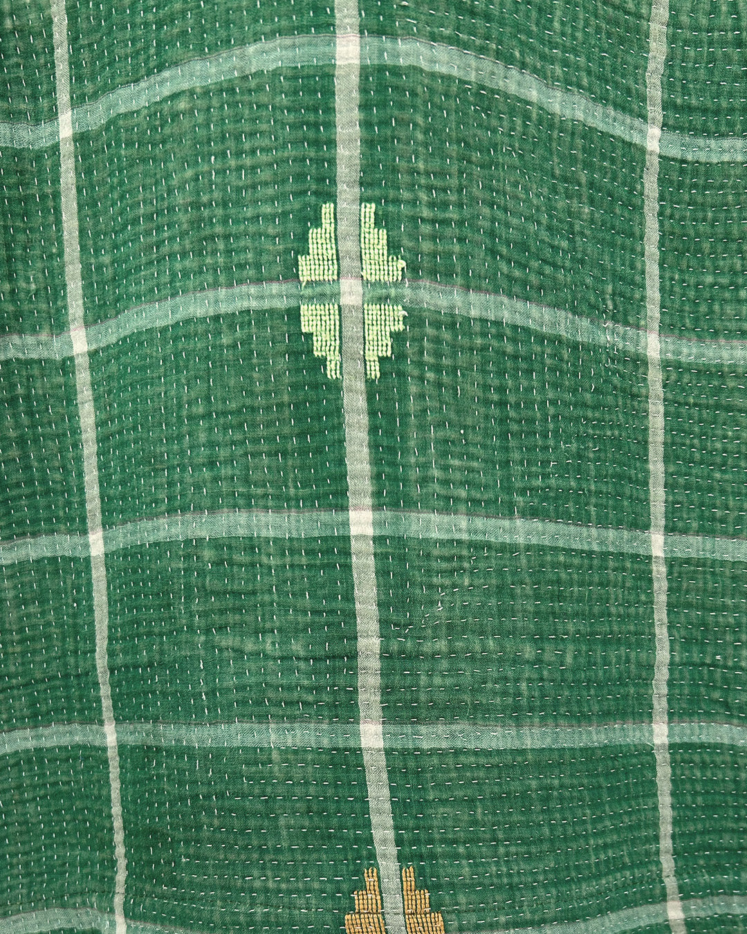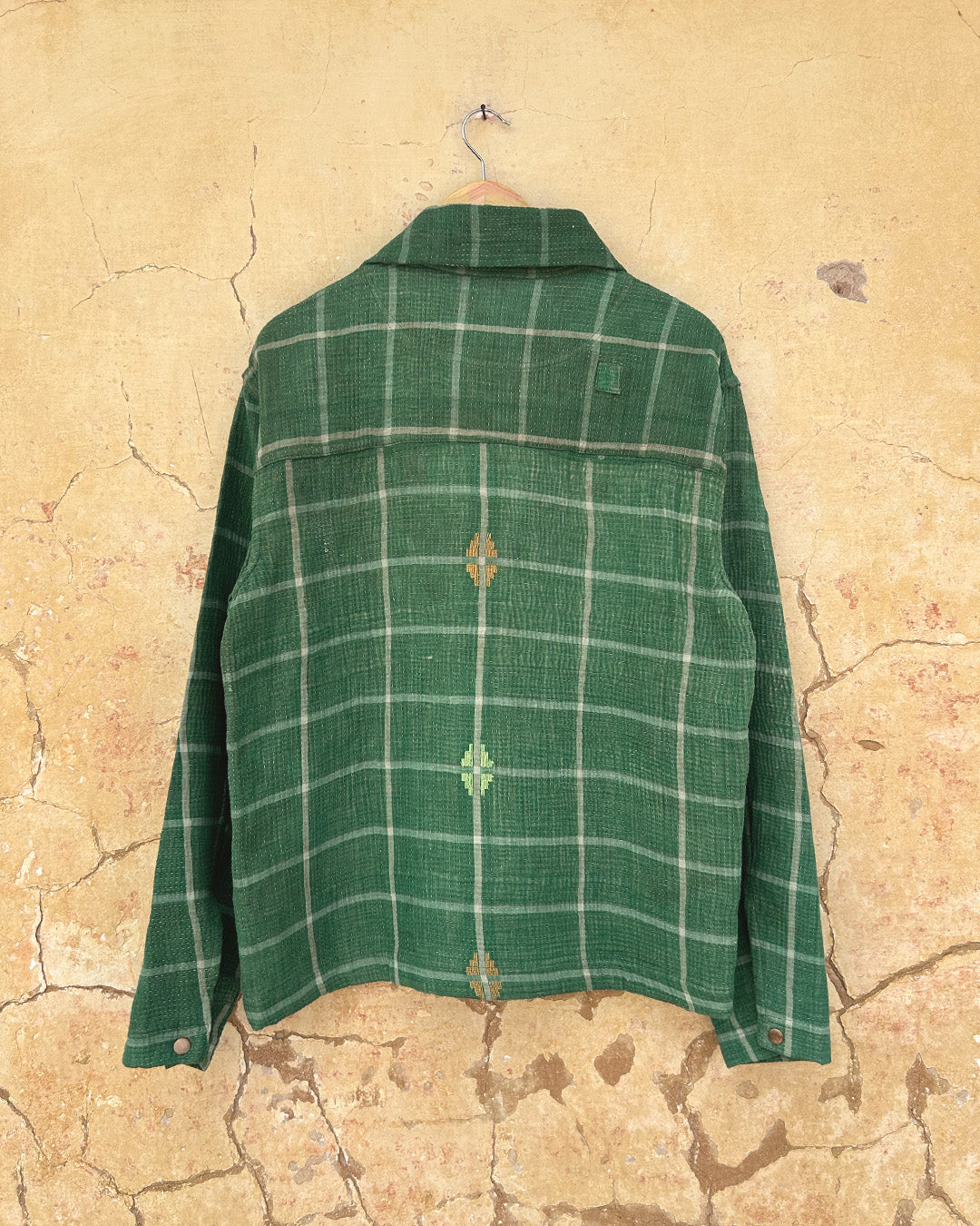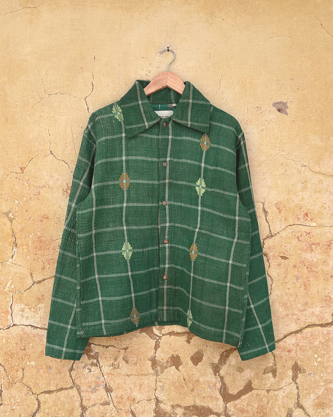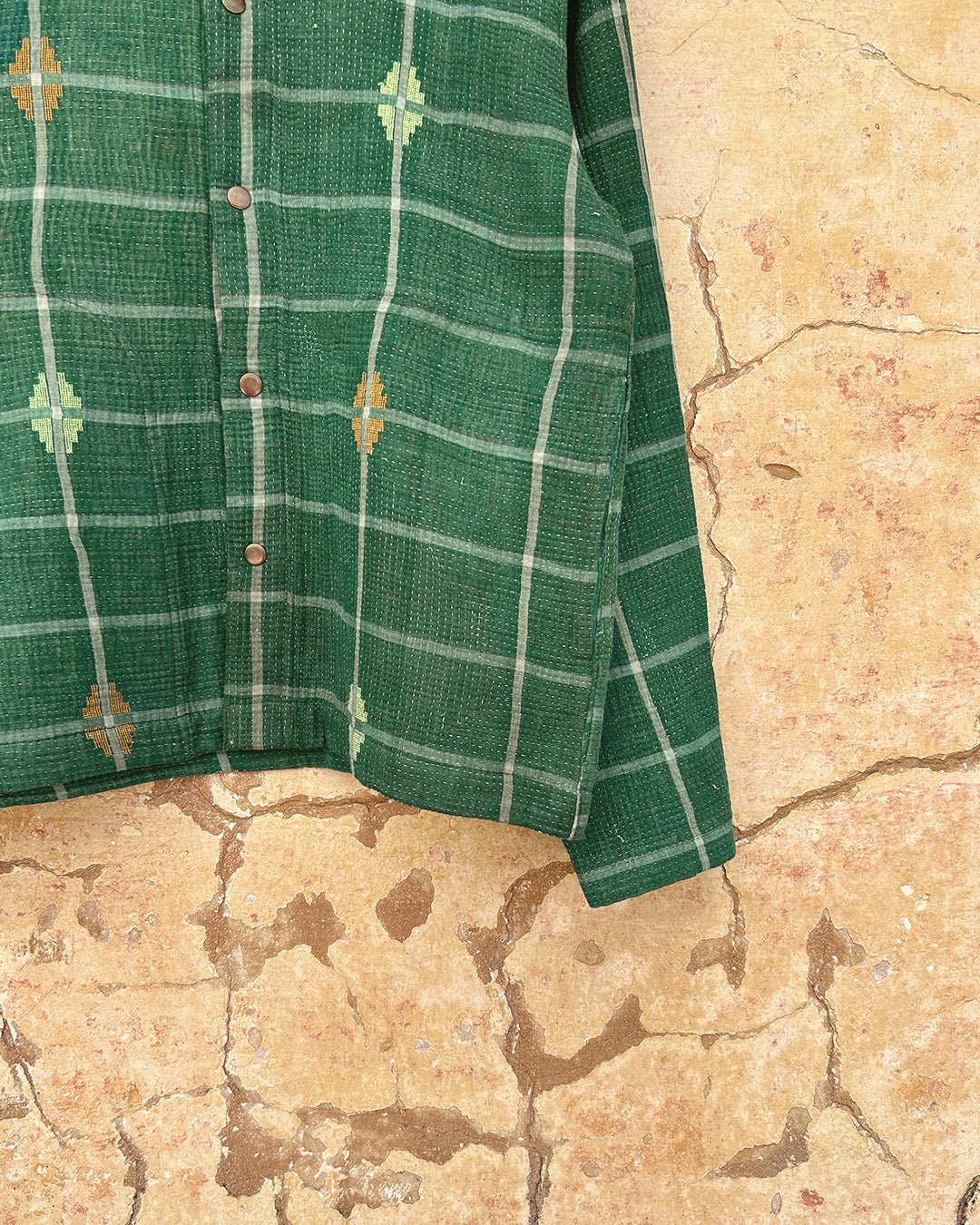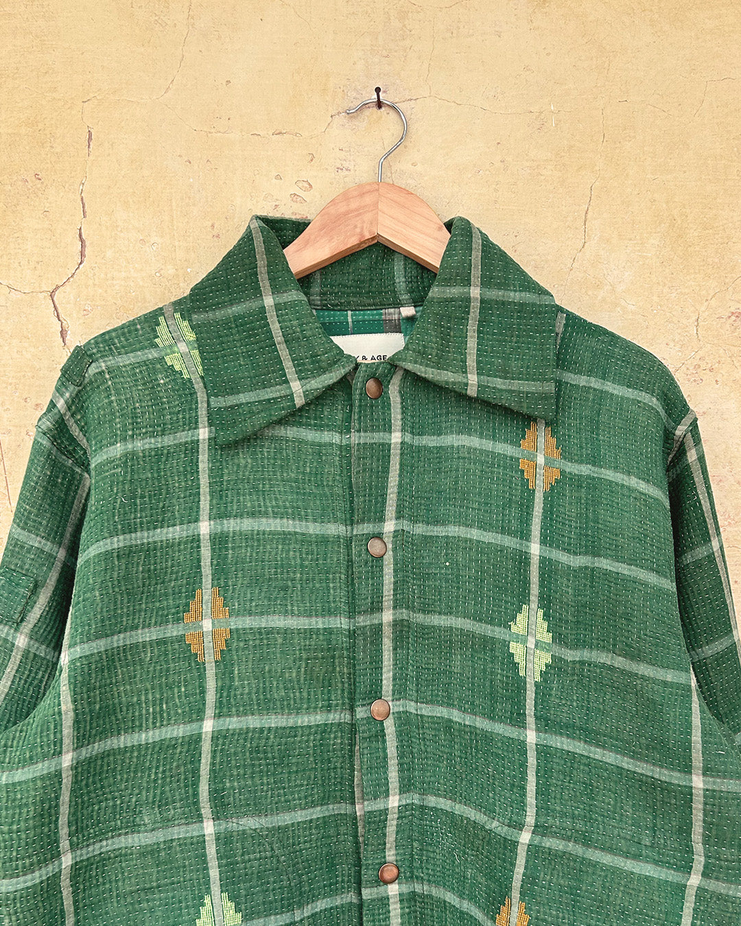 Kantha quilts are crafted from repurposed saris and fabrics and feature repairs, darning, and patchwork. These unique details not only add character but ensure durable, one-of-a-kind garments with a rich up-cycling heritage. We embrace the distressed patches alongside the intricate stitch work in the most unlikely colours.