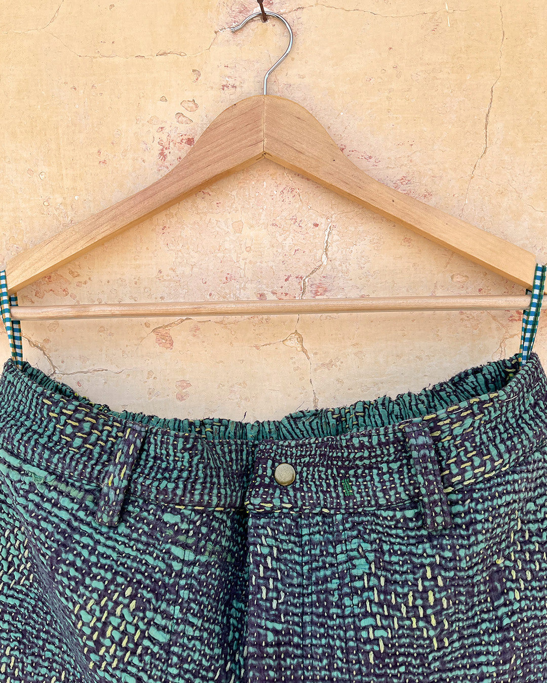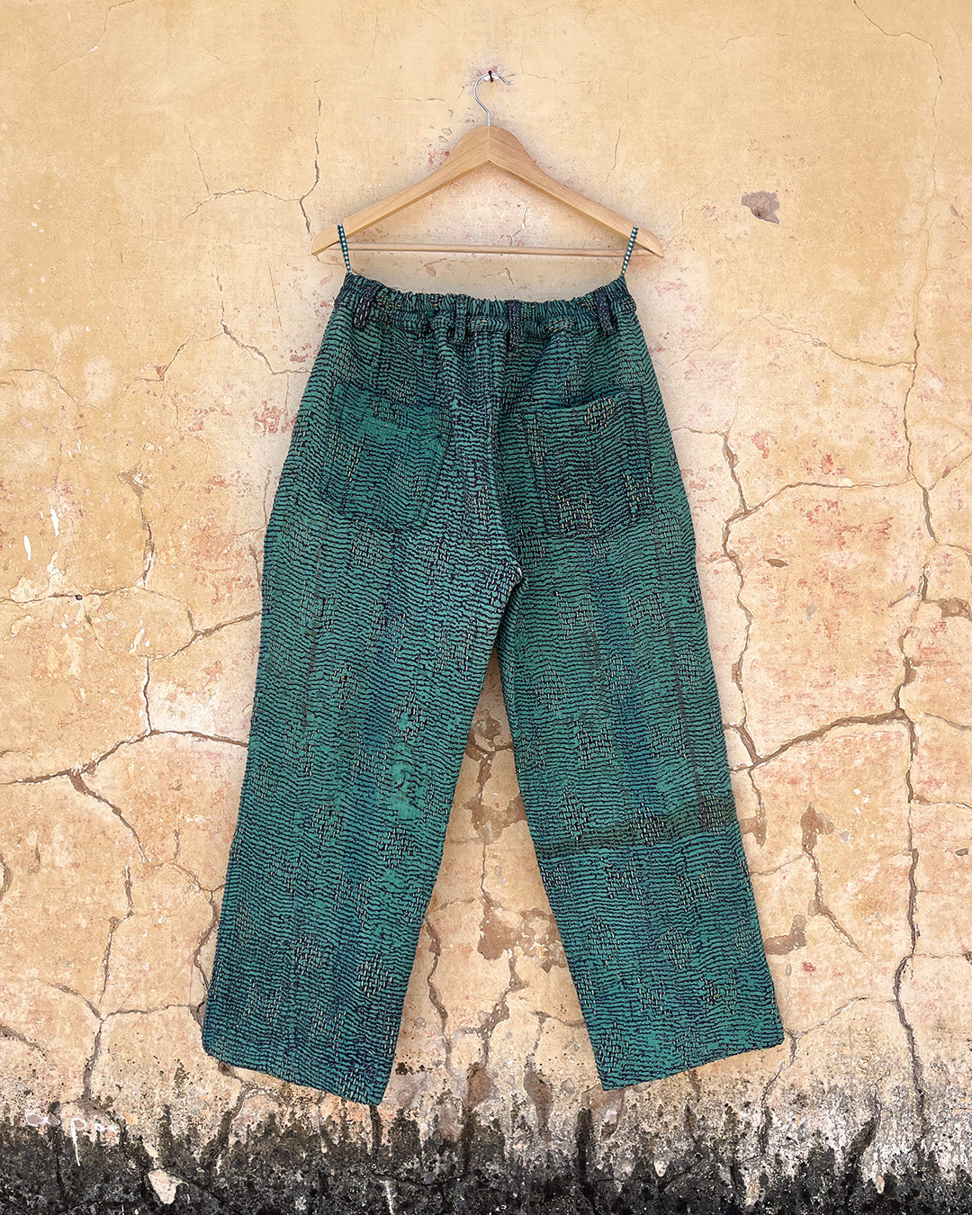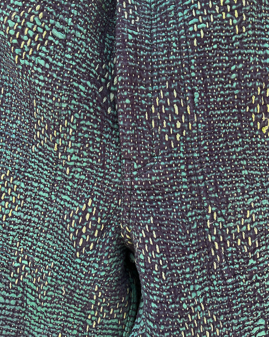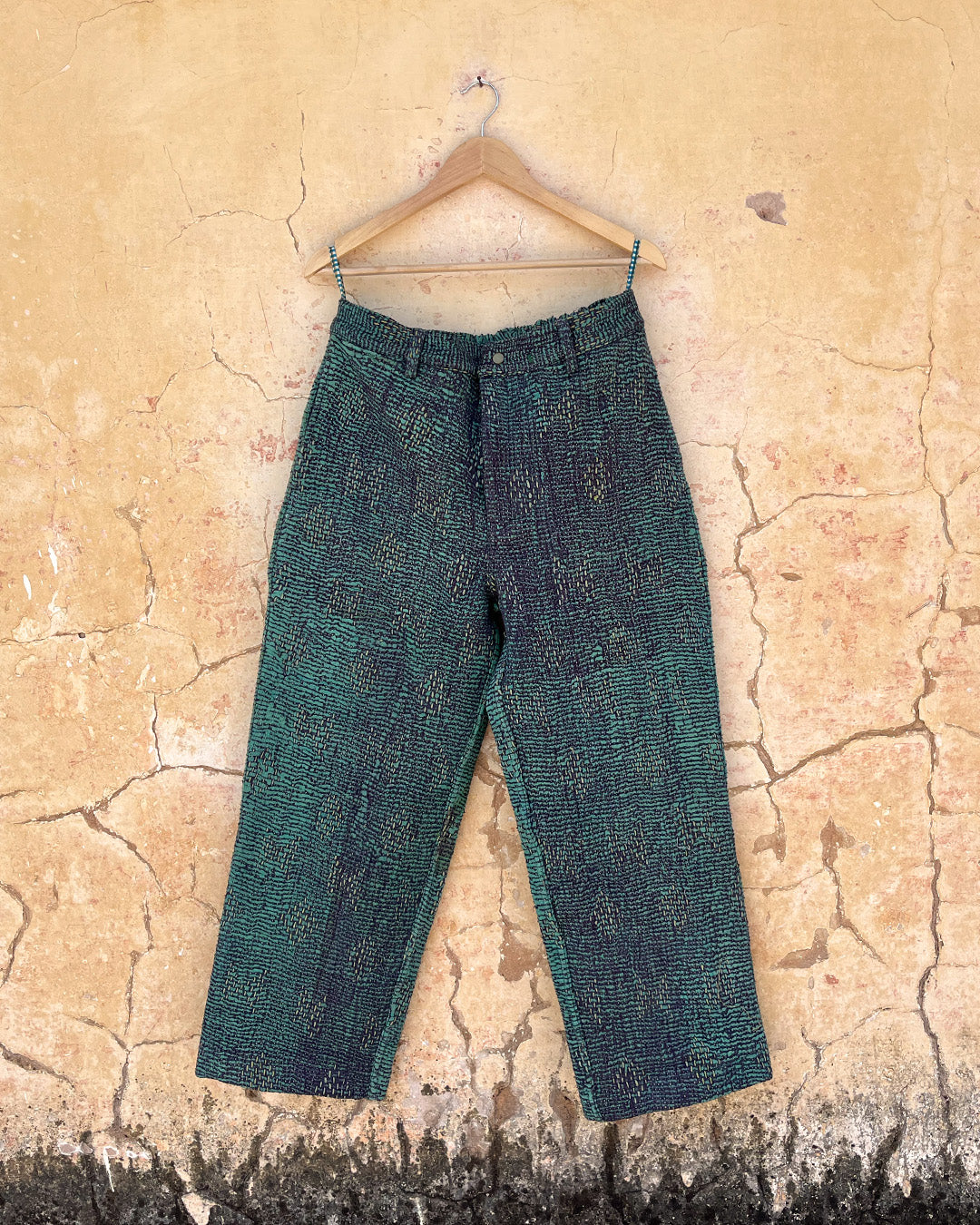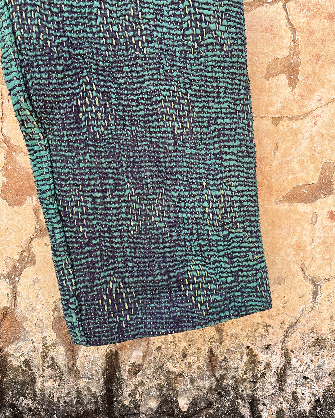 Kantha quilts are crafted from repurposed saris and fabrics and feature repairs, darning, and patchwork. These unique details not only add character but ensure durable, one-of-a-kind garments with a rich up-cycling heritage. We embrace the distressed patches alongside the intricate stitch work in the most unlikely colours.