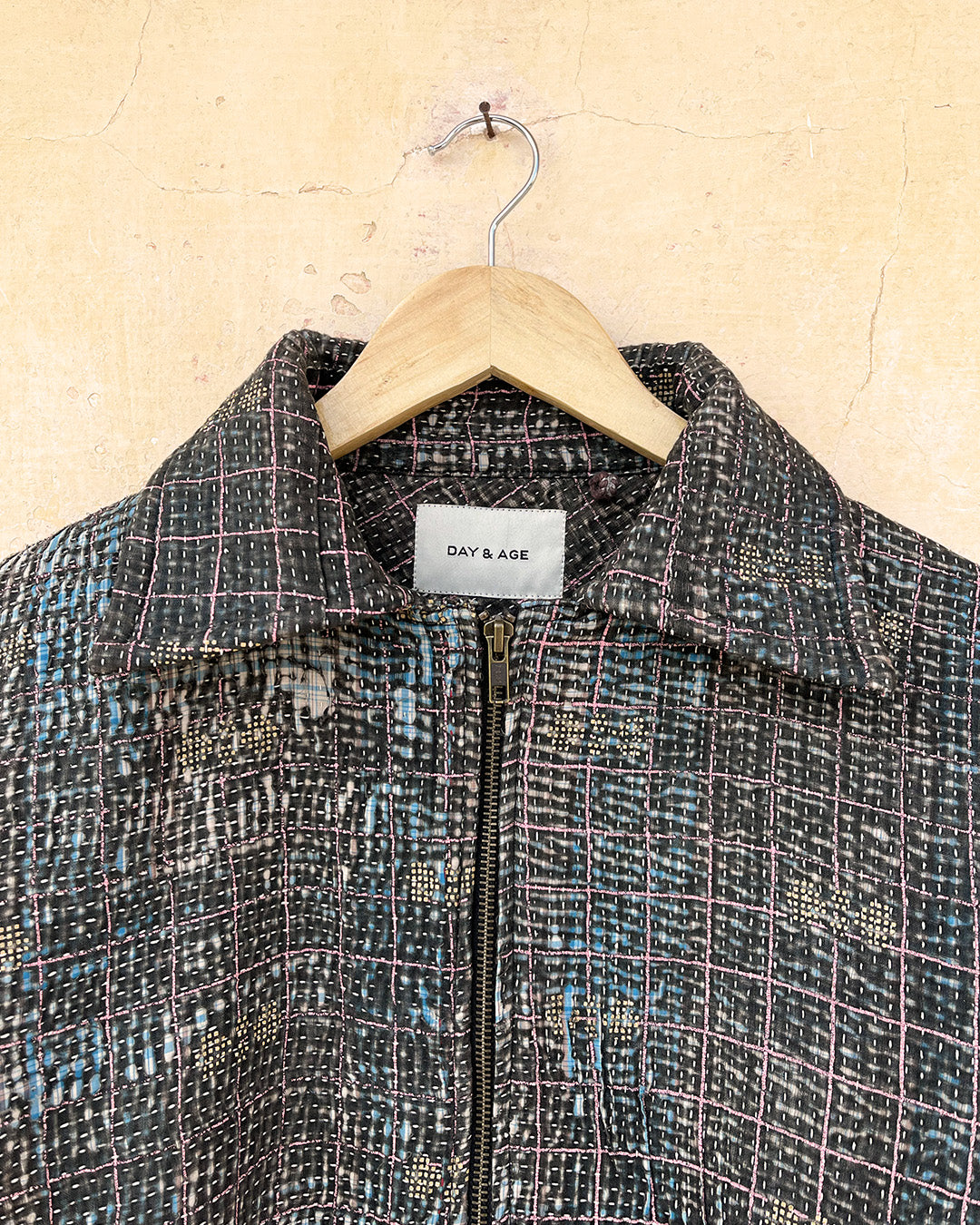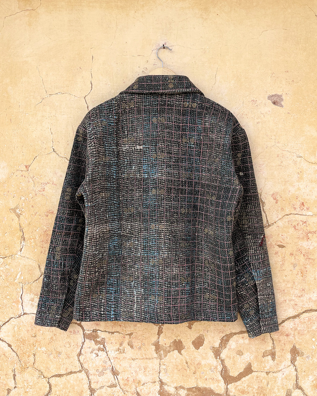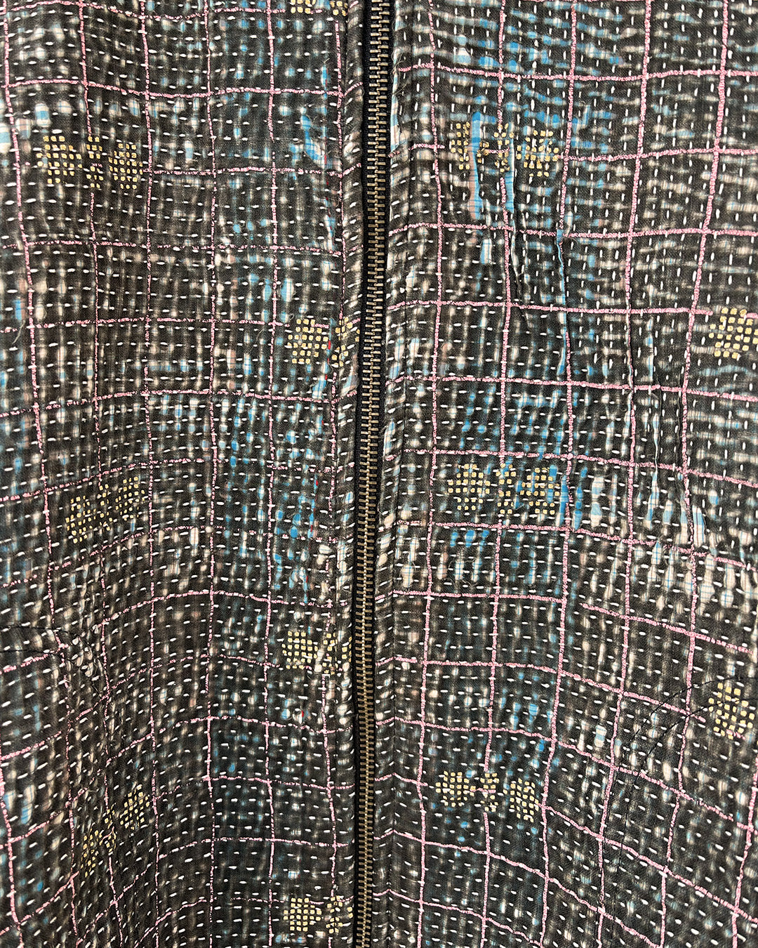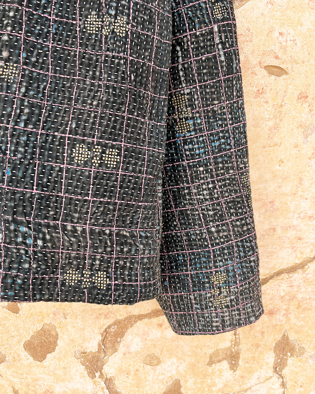 Kantha quilts are crafted from repurposed saris and fabrics and feature repairs, darning, and patchwork. These unique details not only add character but ensure durable, one-of-a-kind garments with a rich up-cycling heritage. We embrace the distressed patches alongside the intricate stitch work in the most unlikely colours.
