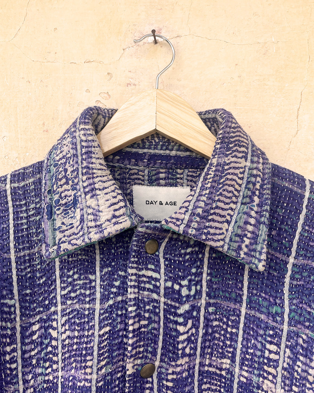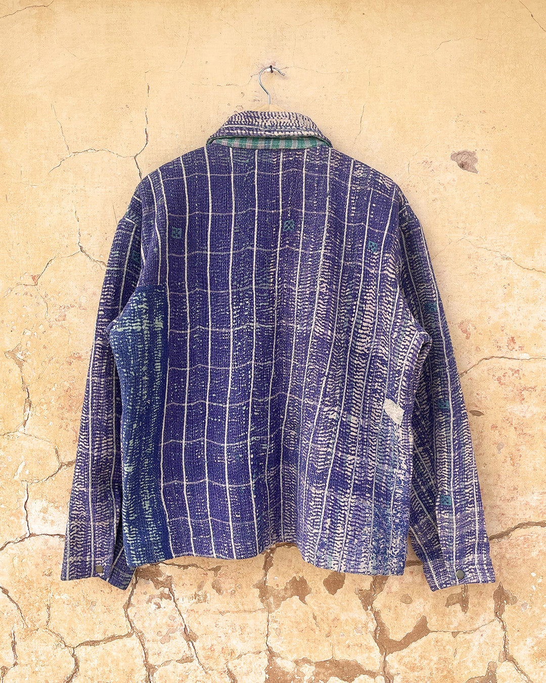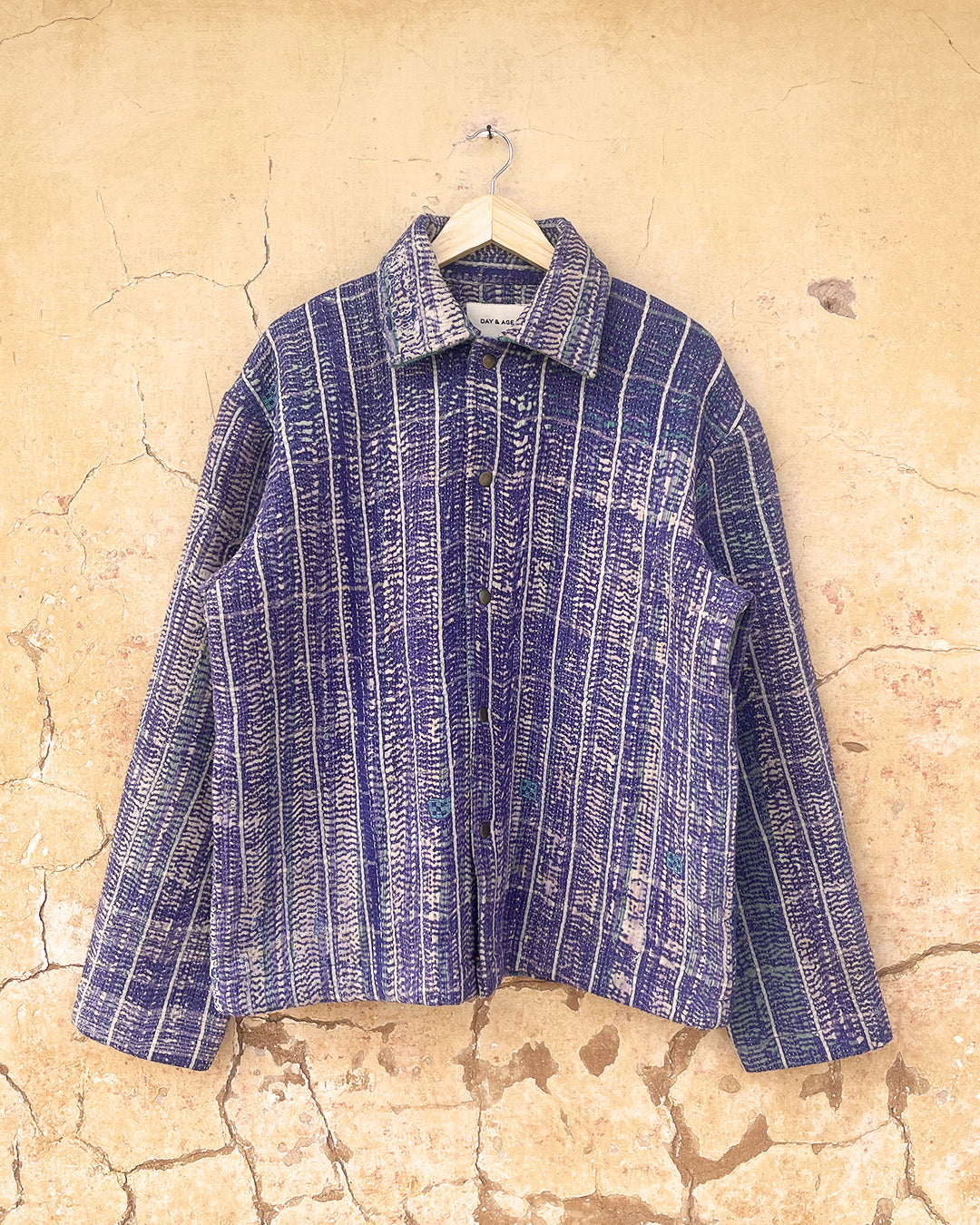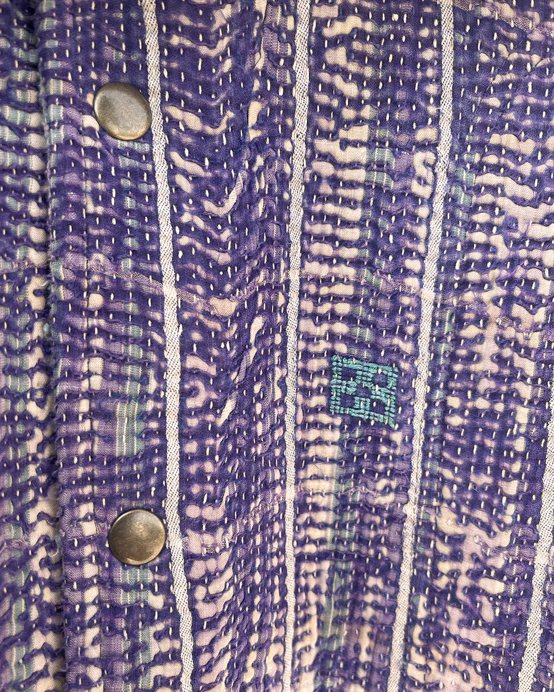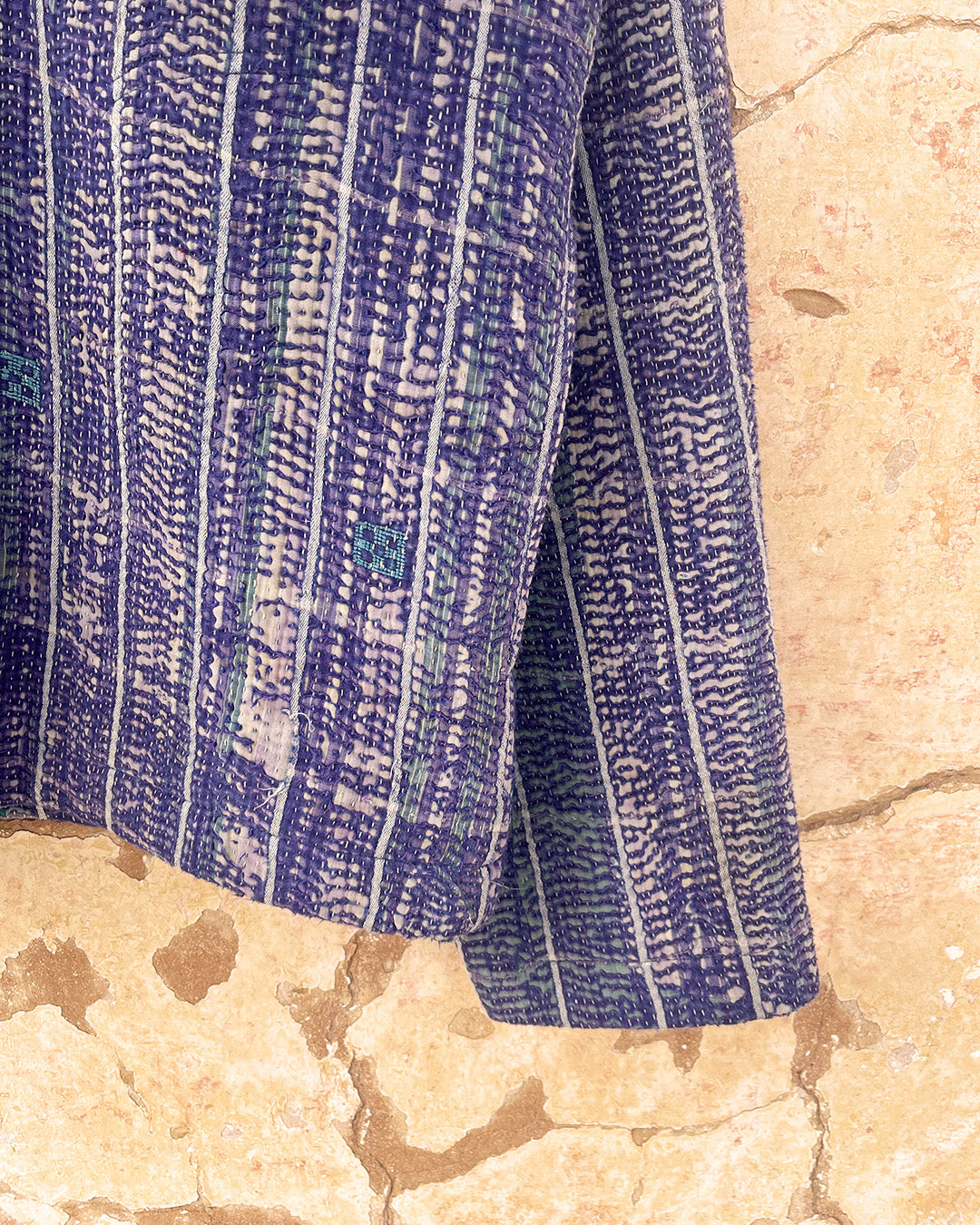 Kantha quilts are crafted from repurposed saris and fabrics and feature repairs, darning, and patchwork. These unique details not only add character but ensure durable, one-of-a-kind garments with a rich up-cycling heritage. We embrace the distressed patches alongside the intricate stitch work in the most unlikely colours.