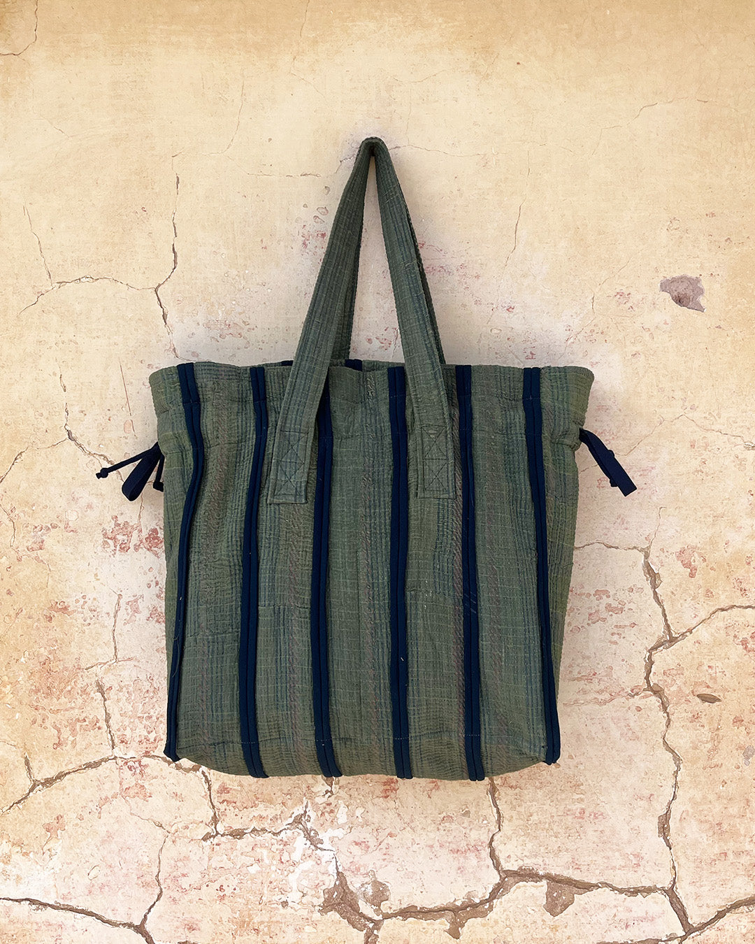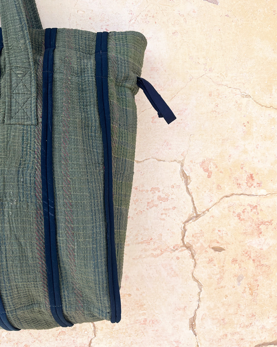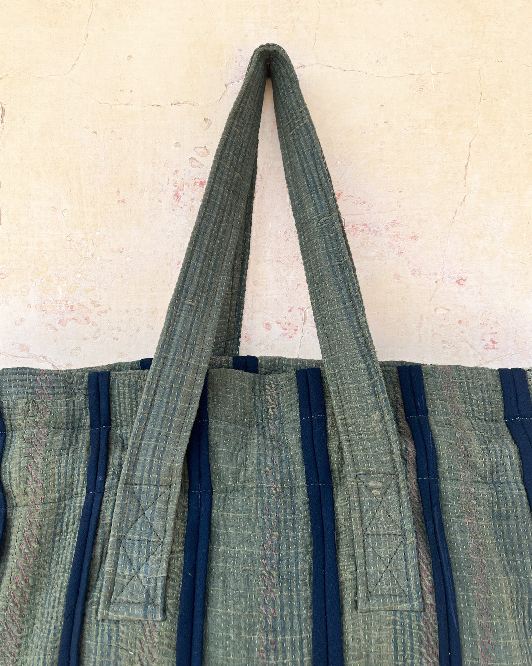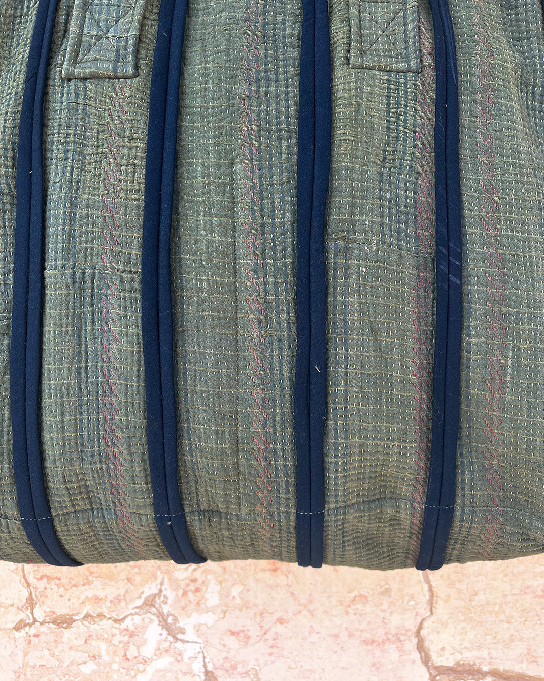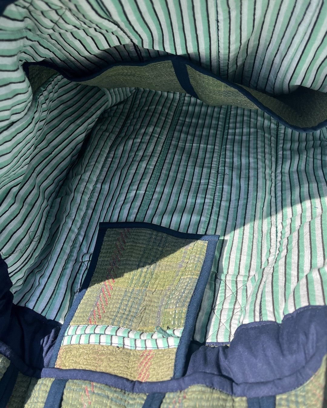 Kantha quilts are crafted from repurposed saris and fabrics and feature repairs, darning, and patchwork. These unique details not only add character but ensure durable, one-of-a-kind garments with a rich up-cycling heritage. We embrace the distressed patches alongside the intricate stitch work in the most unlikely colours.