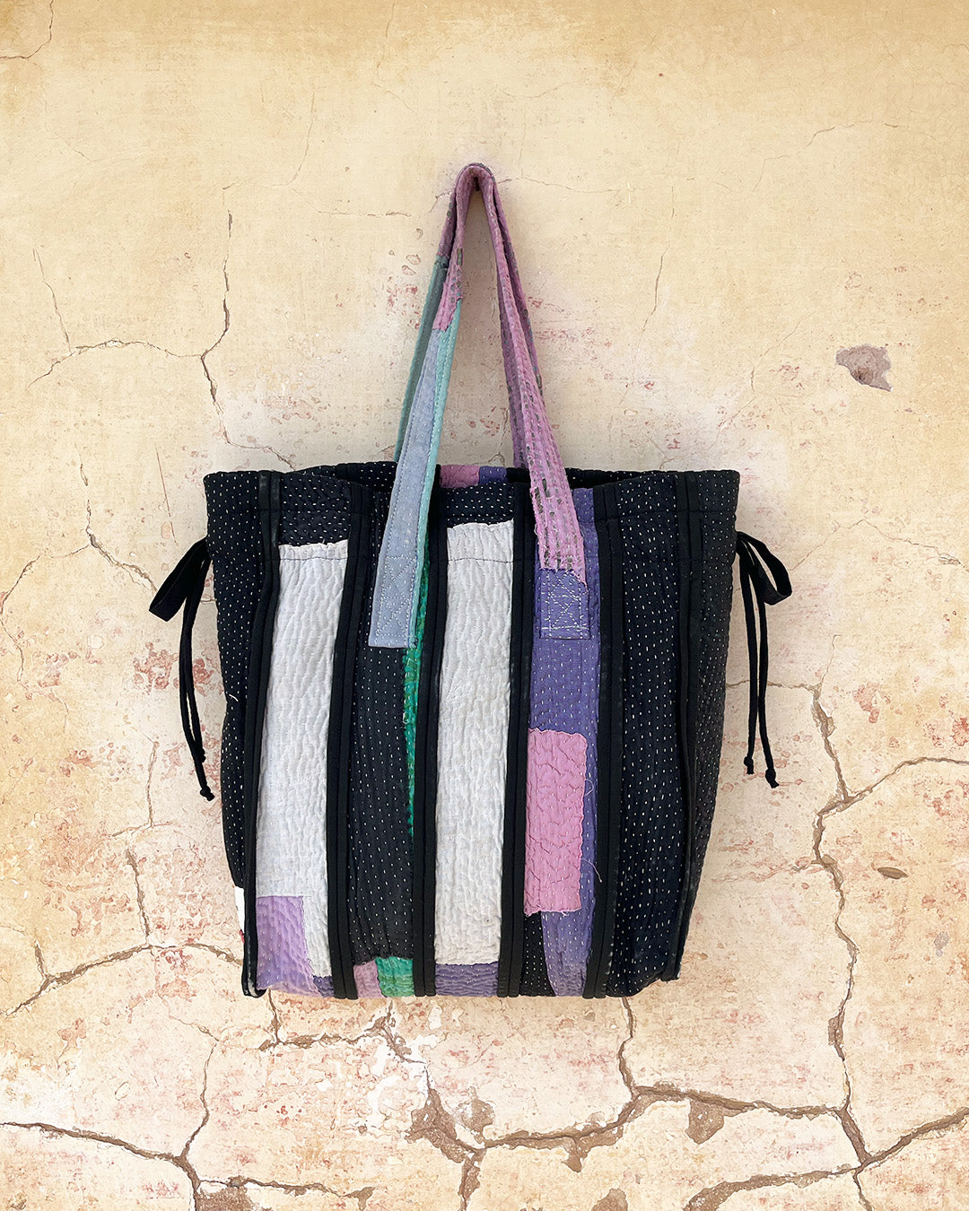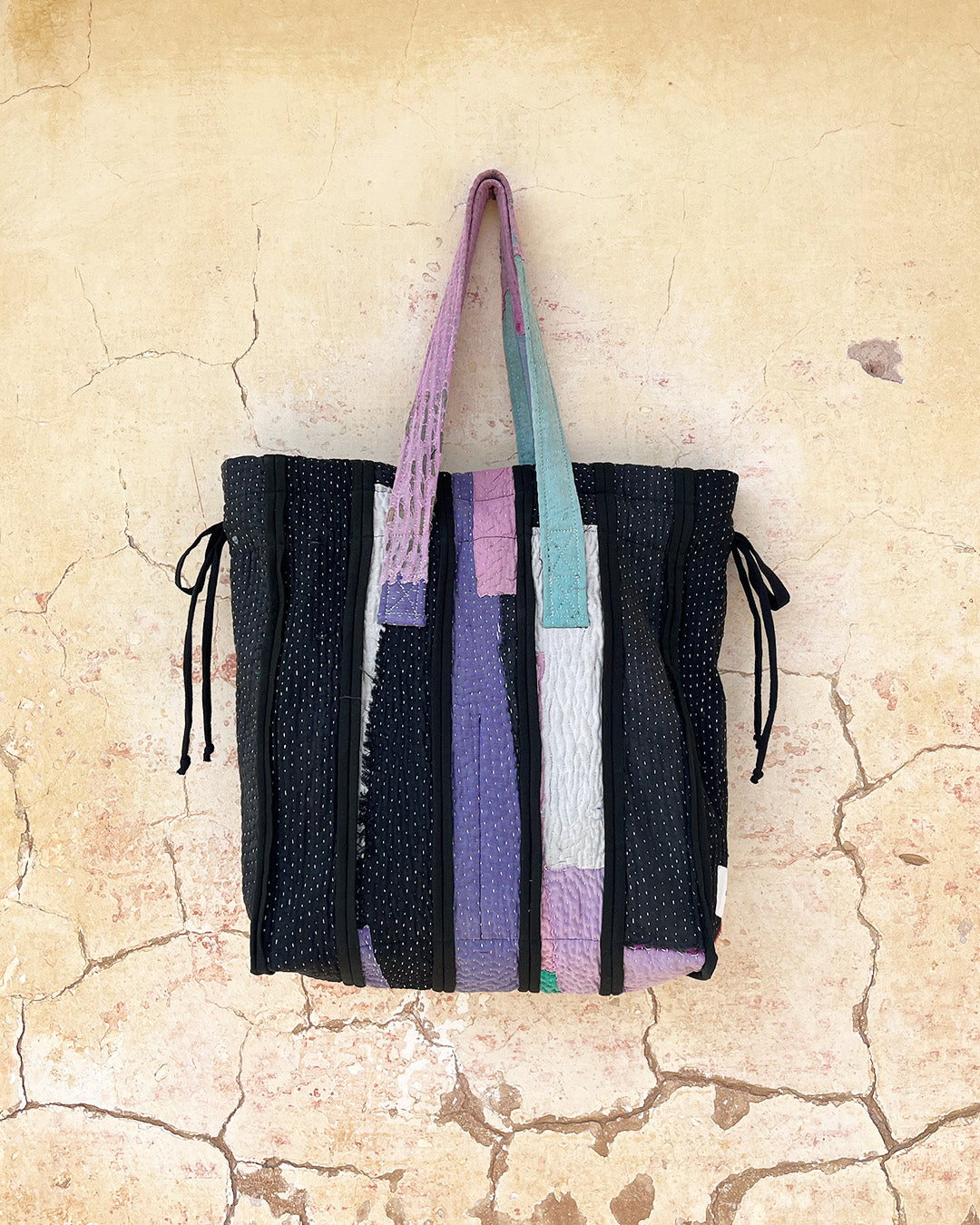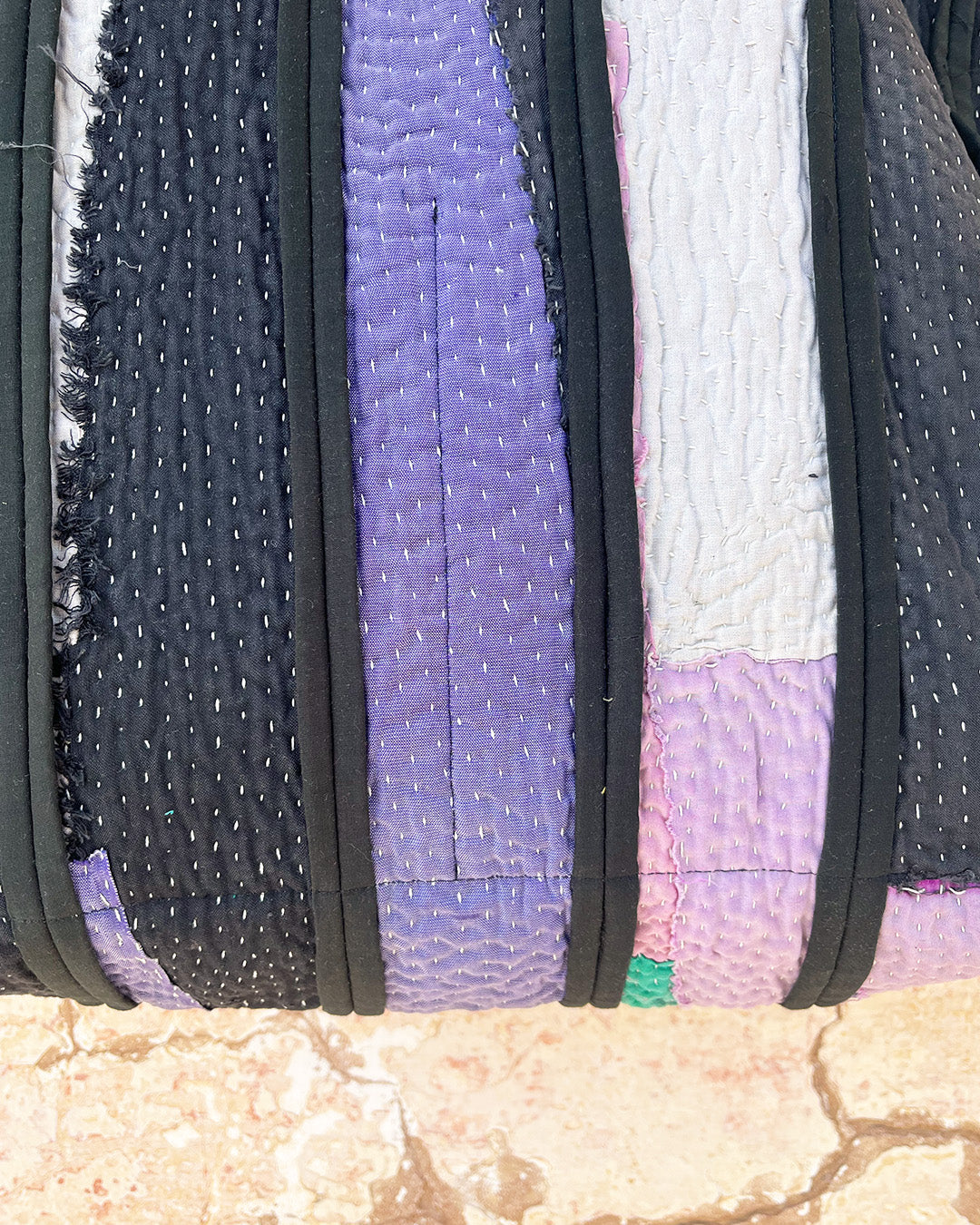 Kantha quilts are crafted from repurposed saris and fabrics and feature repairs, darning, and patchwork. These unique details not only add character but ensure durable, one-of-a-kind garments with a rich up-cycling heritage. We embrace the distressed patches alongside the intricate stitch work in the most unlikely colours.