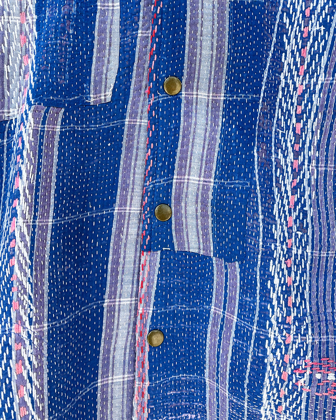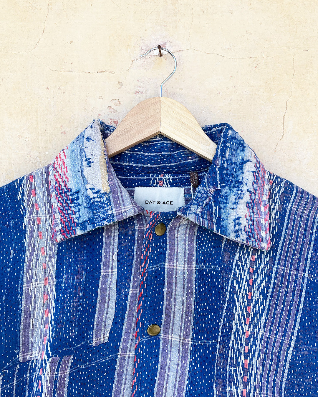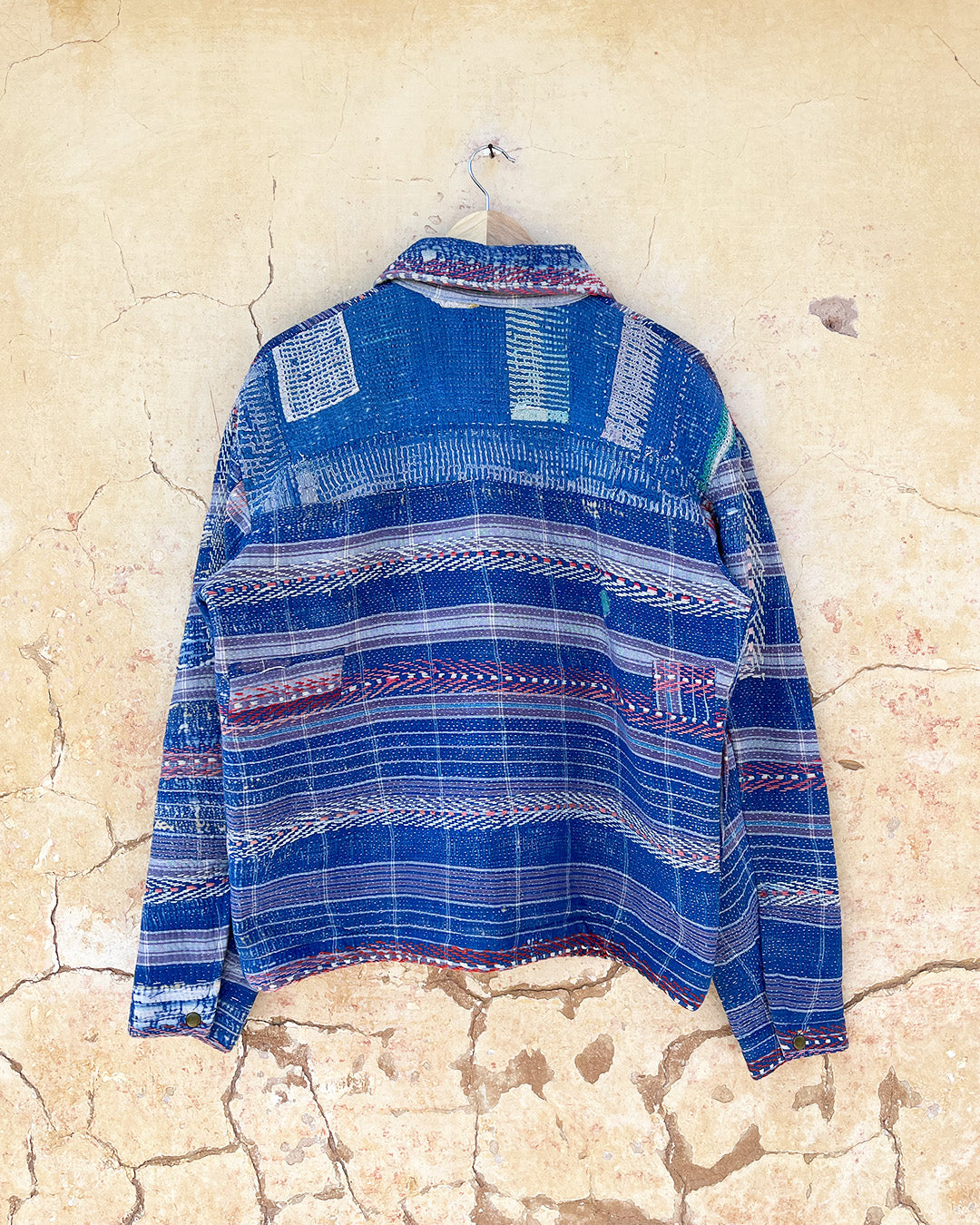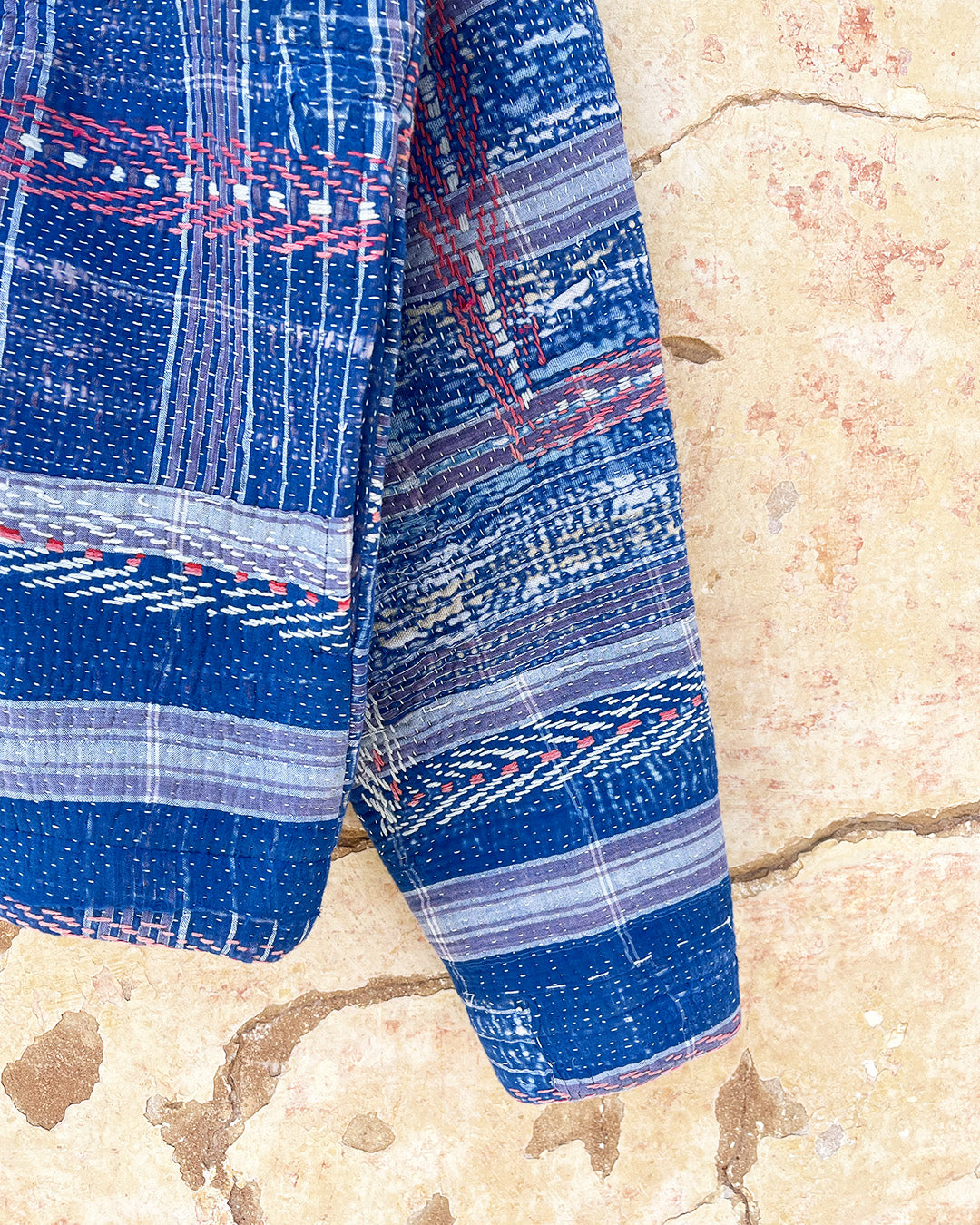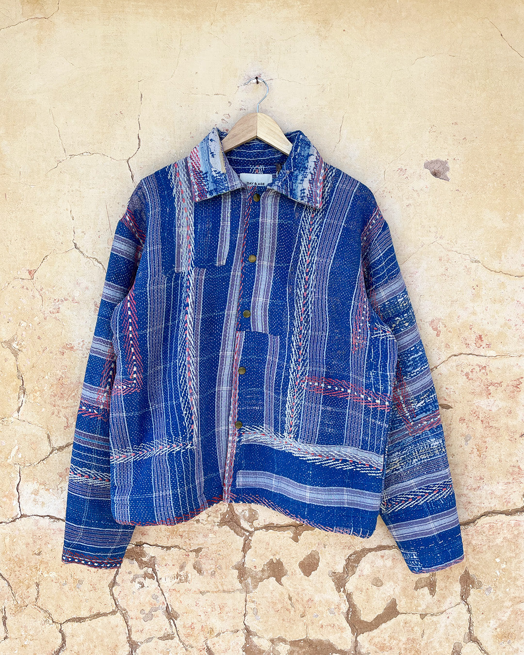 Kantha quilts are crafted from repurposed saris and fabrics and feature repairs, darning, and patchwork. These unique details not only add character but ensure durable, one-of-a-kind garments with a rich up-cycling heritage. We embrace the distressed patches alongside the intricate stitch work in the most unlikely colours.