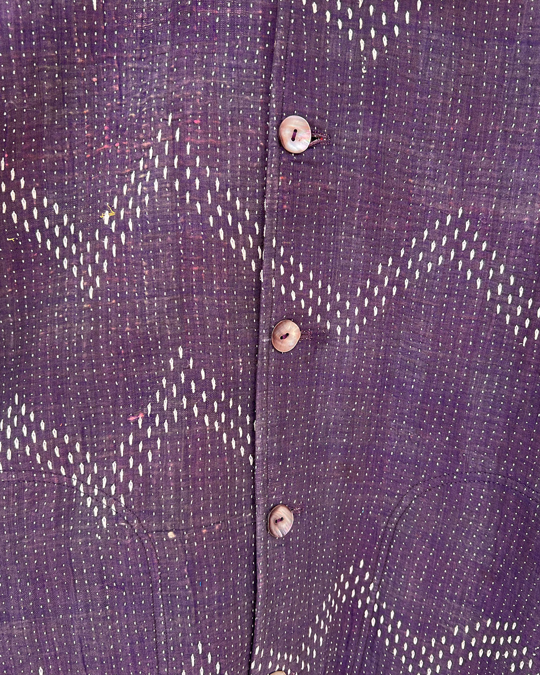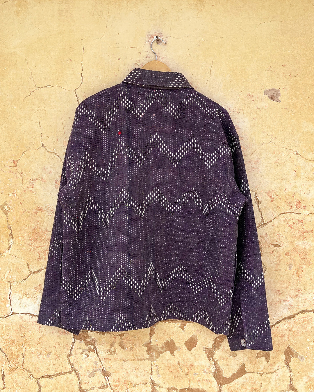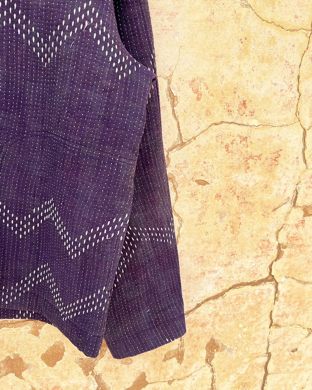 Kantha quilts are crafted from repurposed saris and fabrics and feature repairs, darning, and patchwork. These unique details not only add character but ensure durable, one-of-a-kind garments with a rich up-cycling heritage. We embrace the distressed patches alongside the intricate stitch work in the most unlikely colours.