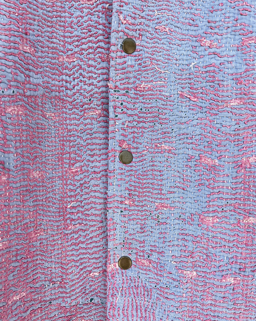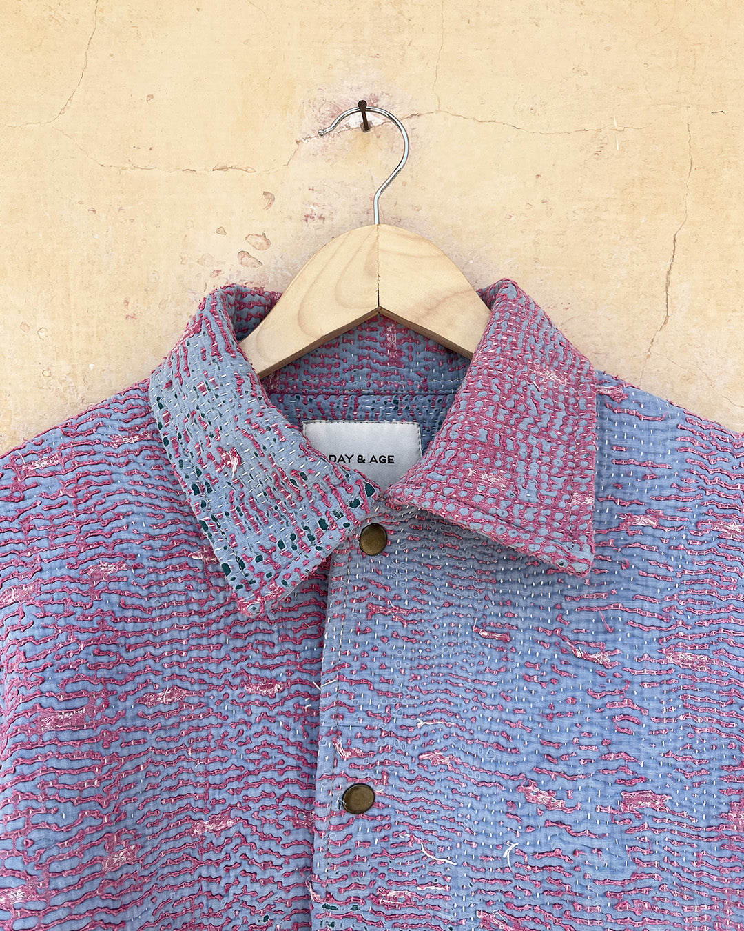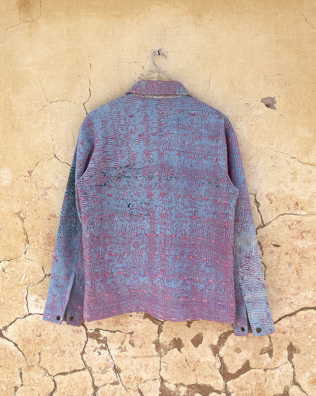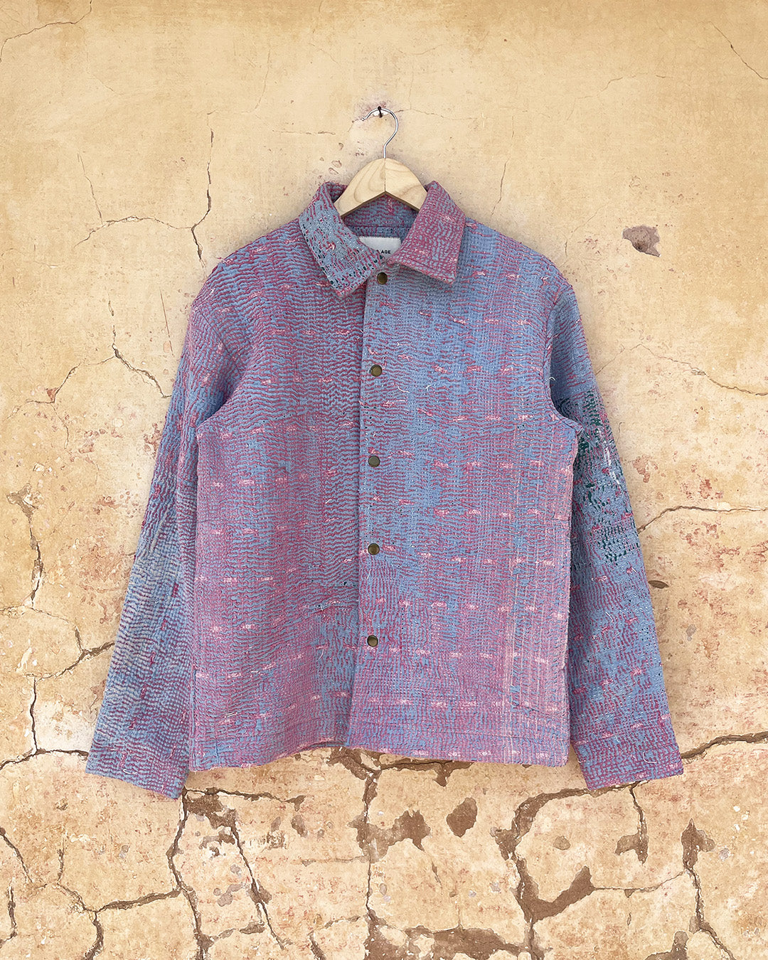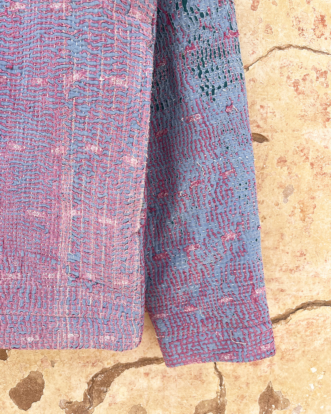 Kantha quilts are crafted from repurposed saris and fabrics and feature repairs, darning, and patchwork. These unique details not only add character but ensure durable, one-of-a-kind garments with a rich up-cycling heritage. We embrace the distressed patches alongside the intricate stitch work in the most unlikely colours.