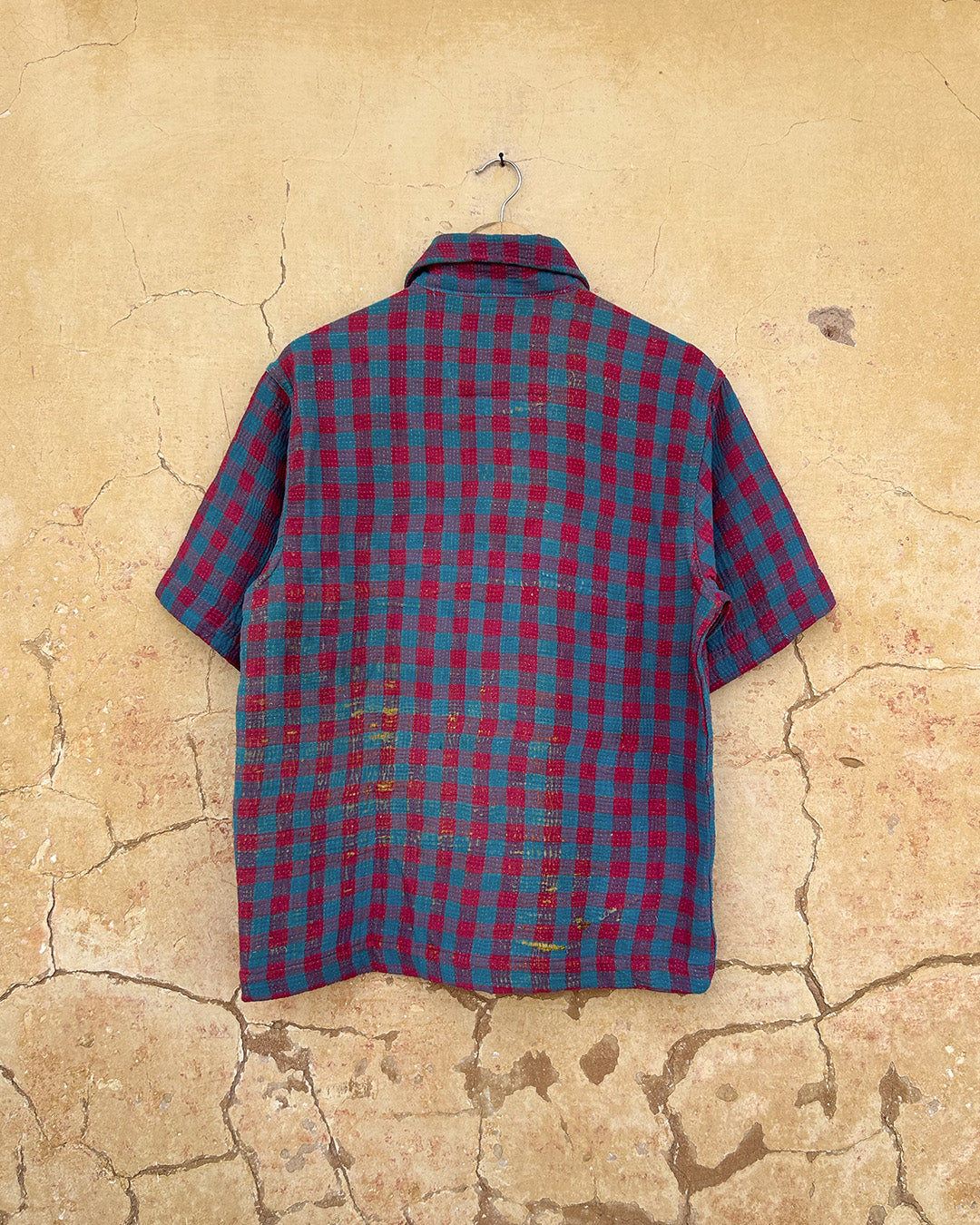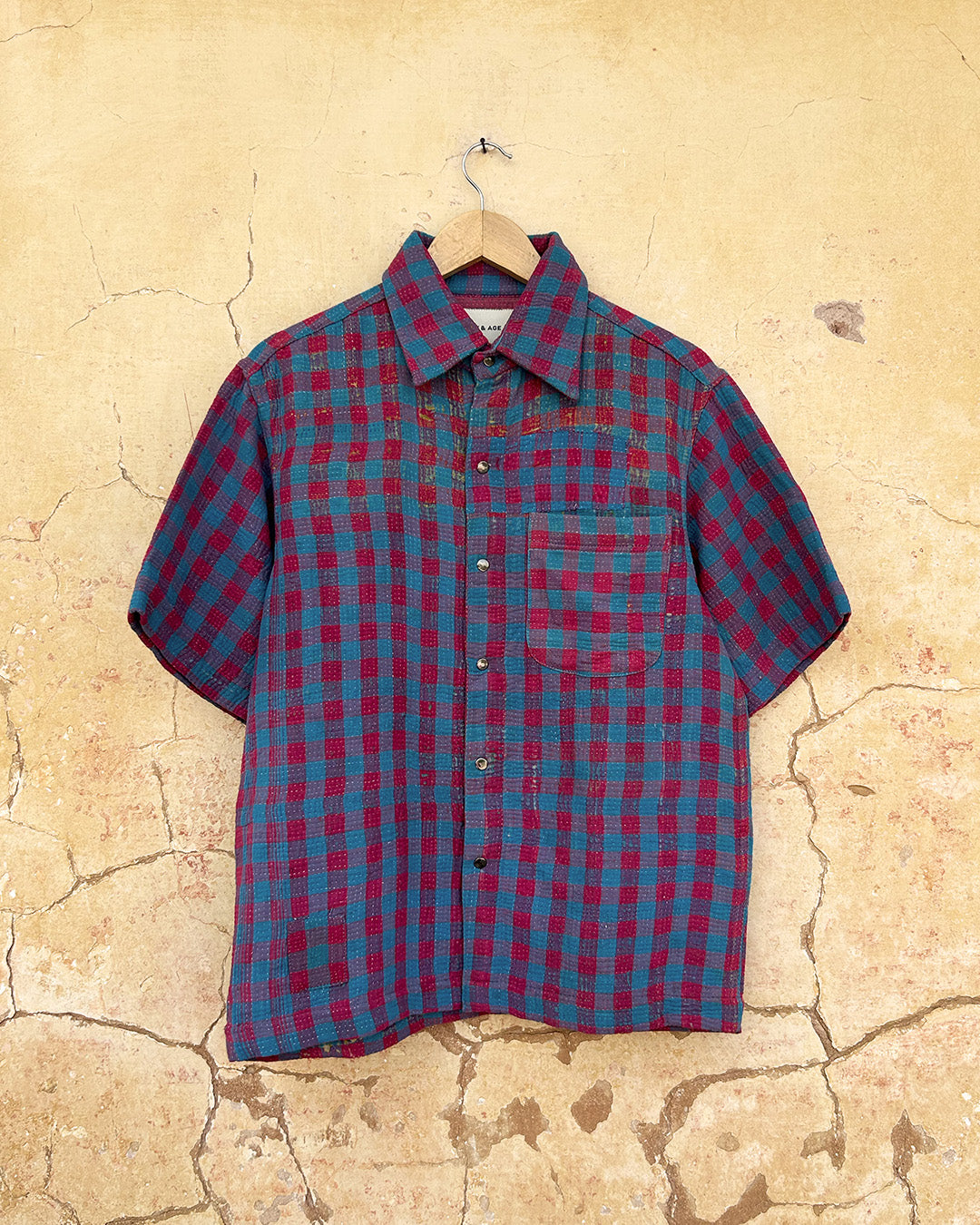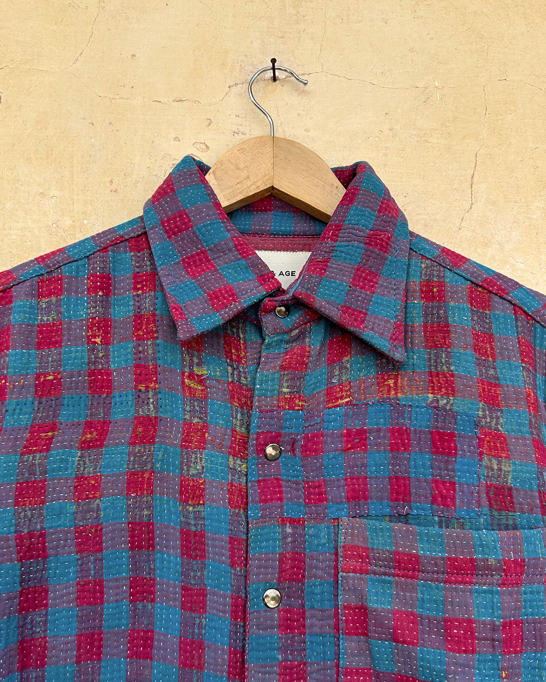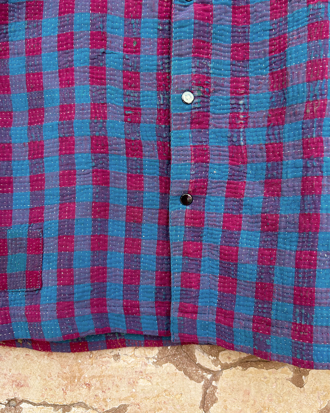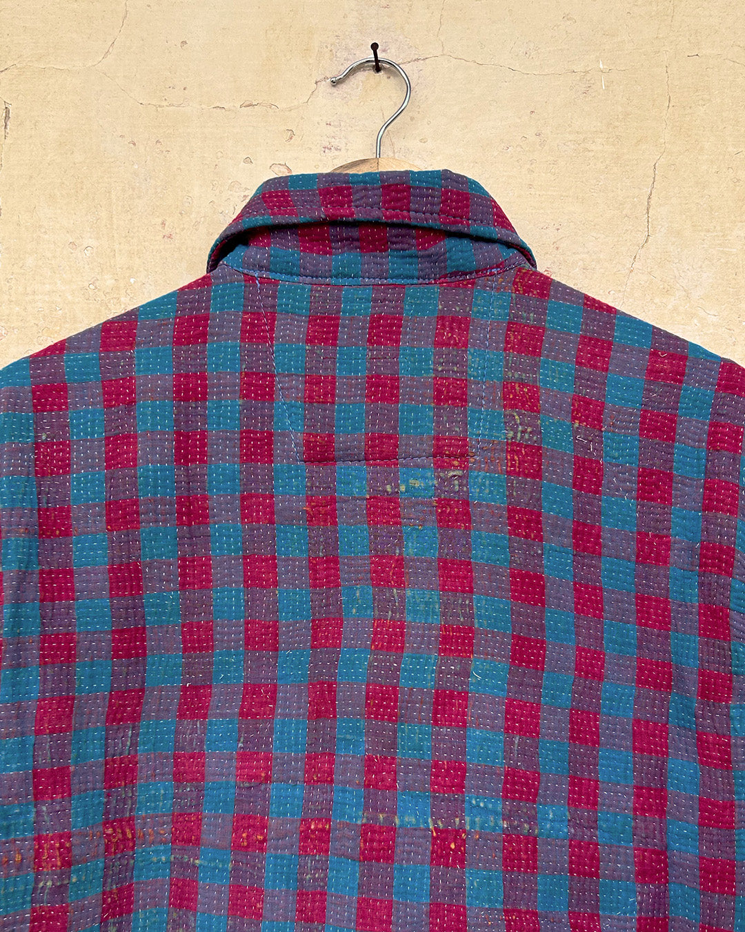 Kantha quilts are crafted from repurposed saris and fabrics and feature repairs, darning, and patchwork. These unique details not only add character but ensure durable, one-of-a-kind garments with a rich up-cycling heritage. We embrace the distressed patches alongside the intricate stitch work in the most unlikely colours.