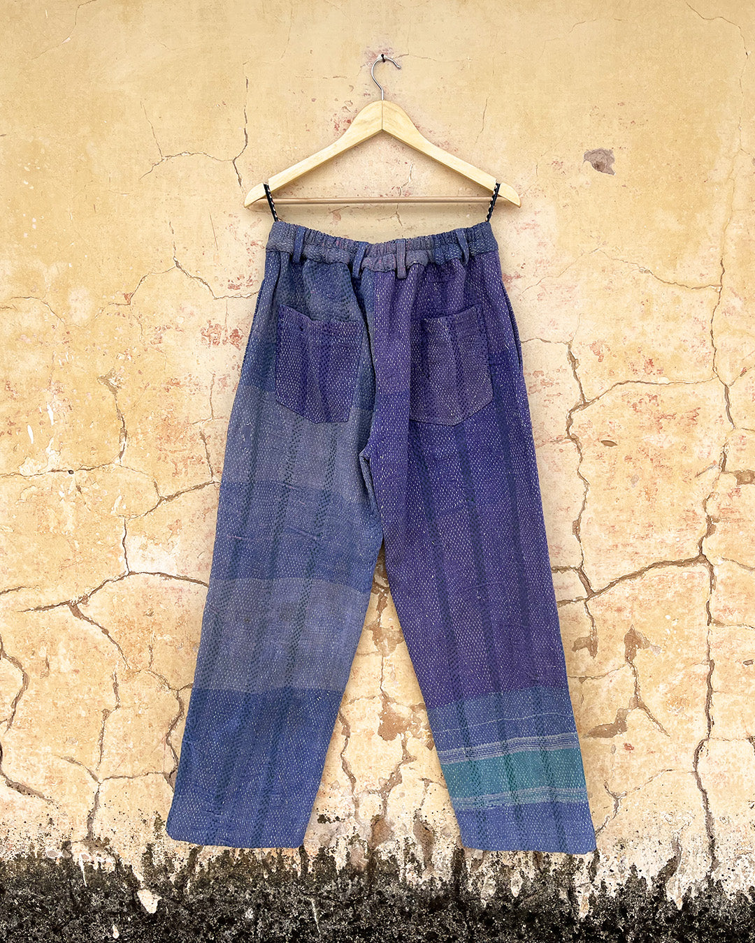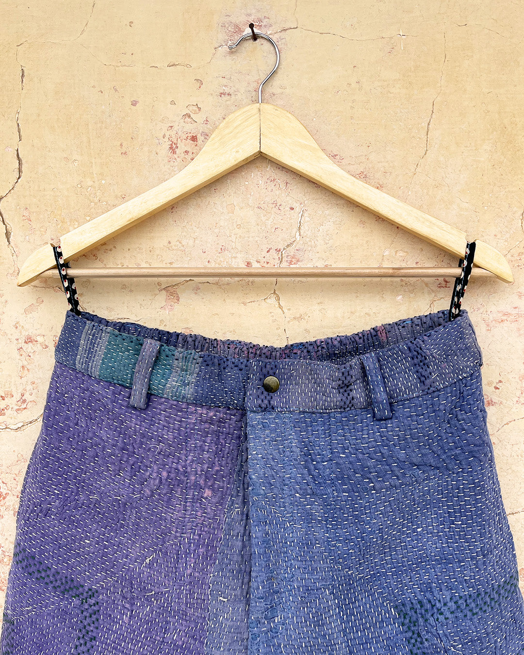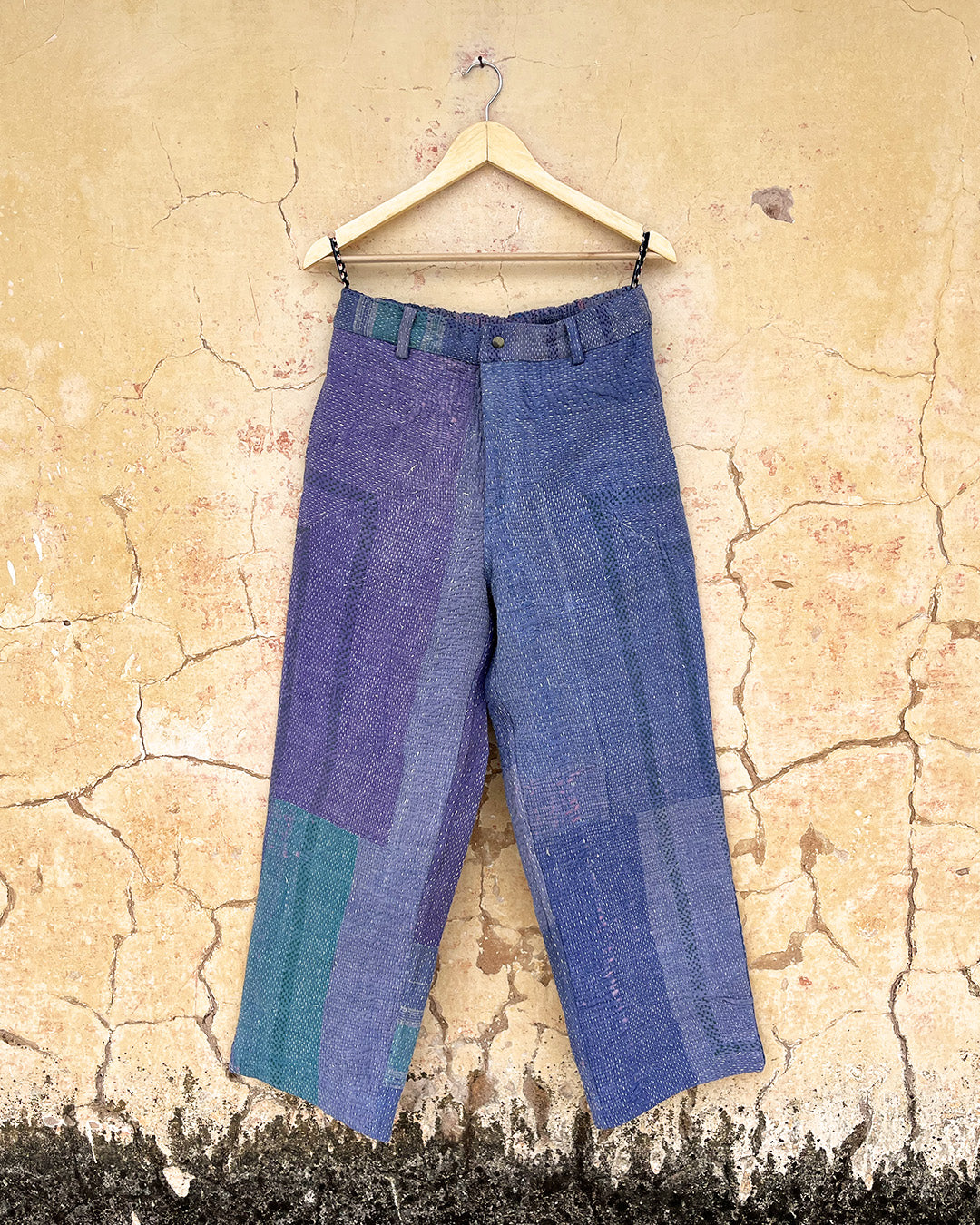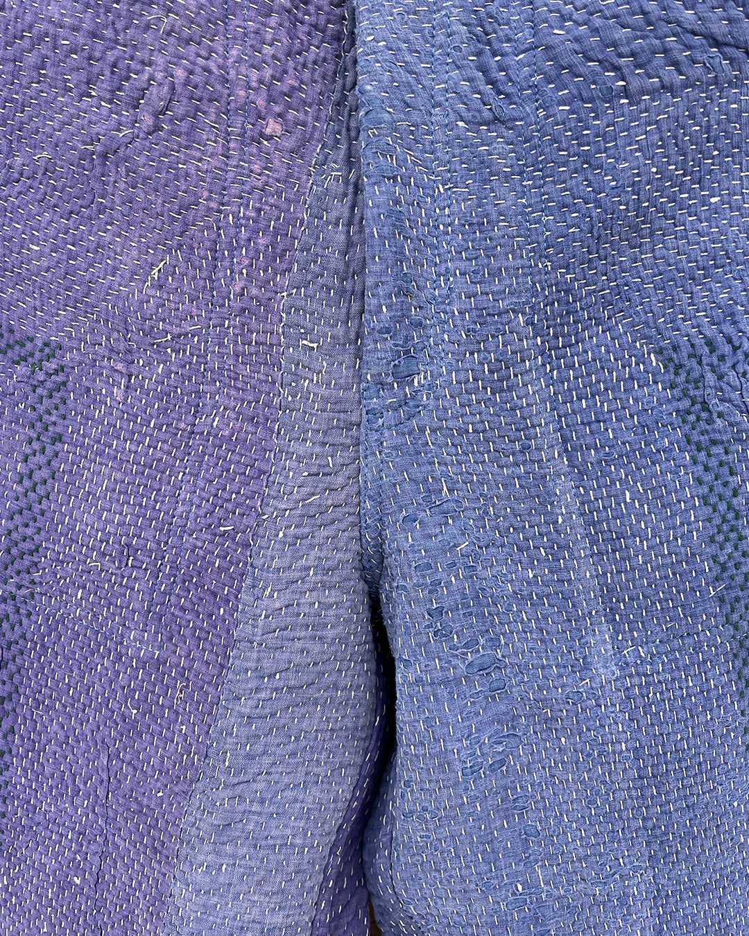 Kantha quilts are crafted from repurposed saris and fabrics and feature repairs, darning, and patchwork. These unique details not only add character but ensure durable, one-of-a-kind garments with a rich up-cycling heritage. We embrace the distressed patches alongside the intricate stitch work in the most unlikely colours.