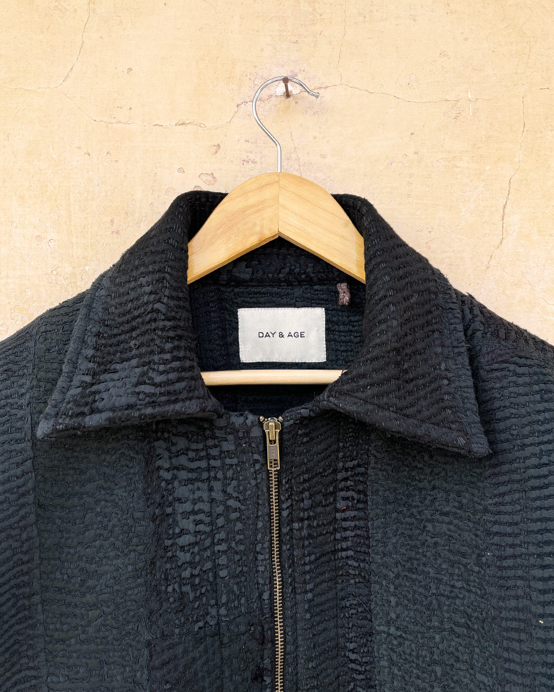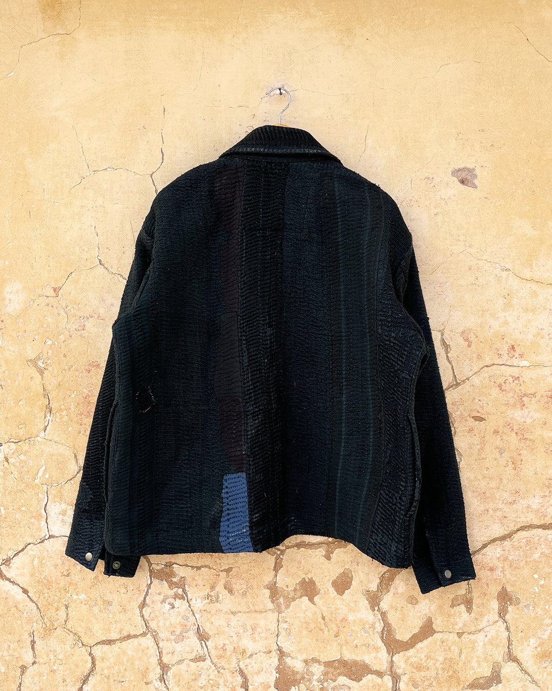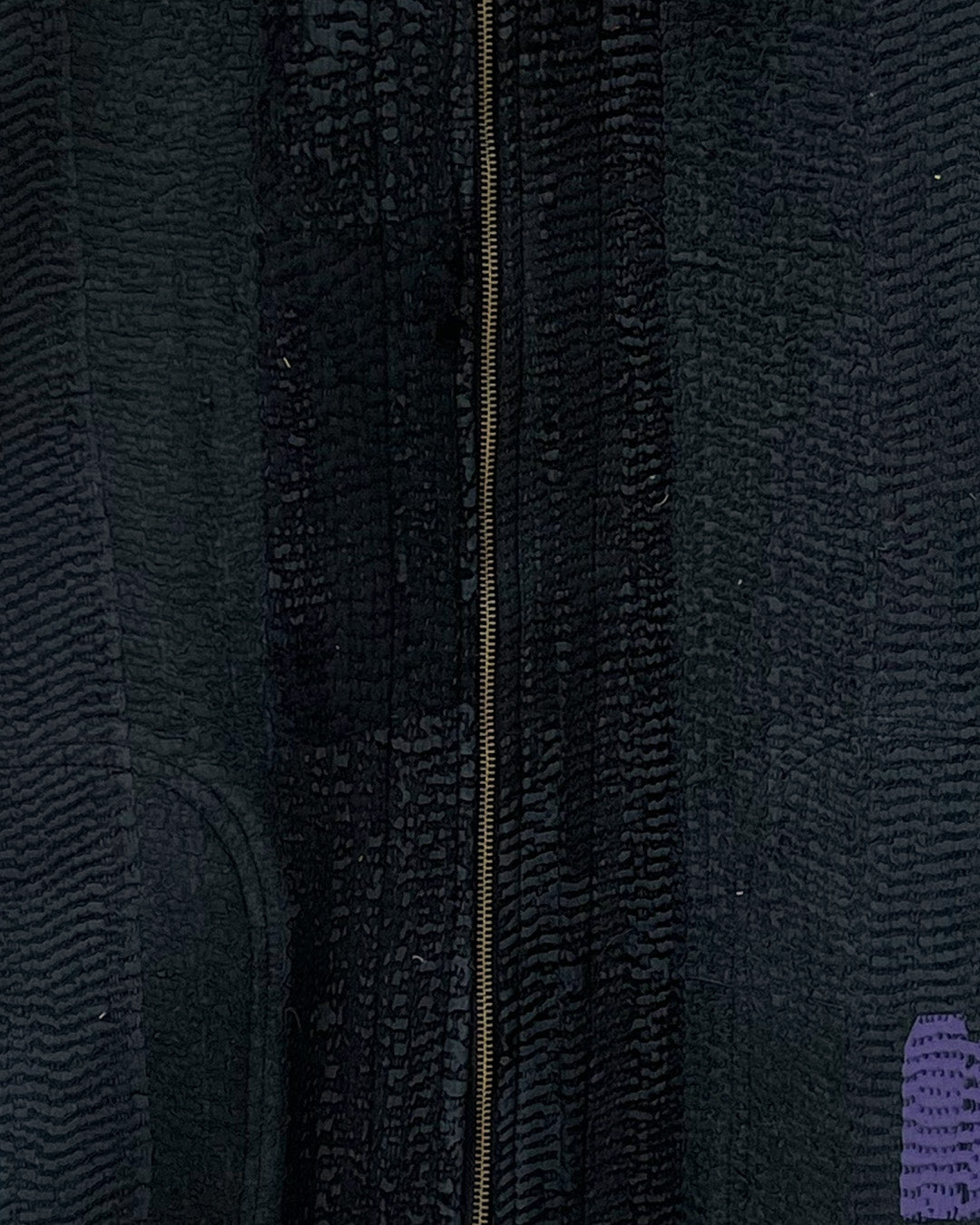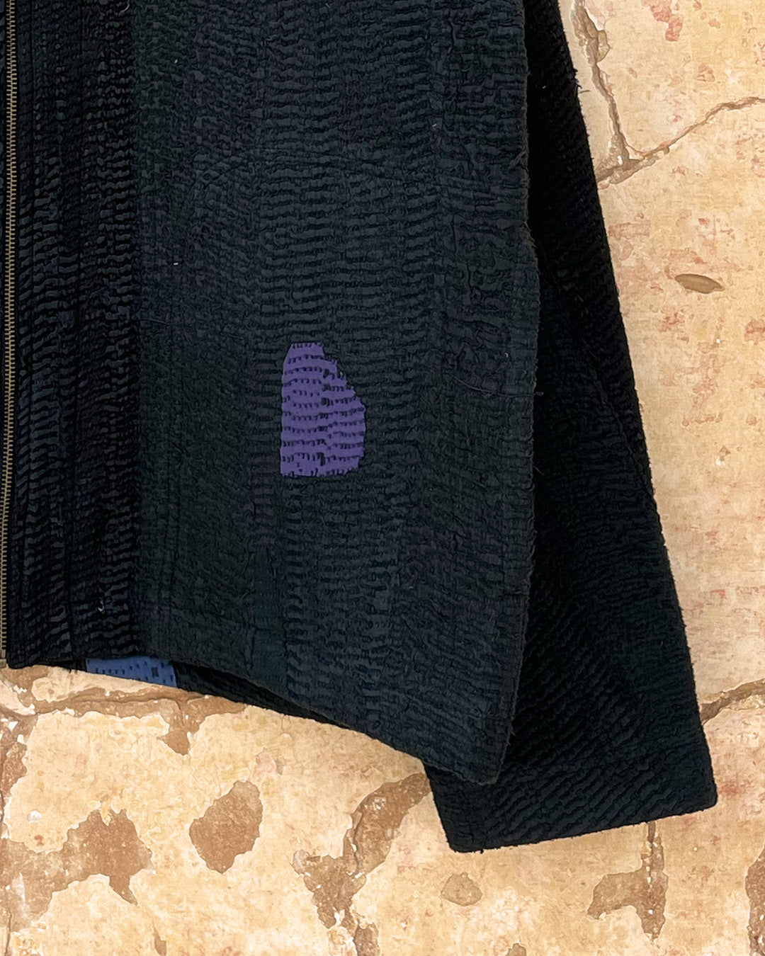 Kantha quilts are crafted from repurposed saris and fabrics and feature repairs, darning, and patchwork. These unique details not only add character but ensure durable, one-of-a-kind garments with a rich up-cycling heritage. We embrace the distressed patches alongside the intricate stitch work in the most unlikely colours.
