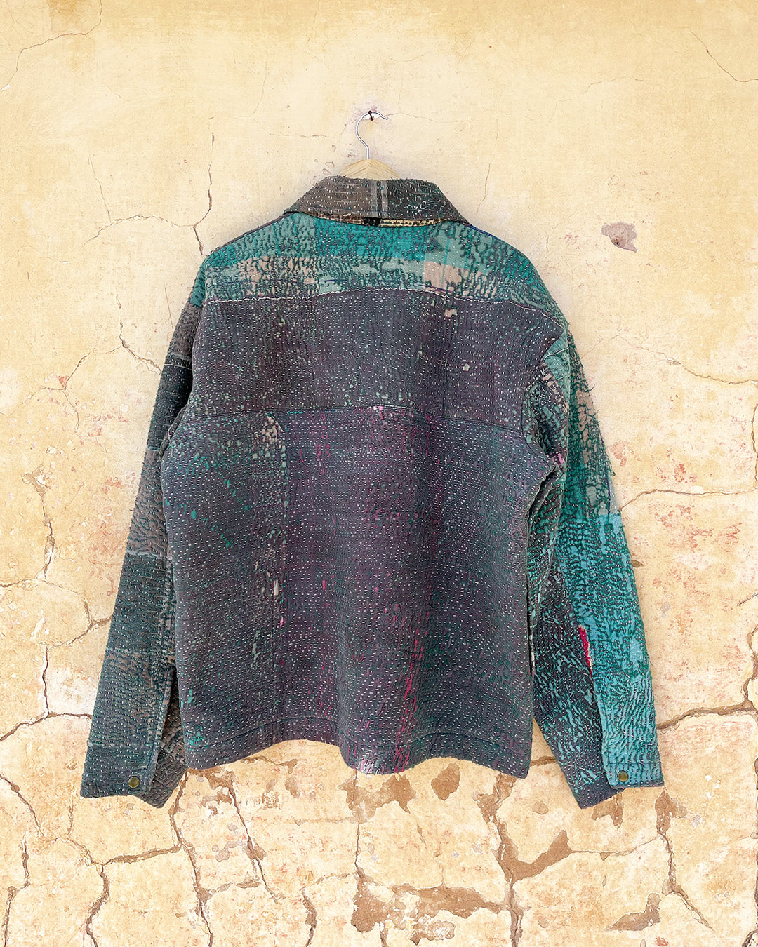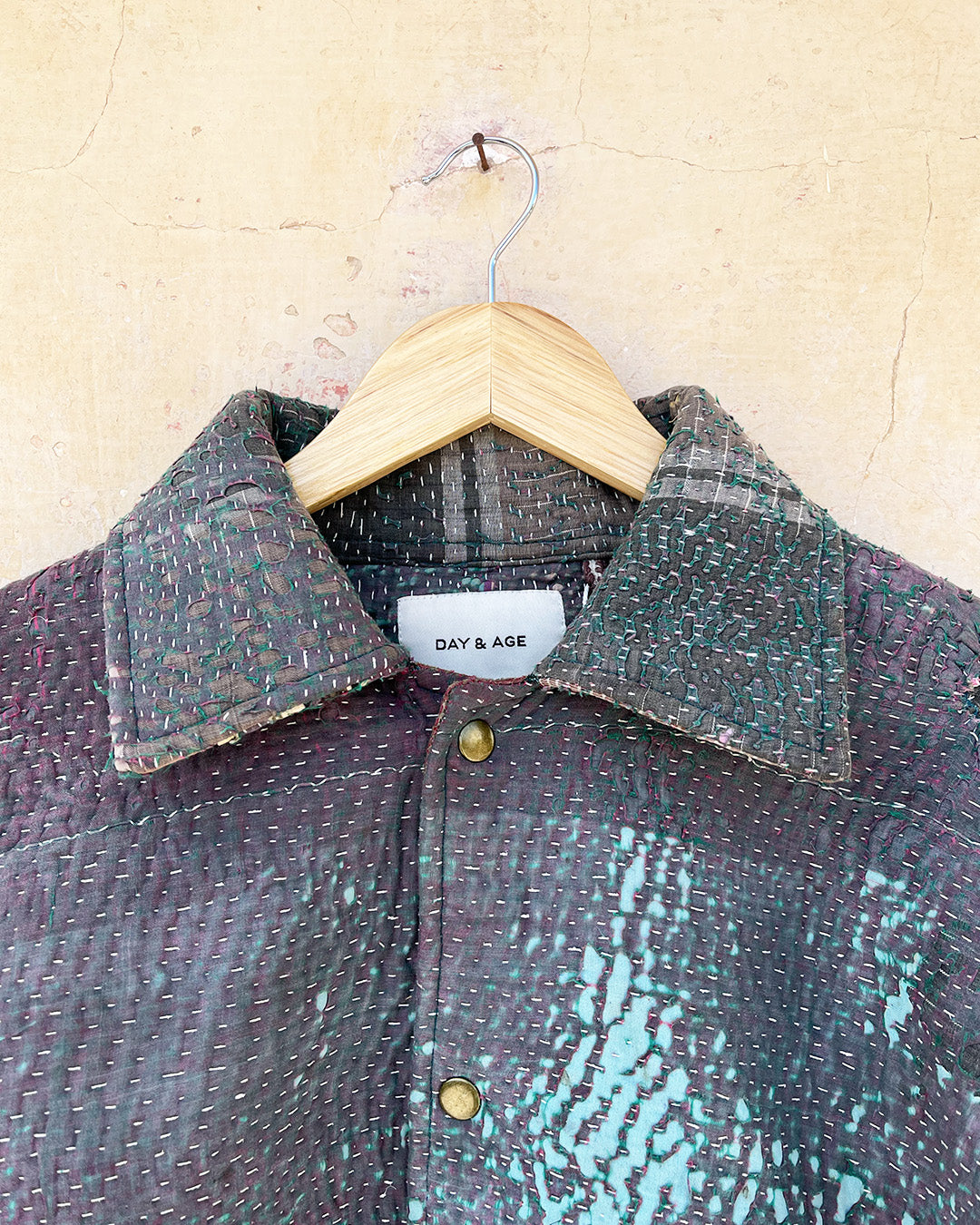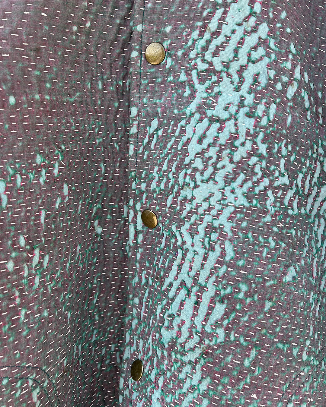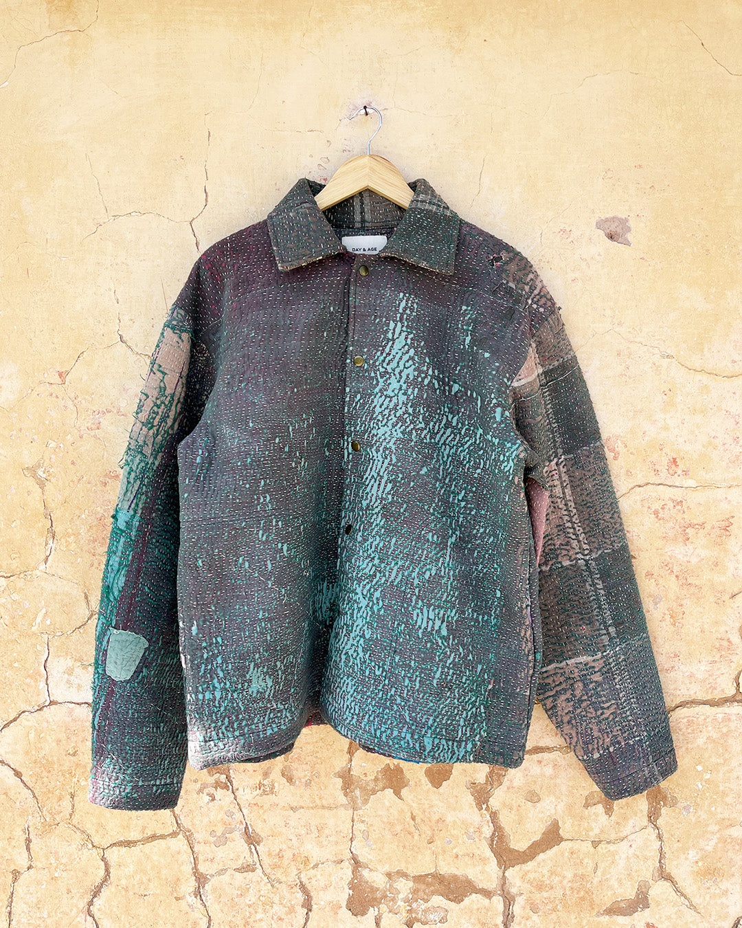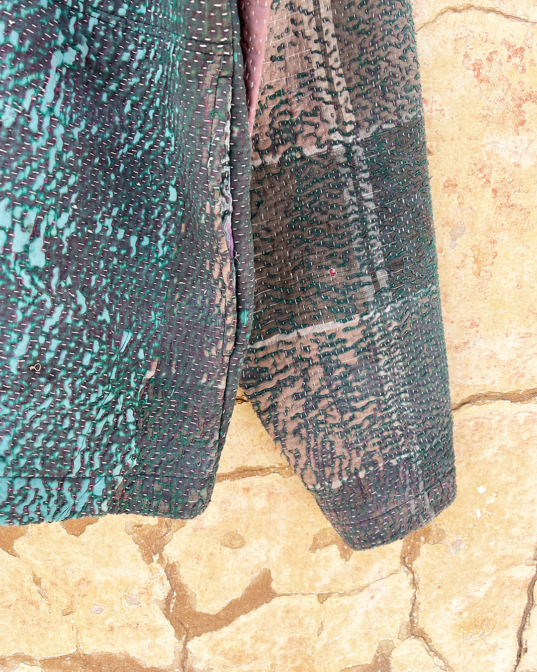Kantha quilts are crafted from repurposed saris and fabrics and feature repairs, darning, and patchwork. These unique details not only add character but ensure durable, one-of-a-kind garments with a rich up-cycling heritage. We embrace the distressed patches alongside the intricate stitch work in the most unlikely colours.