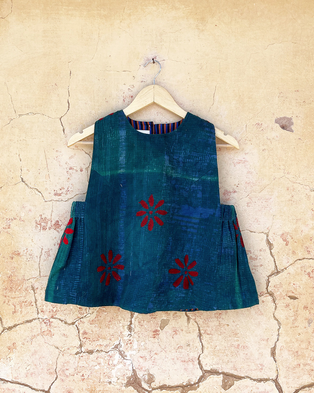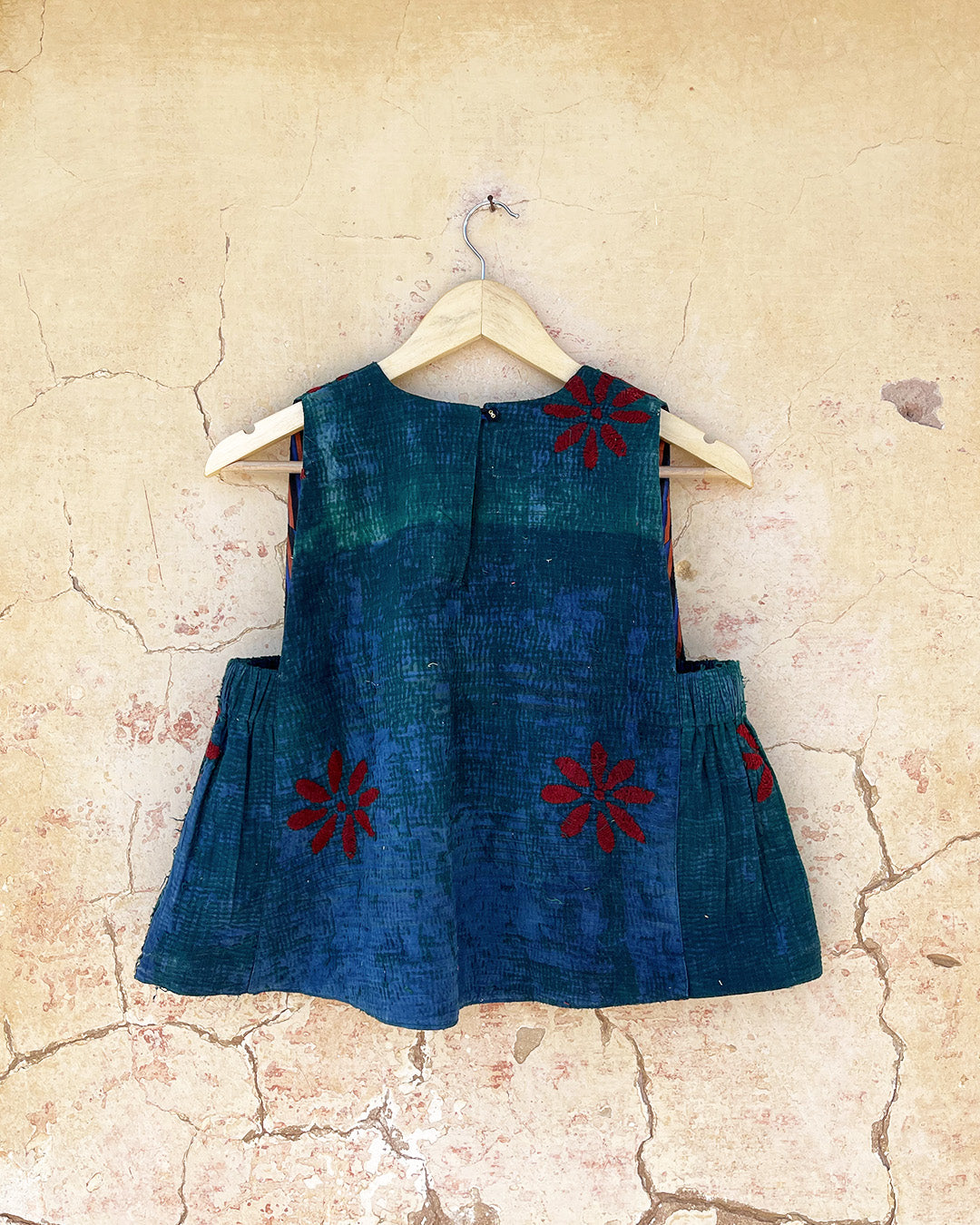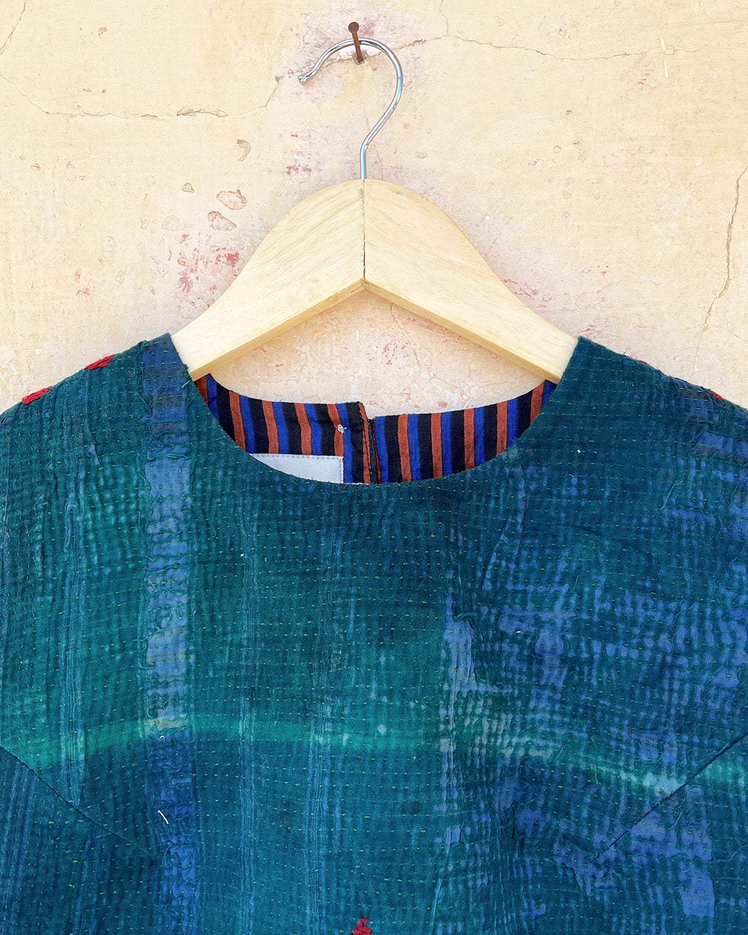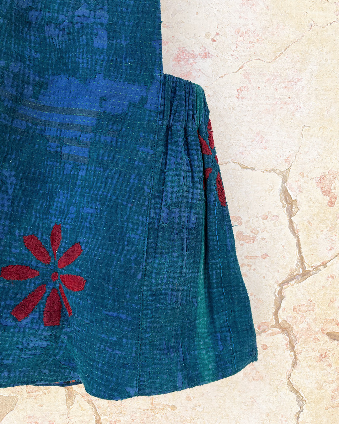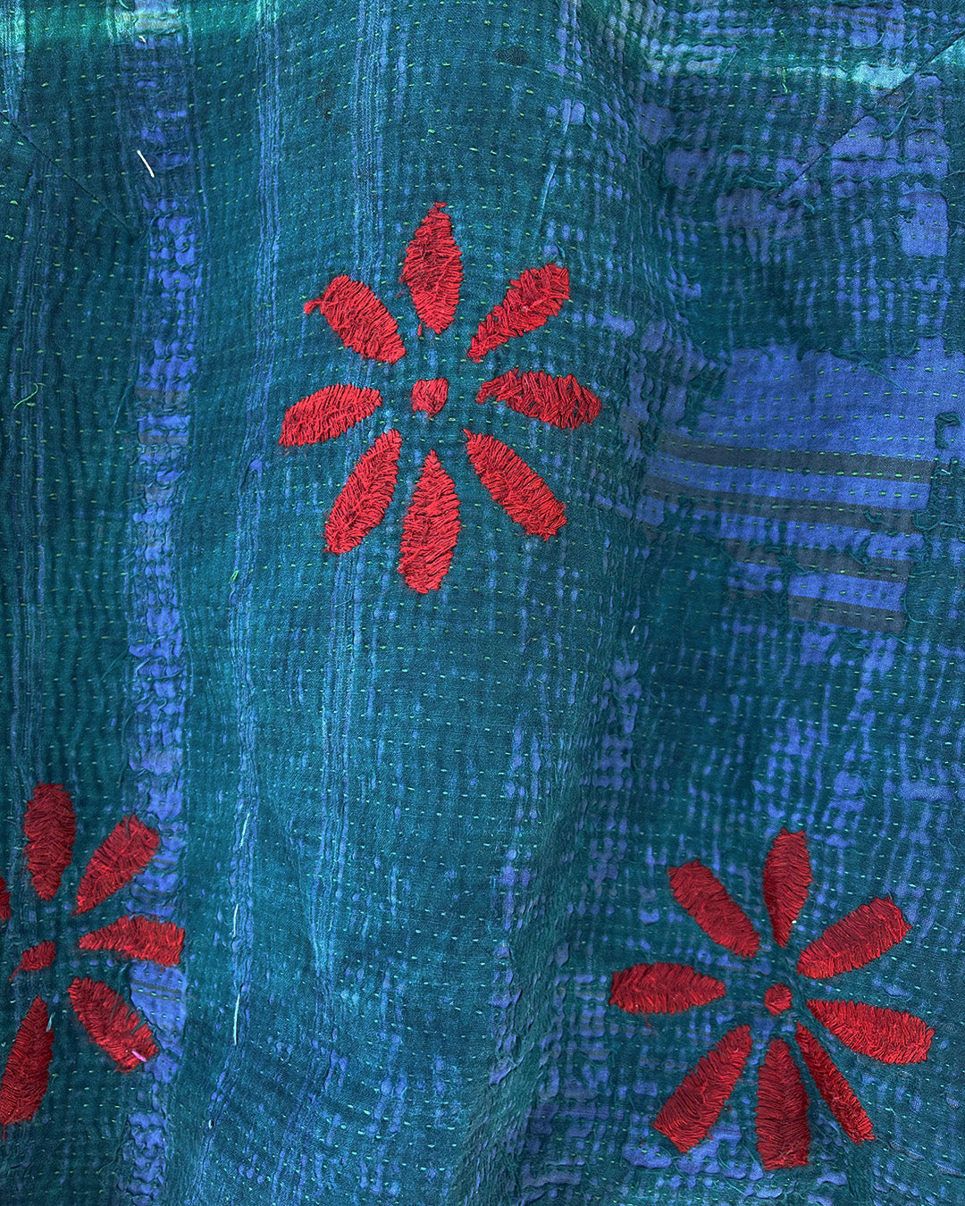 Kantha quilts are crafted from repurposed saris and fabrics and feature repairs, darning, and patchwork. These unique details not only add character but ensure durable, one-of-a-kind garments with a rich up-cycling heritage. We embrace the distressed patches alongside the intricate stitch work in the most unlikely colours.