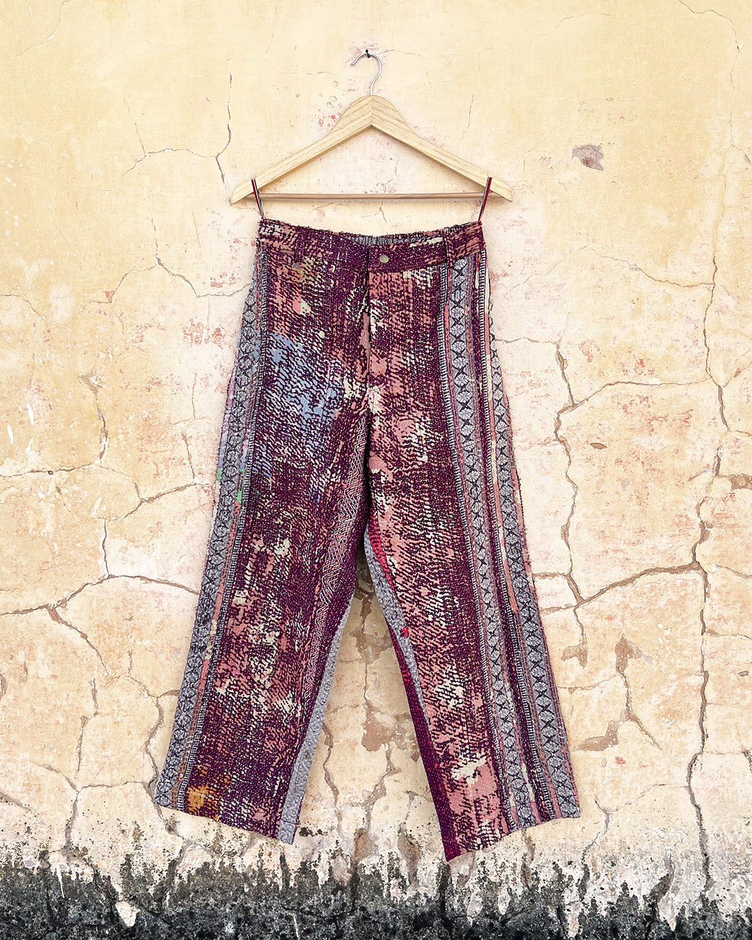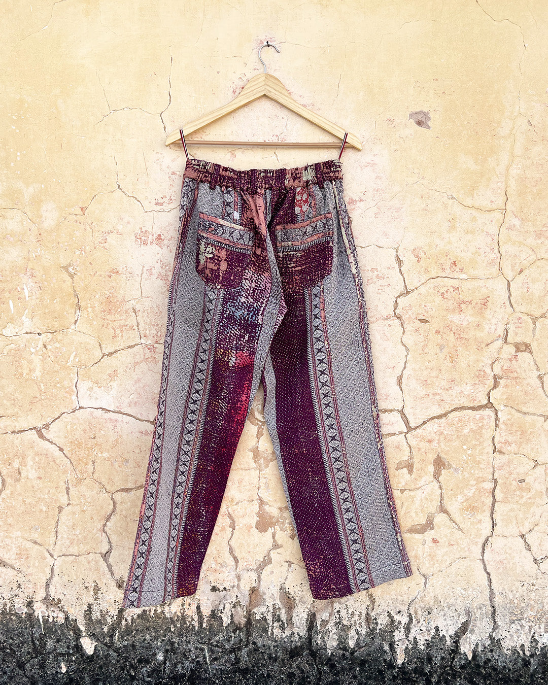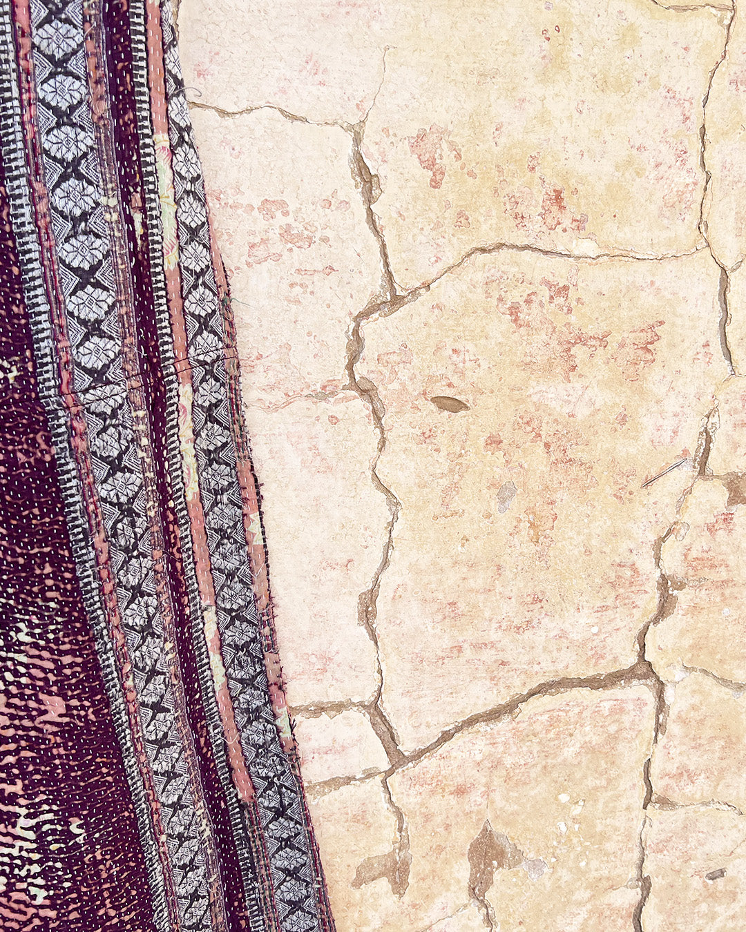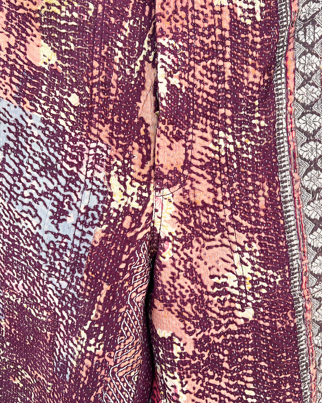 Kantha quilts are crafted from repurposed saris and fabrics and feature repairs, darning, and patchwork. These unique details not only add character but ensure durable, one-of-a-kind garments with a rich up-cycling heritage. We embrace the distressed patches alongside the intricate stitch work in the most unlikely colours.