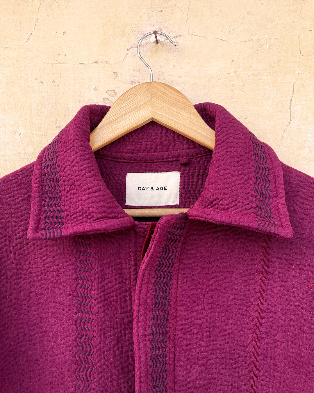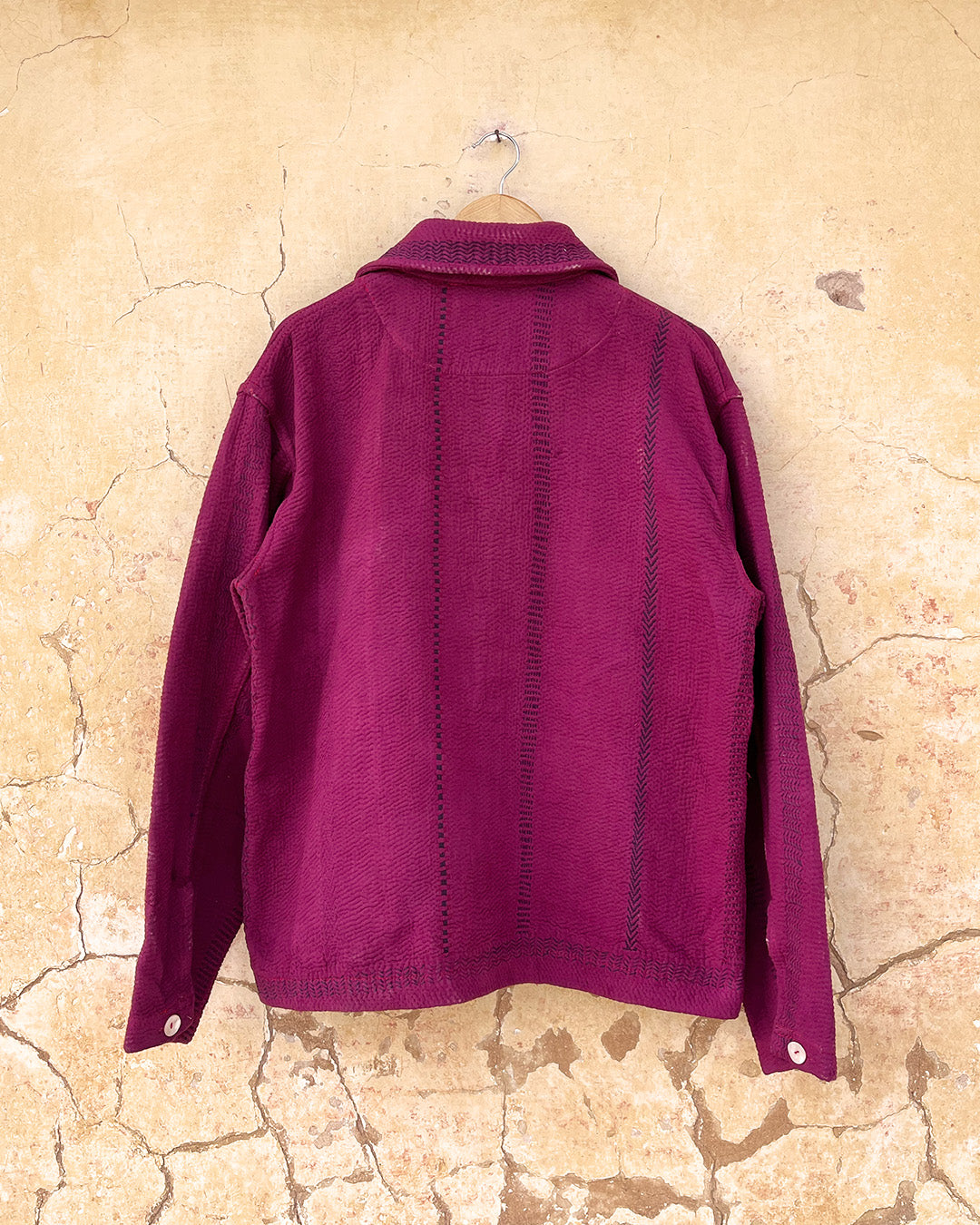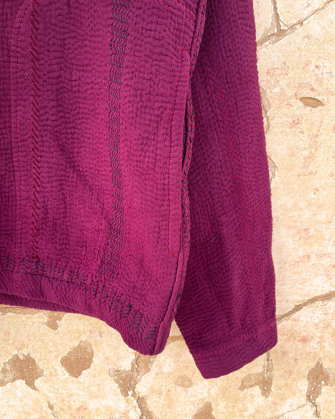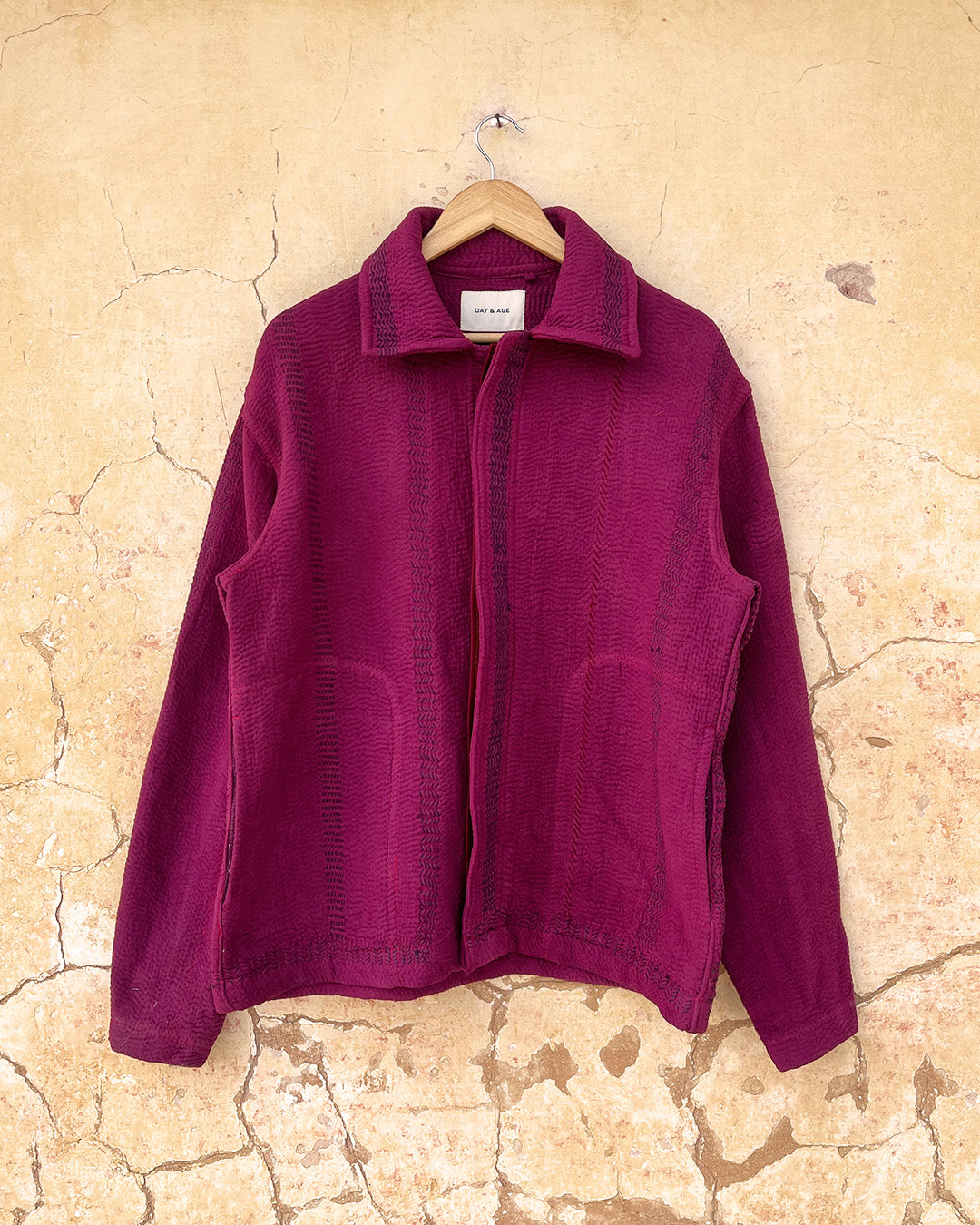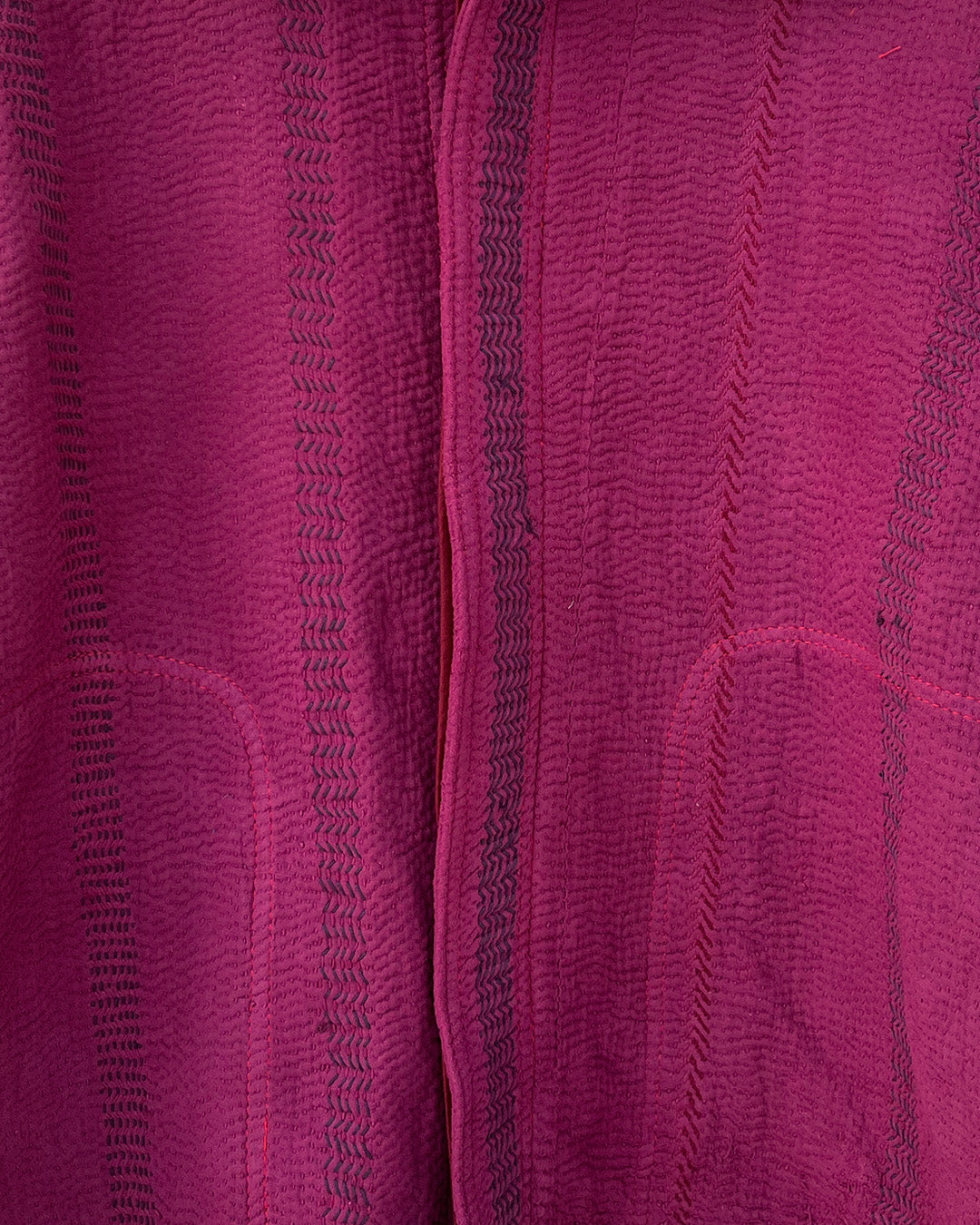 Kantha quilts are crafted from repurposed saris and fabrics and feature repairs, darning, and patchwork. These unique details not only add character but ensure durable, one-of-a-kind garments with a rich up-cycling heritage. We embrace the distressed patches alongside the intricate stitch work in the most unlikely colours.