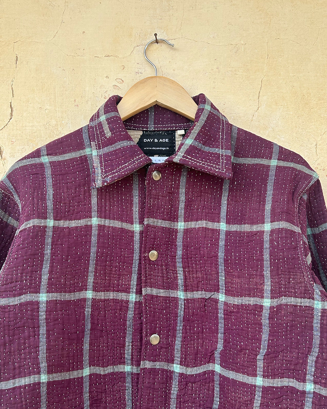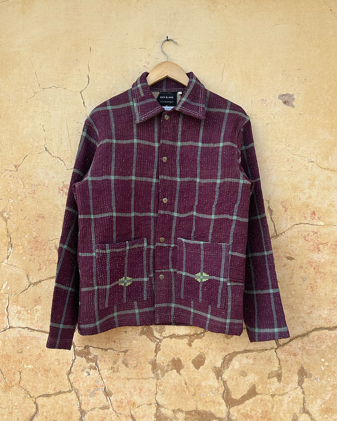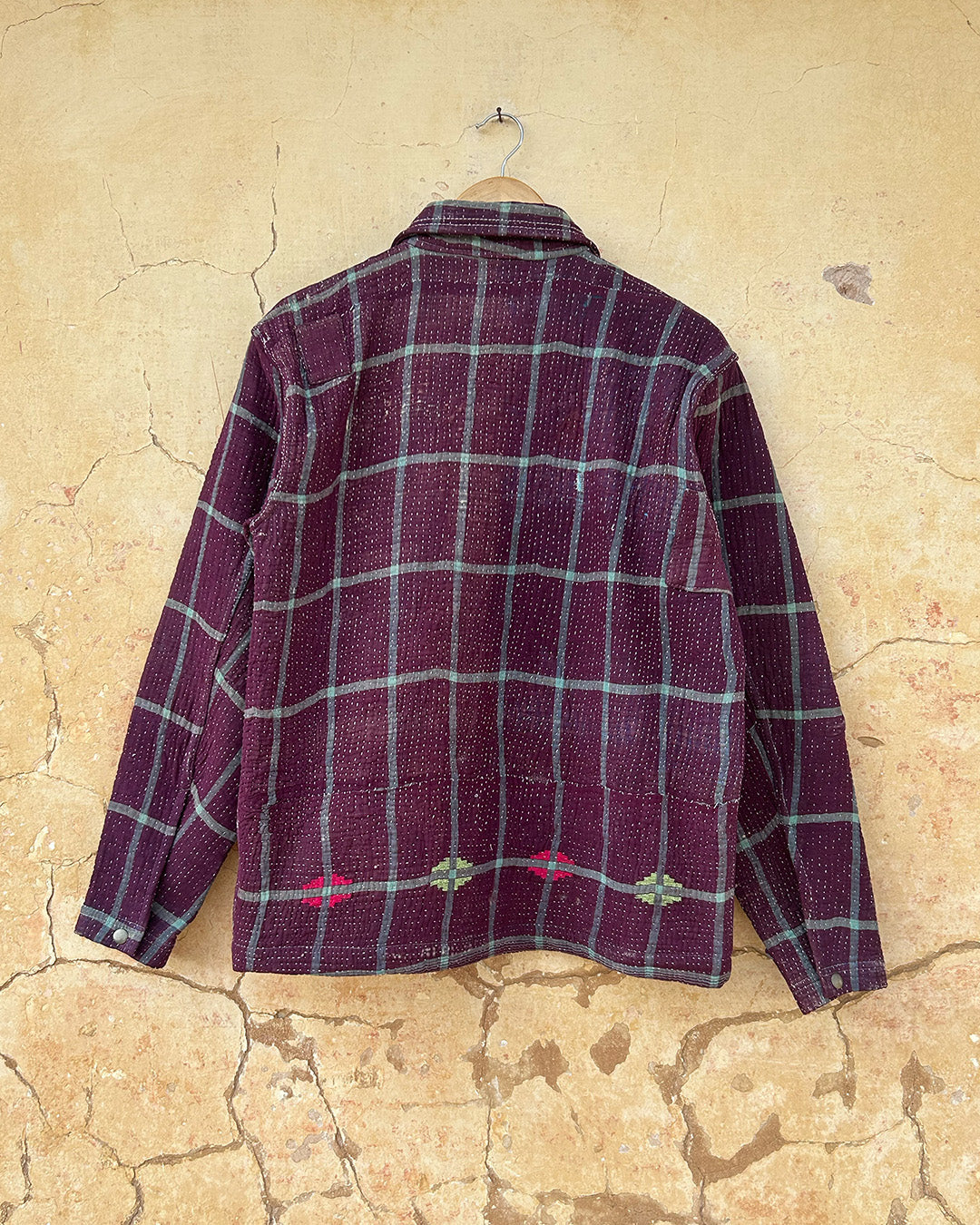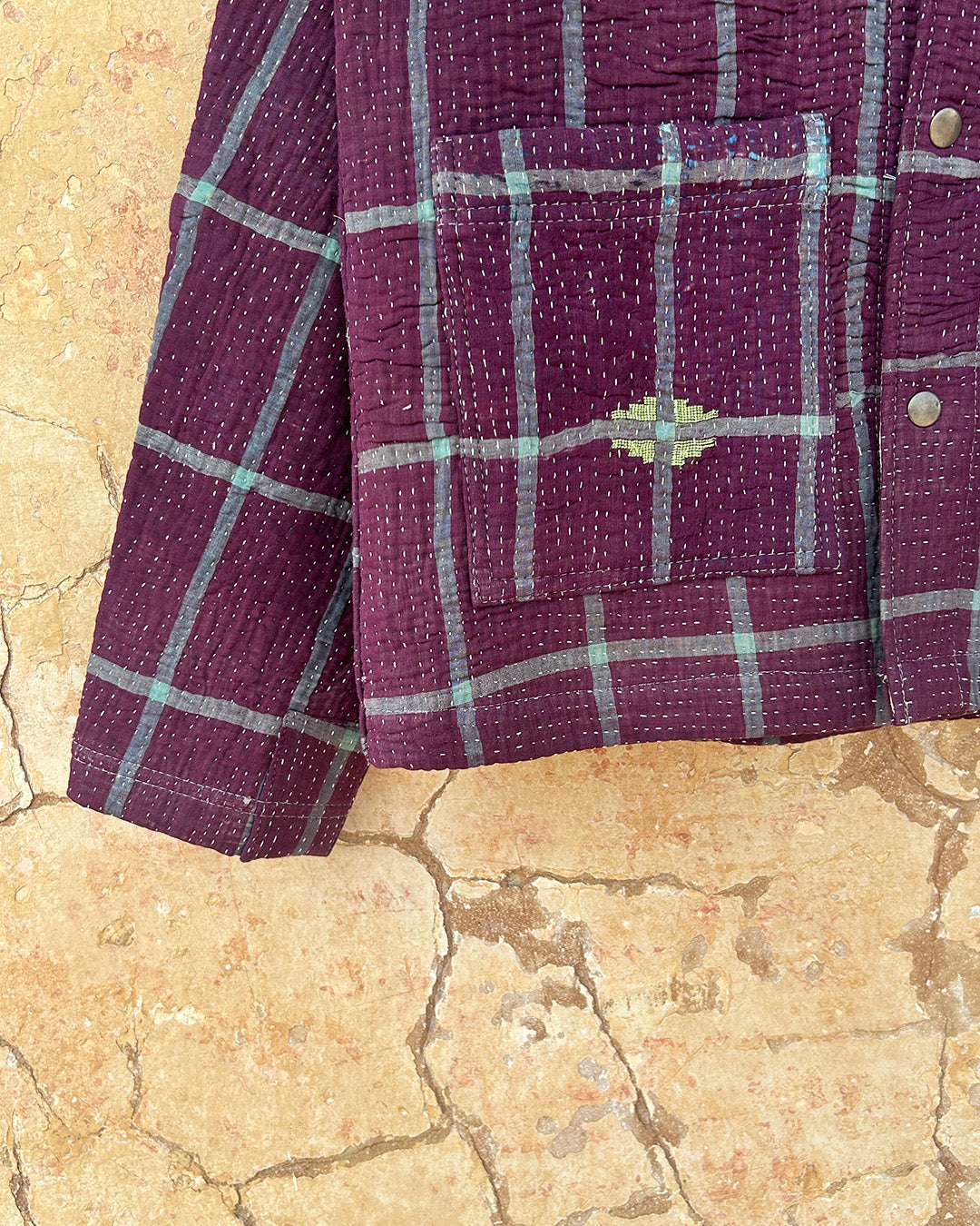 Kantha quilts are crafted from repurposed saris and fabrics and feature repairs, darning, and patchwork. These unique details not only add character but ensure durable, one-of-a-kind garments with a rich up-cycling heritage. We embrace the distressed patches alongside the intricate stitch work in the most unlikely colours.