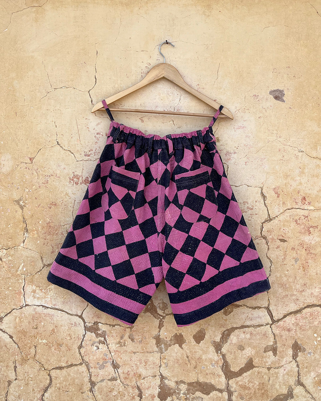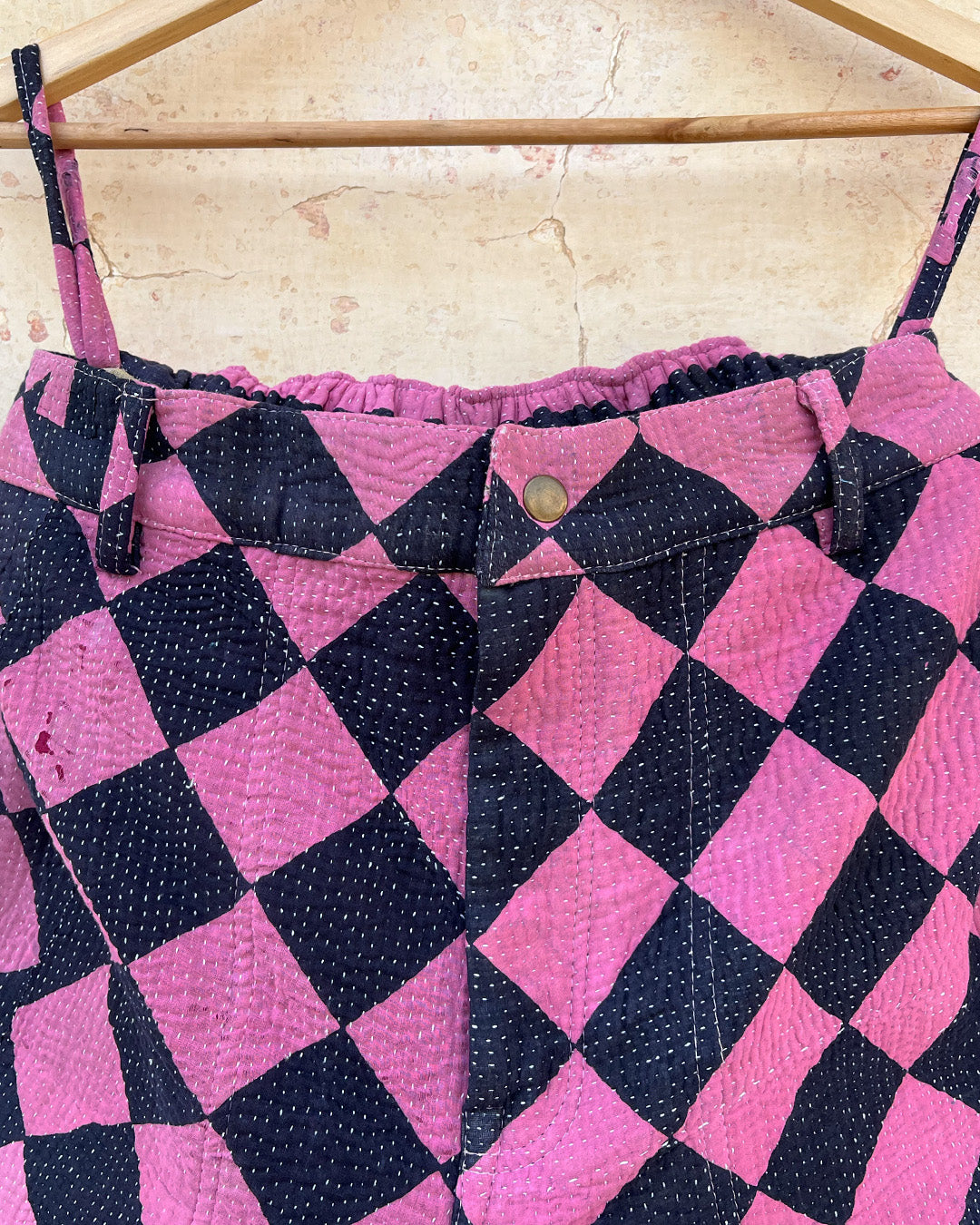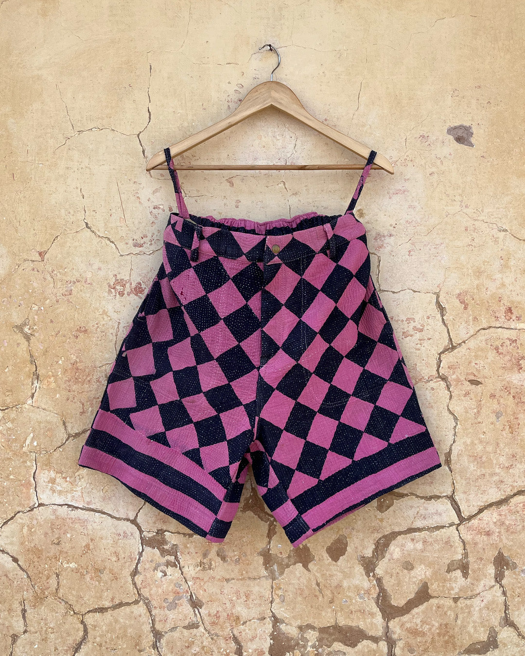 Kantha quilts are crafted from repurposed saris and fabrics and feature repairs, darning, and patchwork. These unique details not only add character but ensure durable, one-of-a-kind garments with a rich up-cycling heritage. We embrace the distressed patches alongside the intricate stitch work in the most unlikely colours.