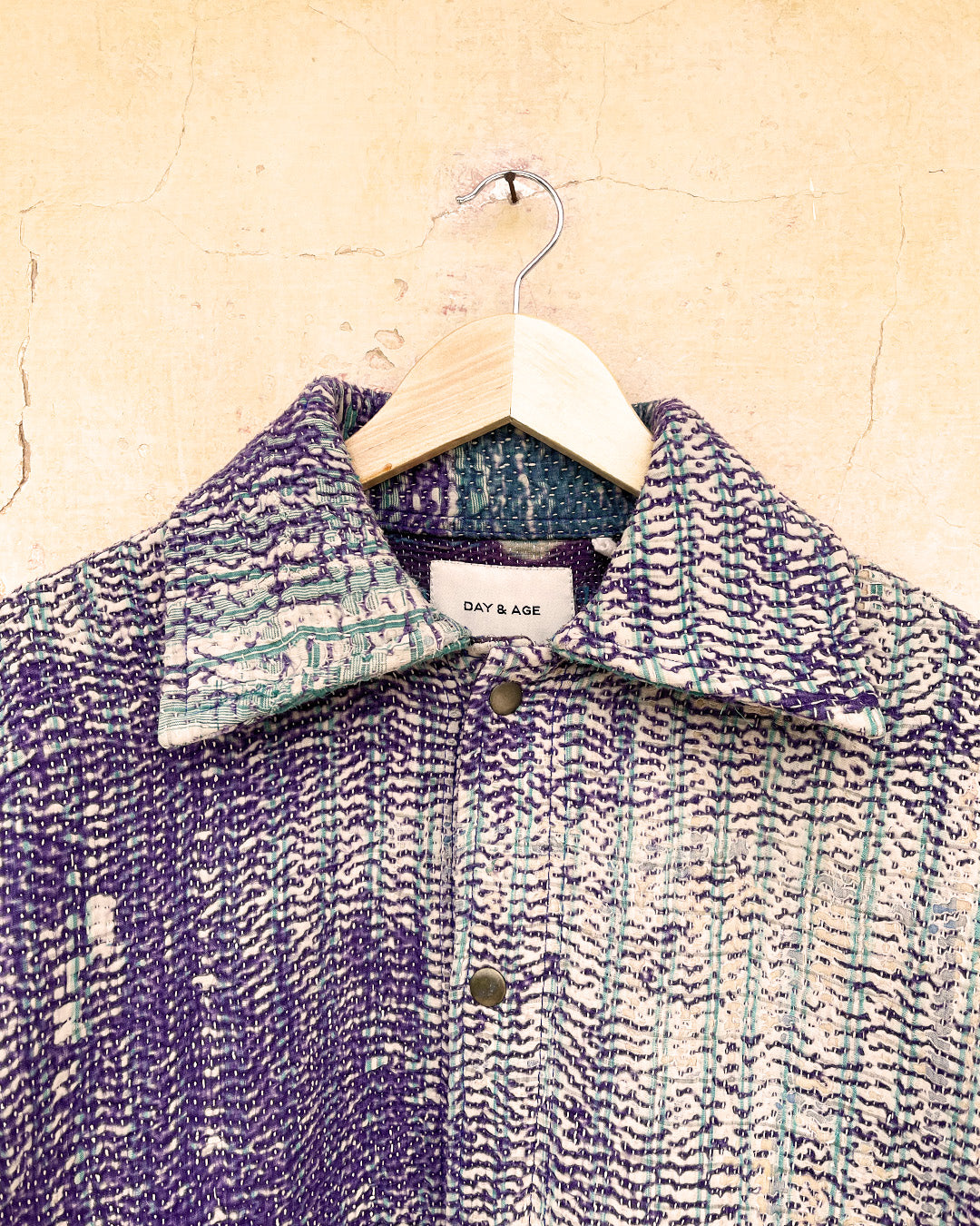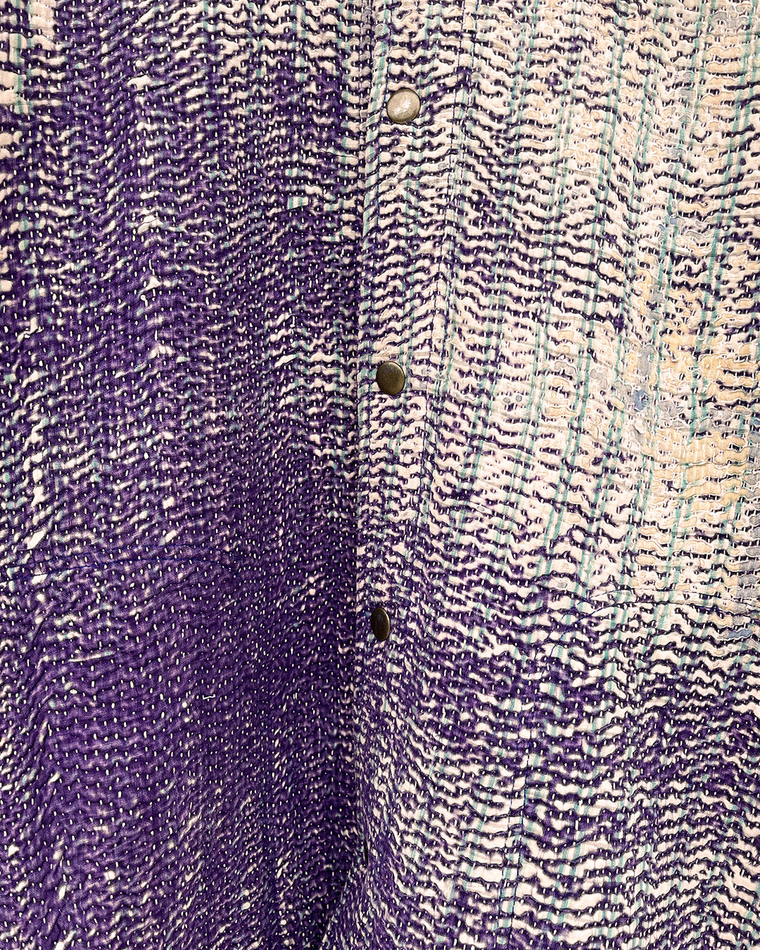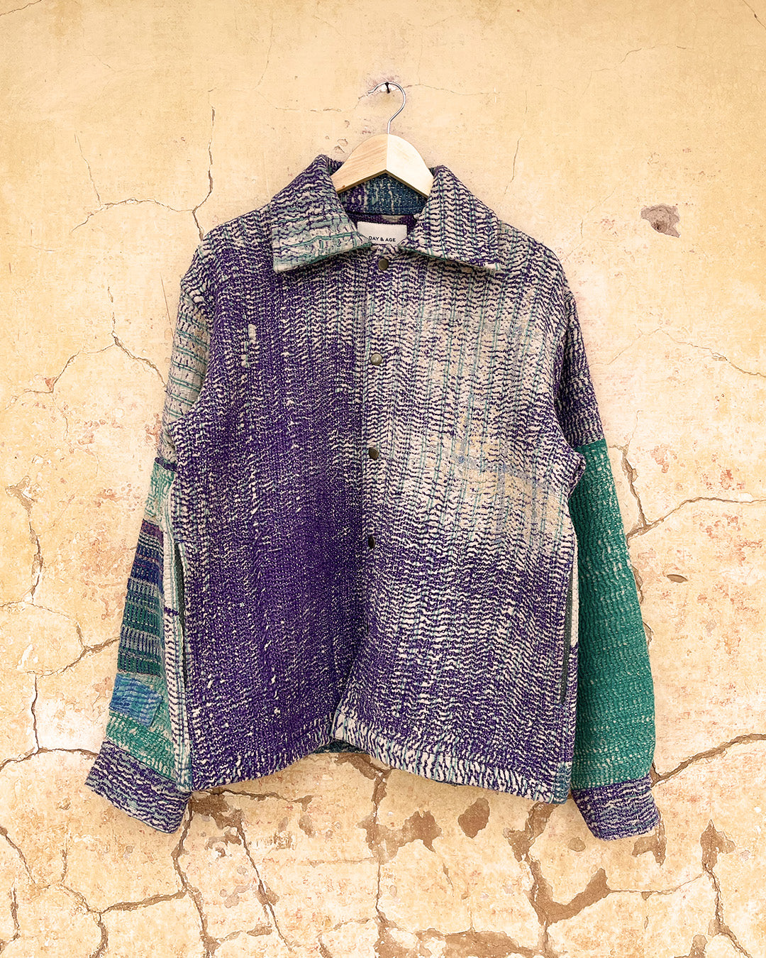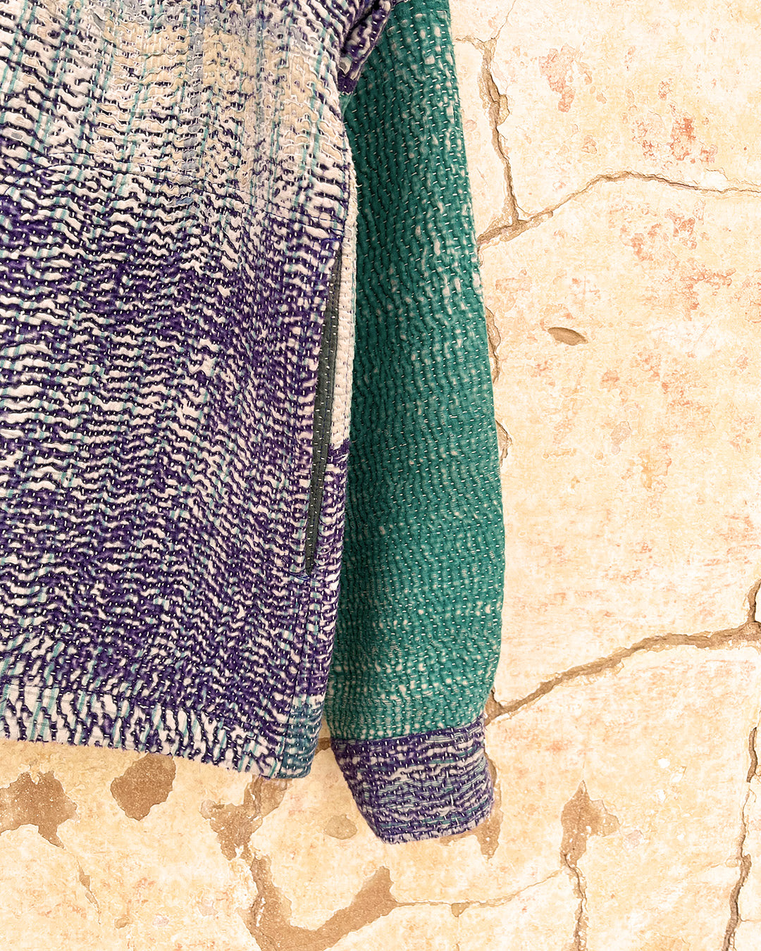 Kantha quilts are crafted from repurposed saris and fabrics and feature repairs, darning, and patchwork. These unique details not only add character but ensure durable, one-of-a-kind garments with a rich up-cycling heritage. We embrace the distressed patches alongside the intricate stitch work in the most unlikely colours.