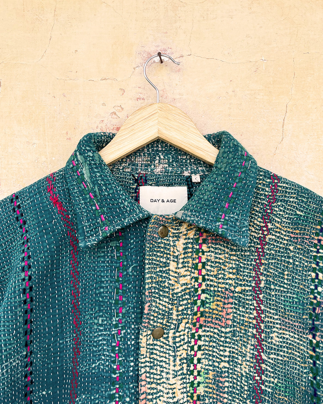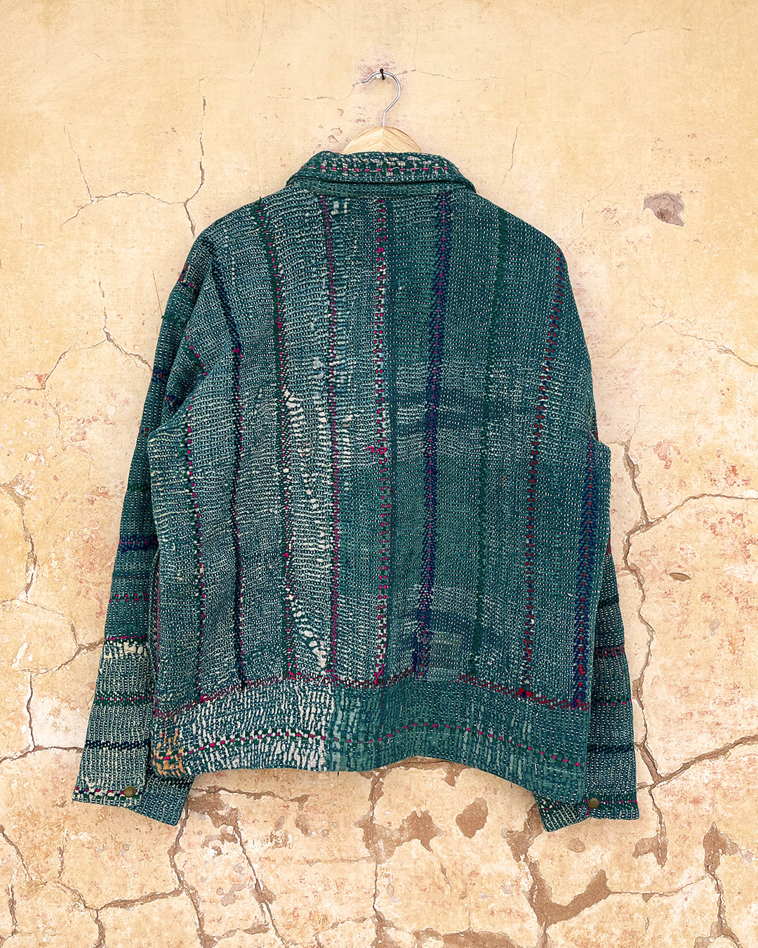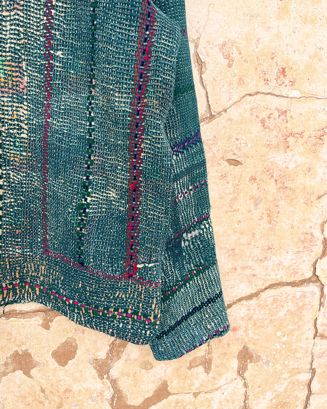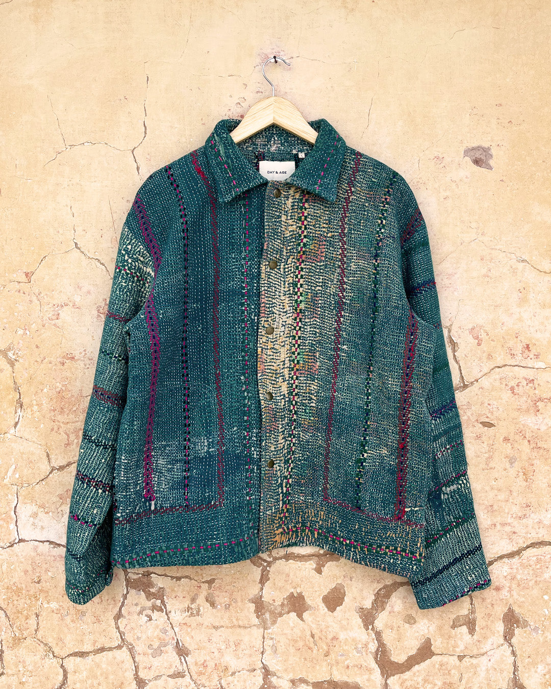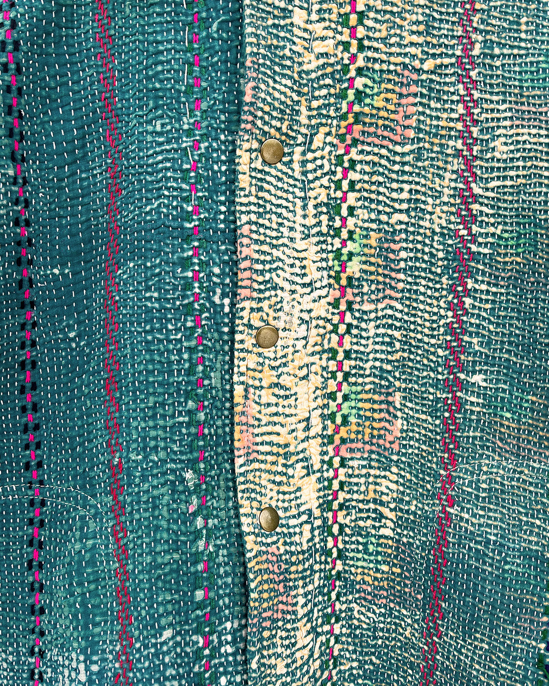 Kantha quilts are crafted from repurposed saris and fabrics and feature repairs, darning, and patchwork. These unique details not only add character but ensure durable, one-of-a-kind garments with a rich up-cycling heritage. We embrace the distressed patches alongside the intricate stitch work in the most unlikely colours.