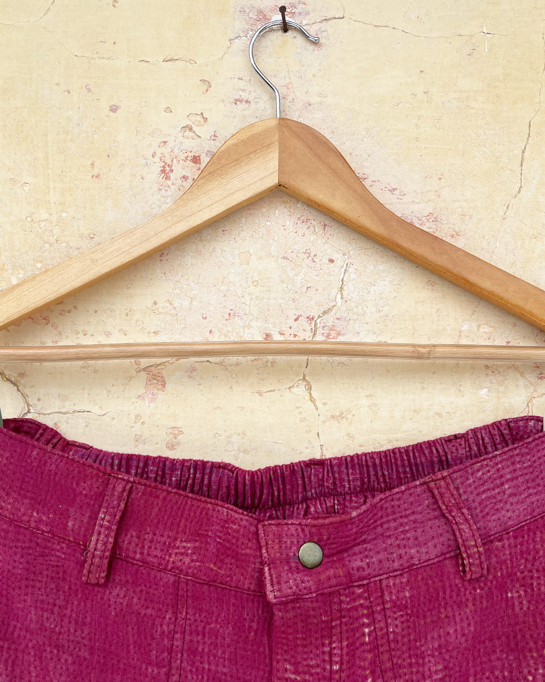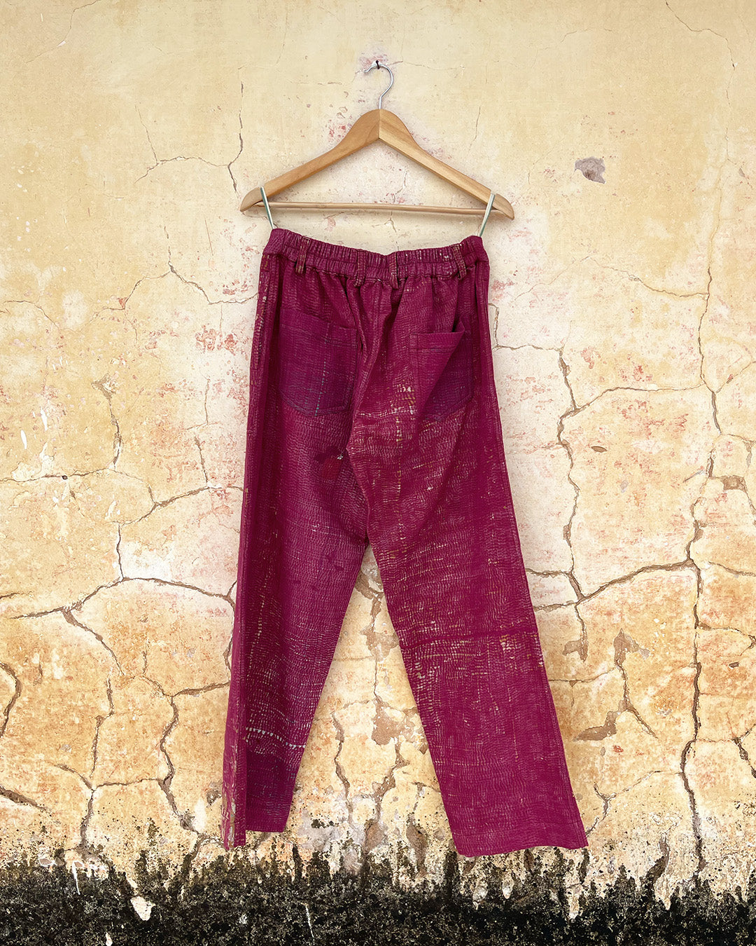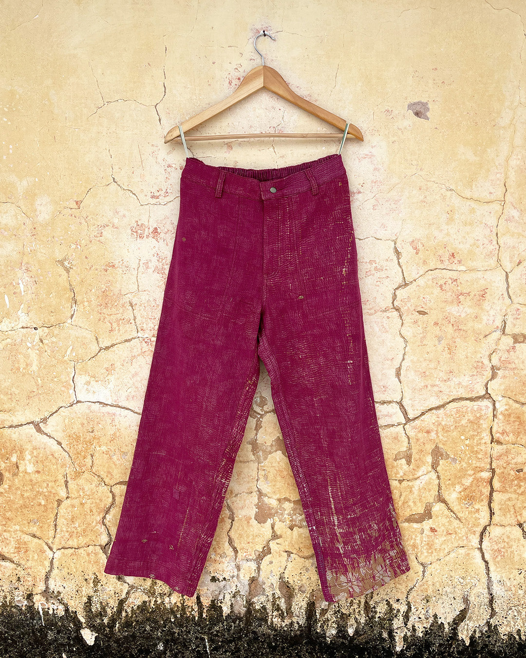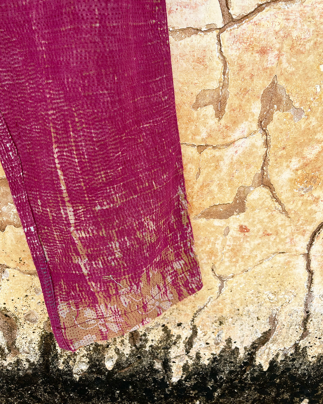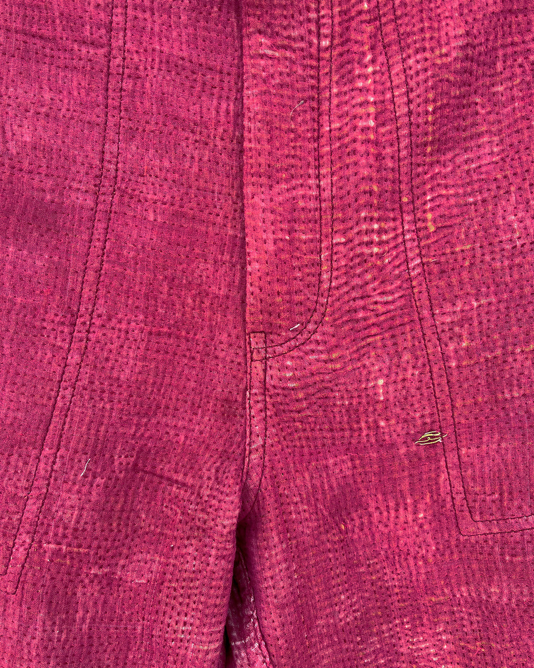 Kantha quilts are crafted from repurposed saris and fabrics and feature repairs, darning, and patchwork. These unique details not only add character but ensure durable, one-of-a-kind garments with a rich up-cycling heritage. We embrace the distressed patches alongside the intricate stitch work in the most unlikely colours.
