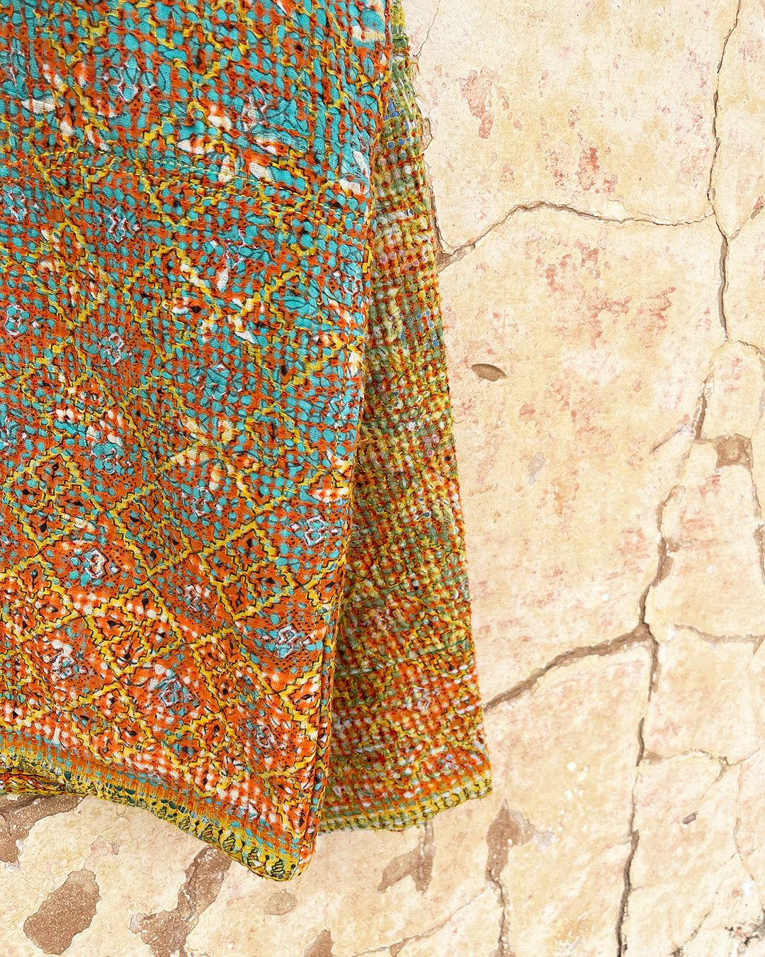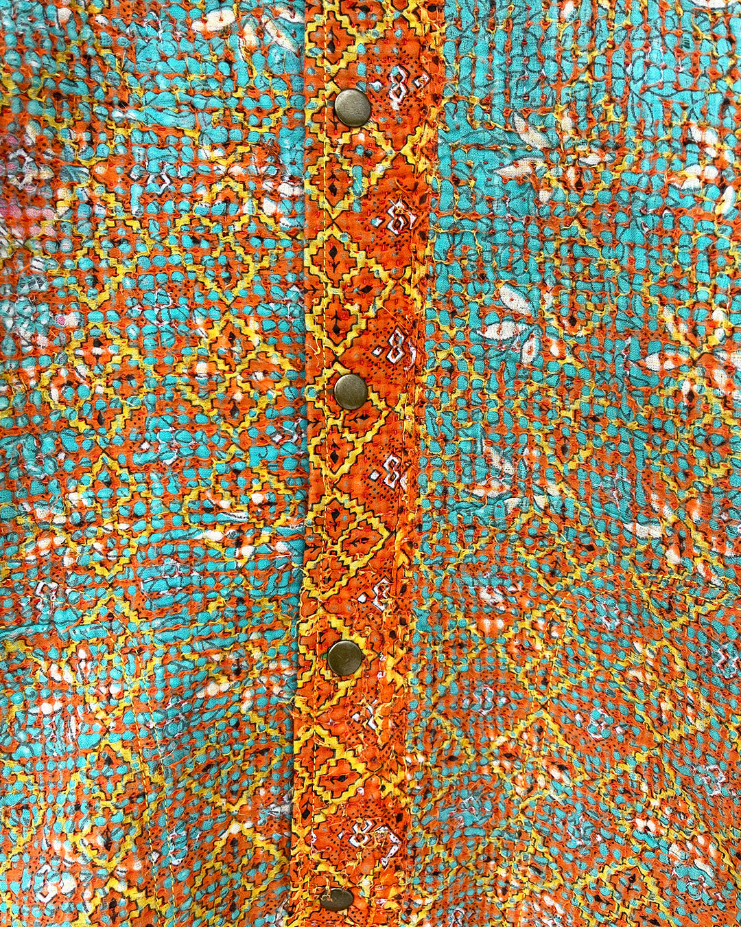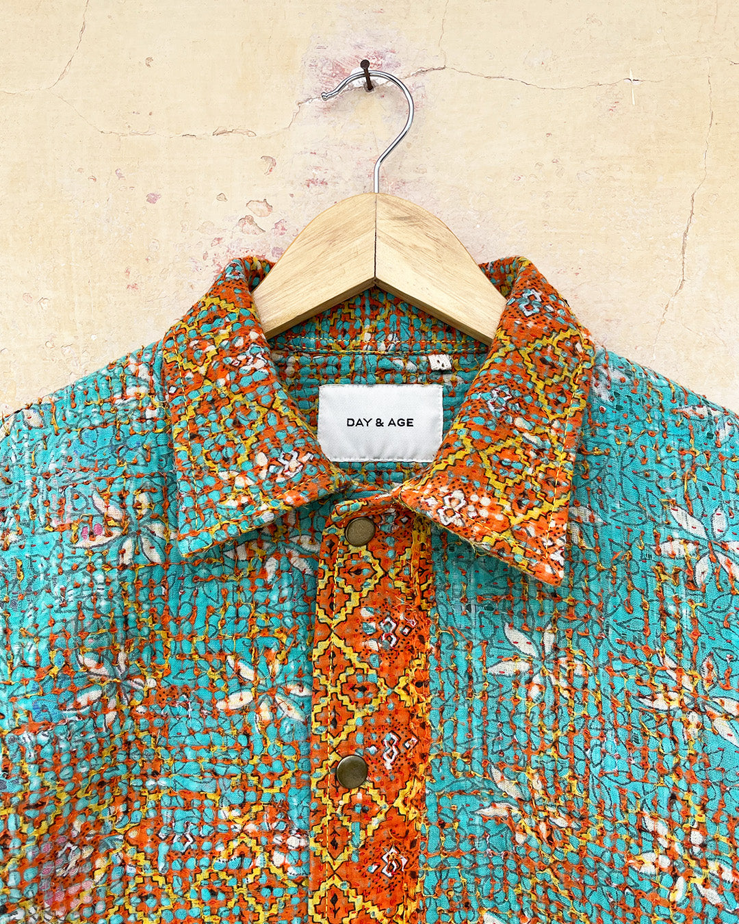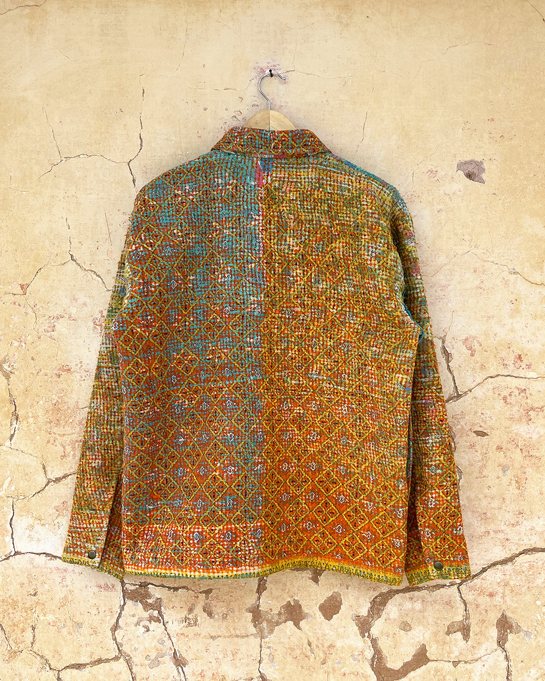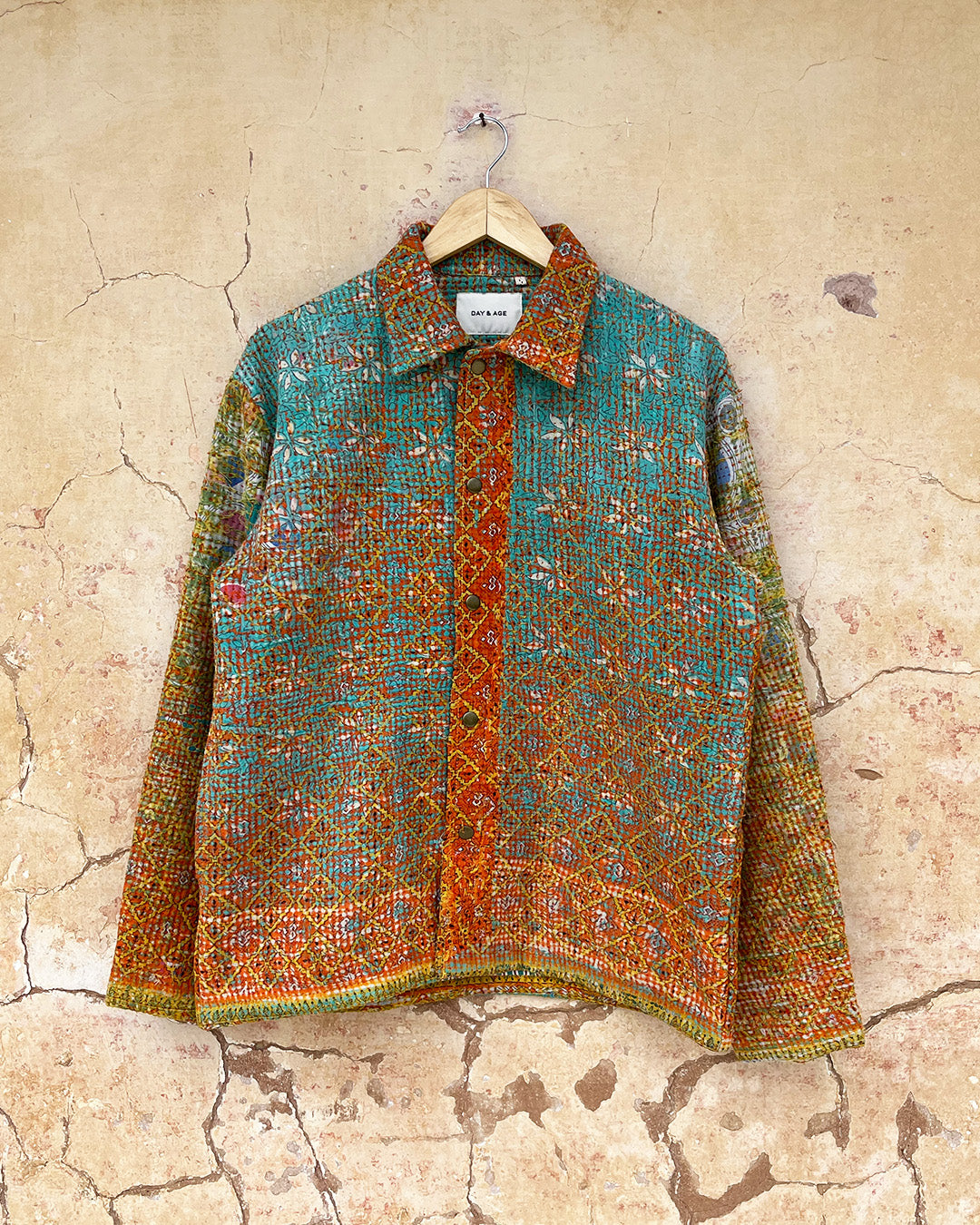 Kantha quilts are crafted from repurposed saris and fabrics and feature repairs, darning, and patchwork. These unique details not only add character but ensure durable, one-of-a-kind garments with a rich up-cycling heritage. We embrace the distressed patches alongside the intricate stitch work in the most unlikely colours.