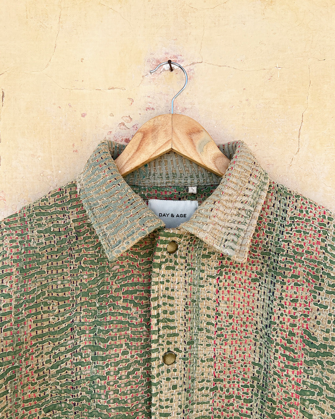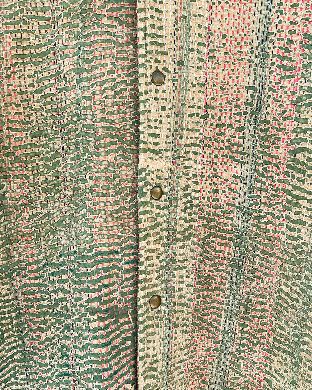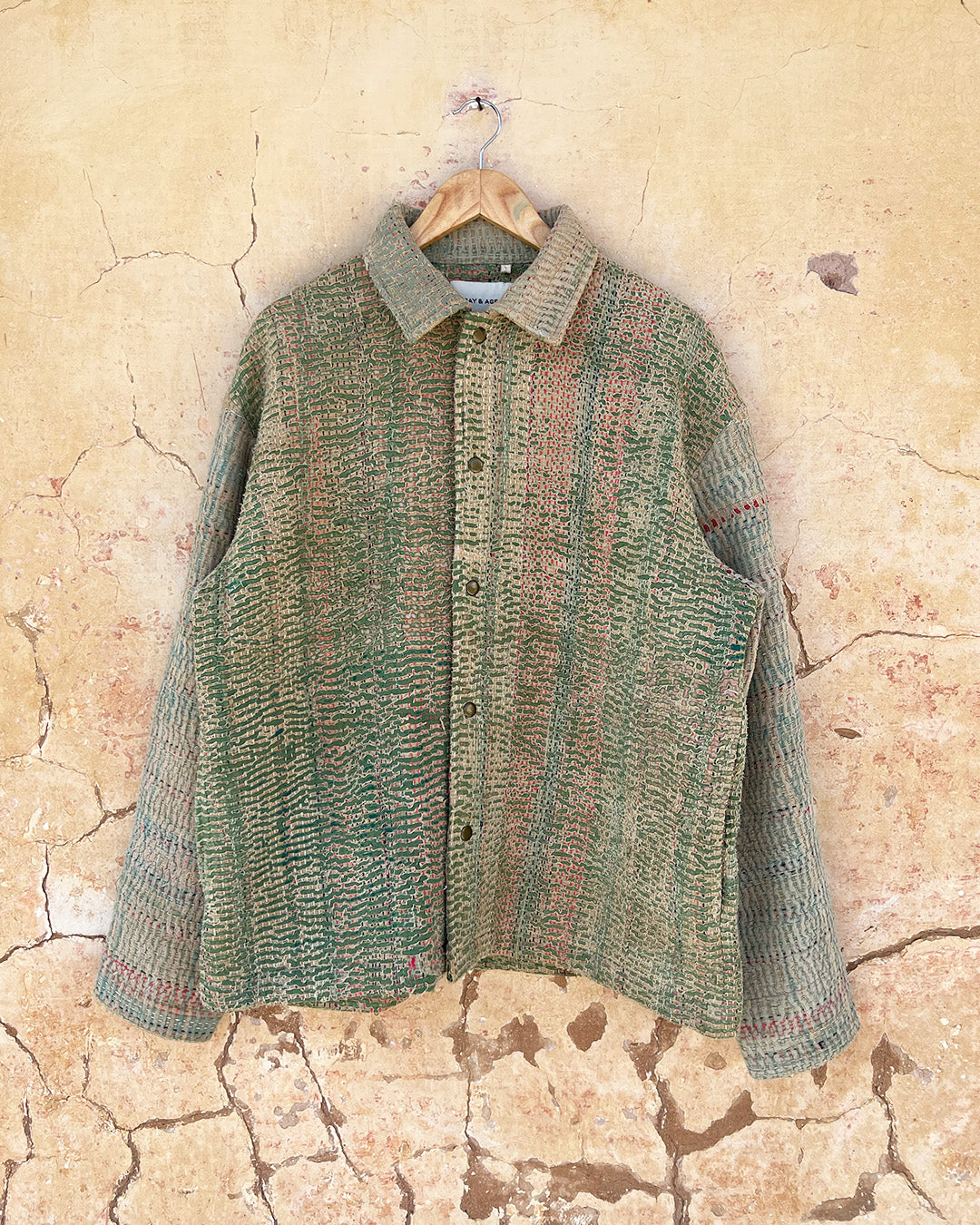 Kantha quilts are crafted from repurposed saris and fabrics and feature repairs, darning, and patchwork. These unique details not only add character but ensure durable, one-of-a-kind garments with a rich up-cycling heritage. We embrace the distressed patches alongside the intricate stitch work in the most unlikely colours.