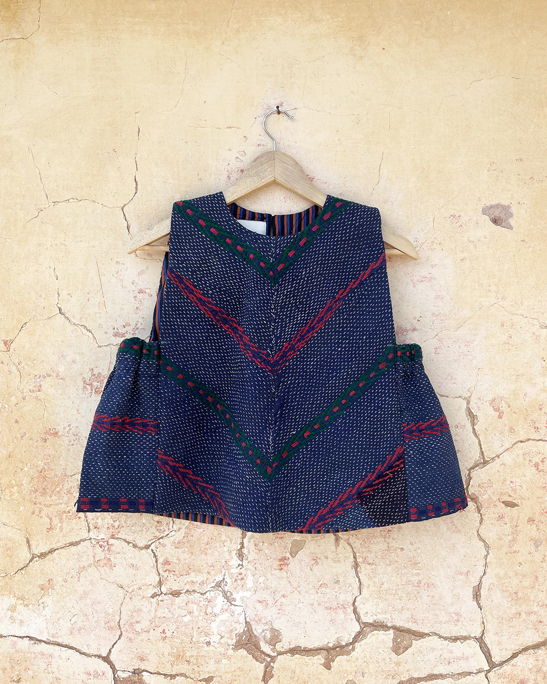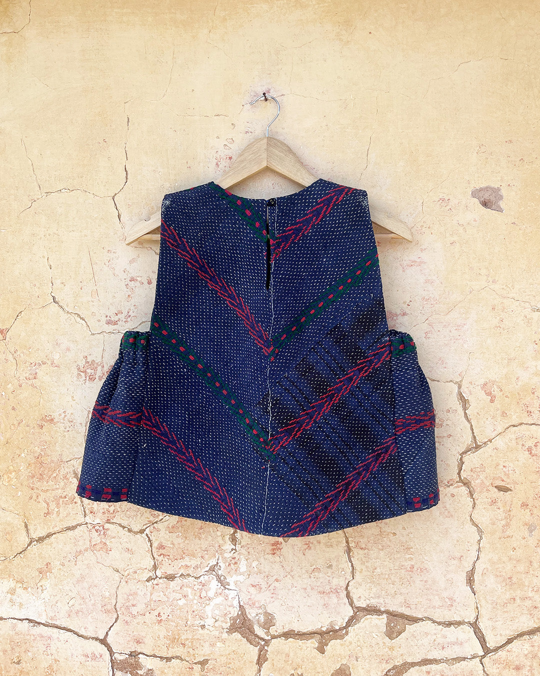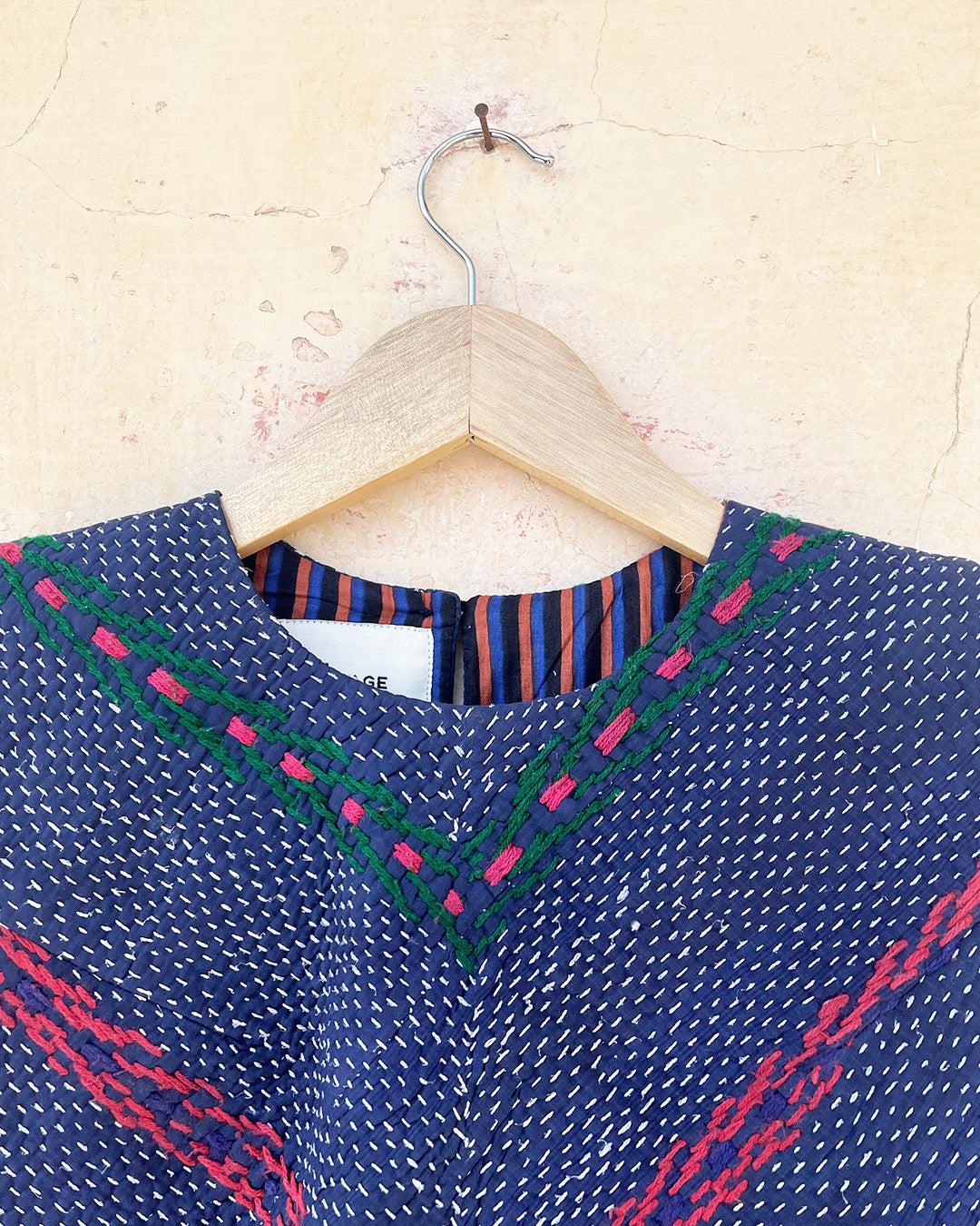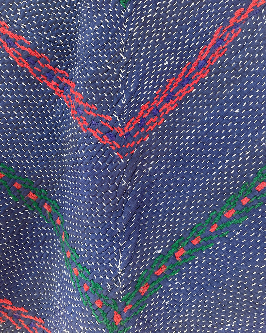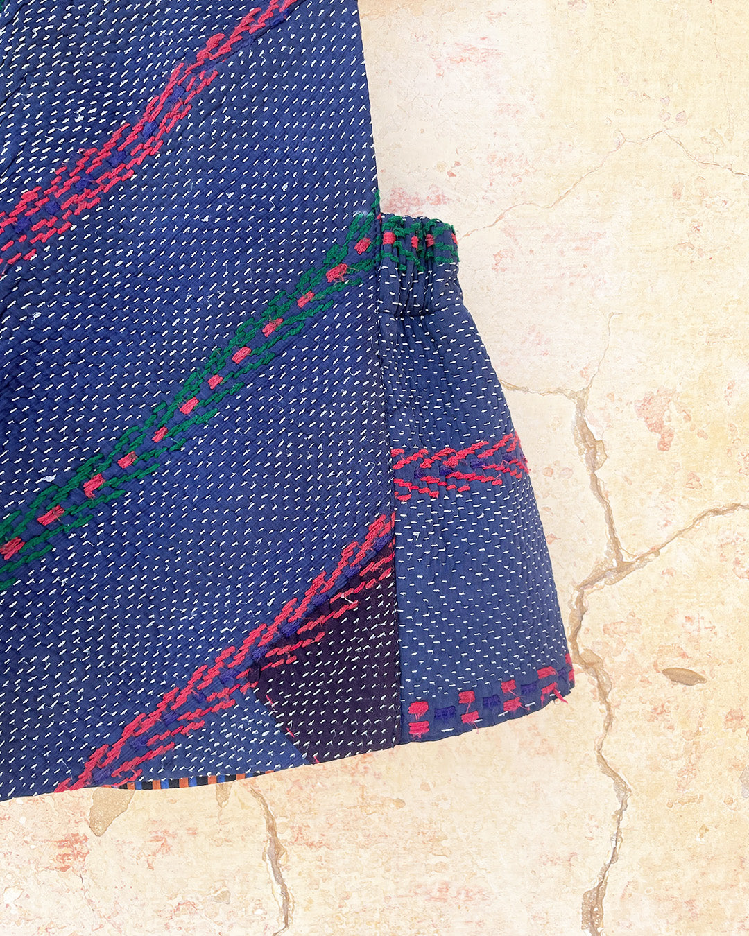 Kantha quilts are crafted from repurposed saris and fabrics and feature repairs, darning, and patchwork. These unique details not only add character but ensure durable, one-of-a-kind garments with a rich up-cycling heritage. We embrace the distressed patches alongside the intricate stitch work in the most unlikely colours.