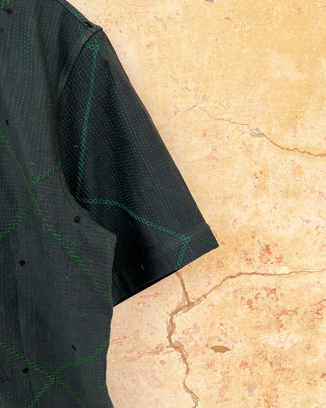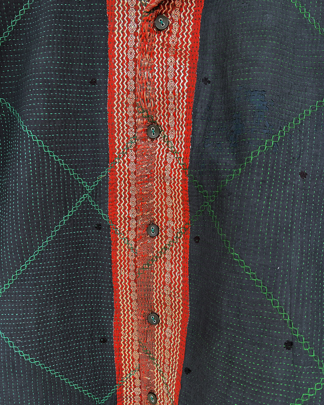 Kantha quilts are crafted from repurposed saris and fabrics and feature repairs, darning, and patchwork. These unique details not only add character but ensure durable, one-of-a-kind garments with a rich up-cycling heritage. We embrace the distressed patches alongside the intricate stitch work in the most unlikely colours.