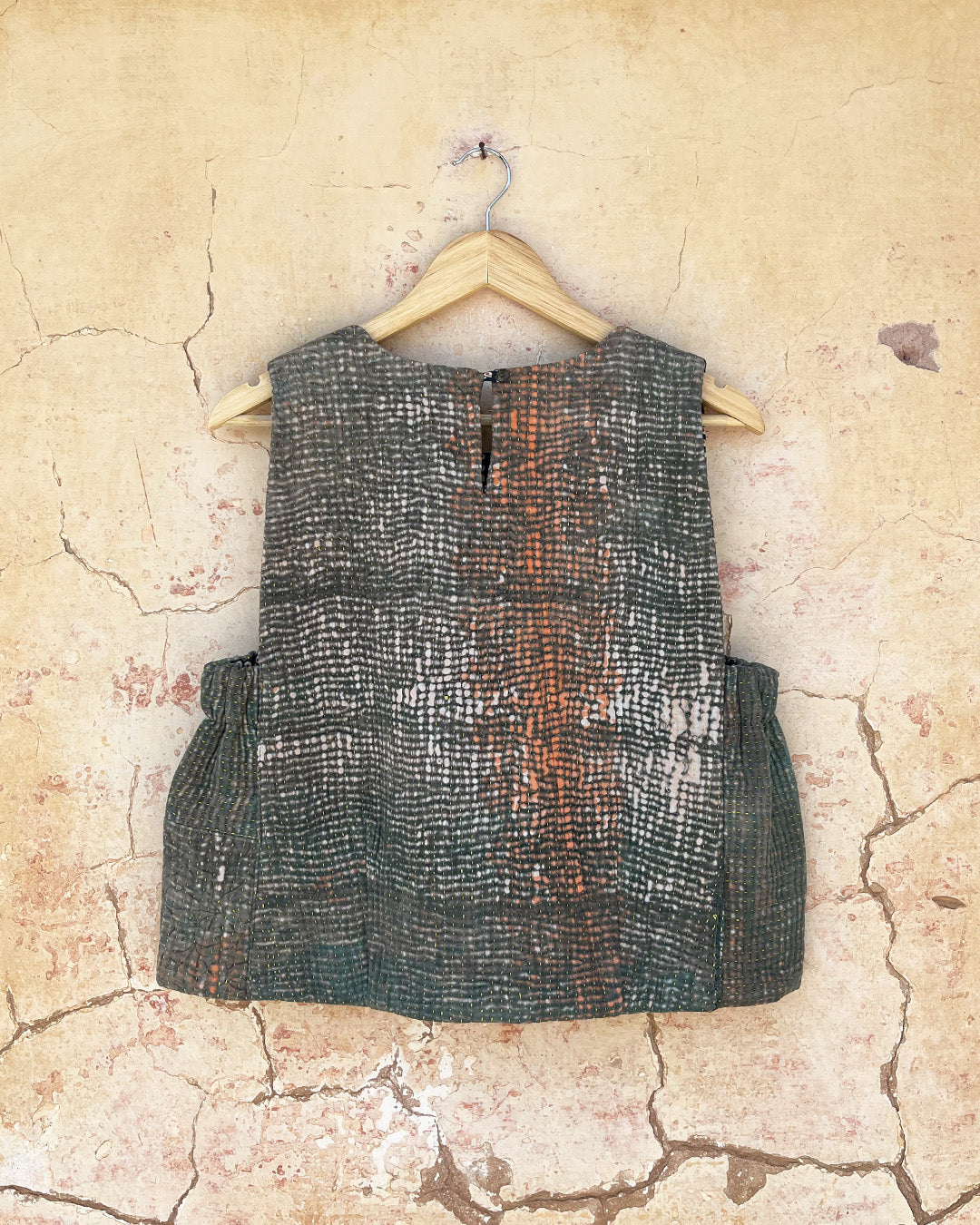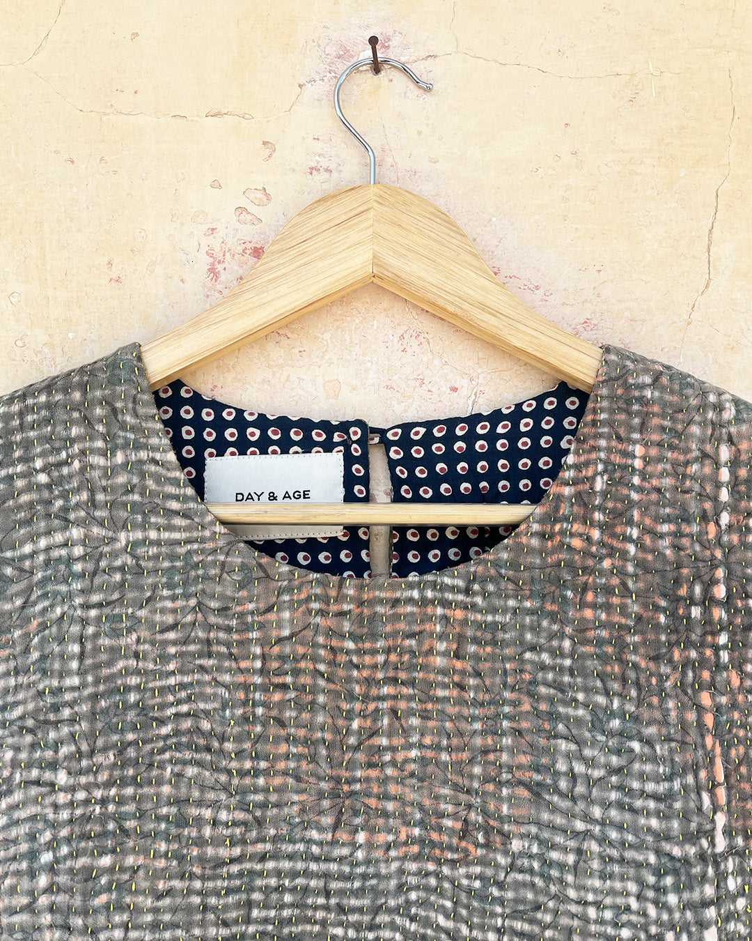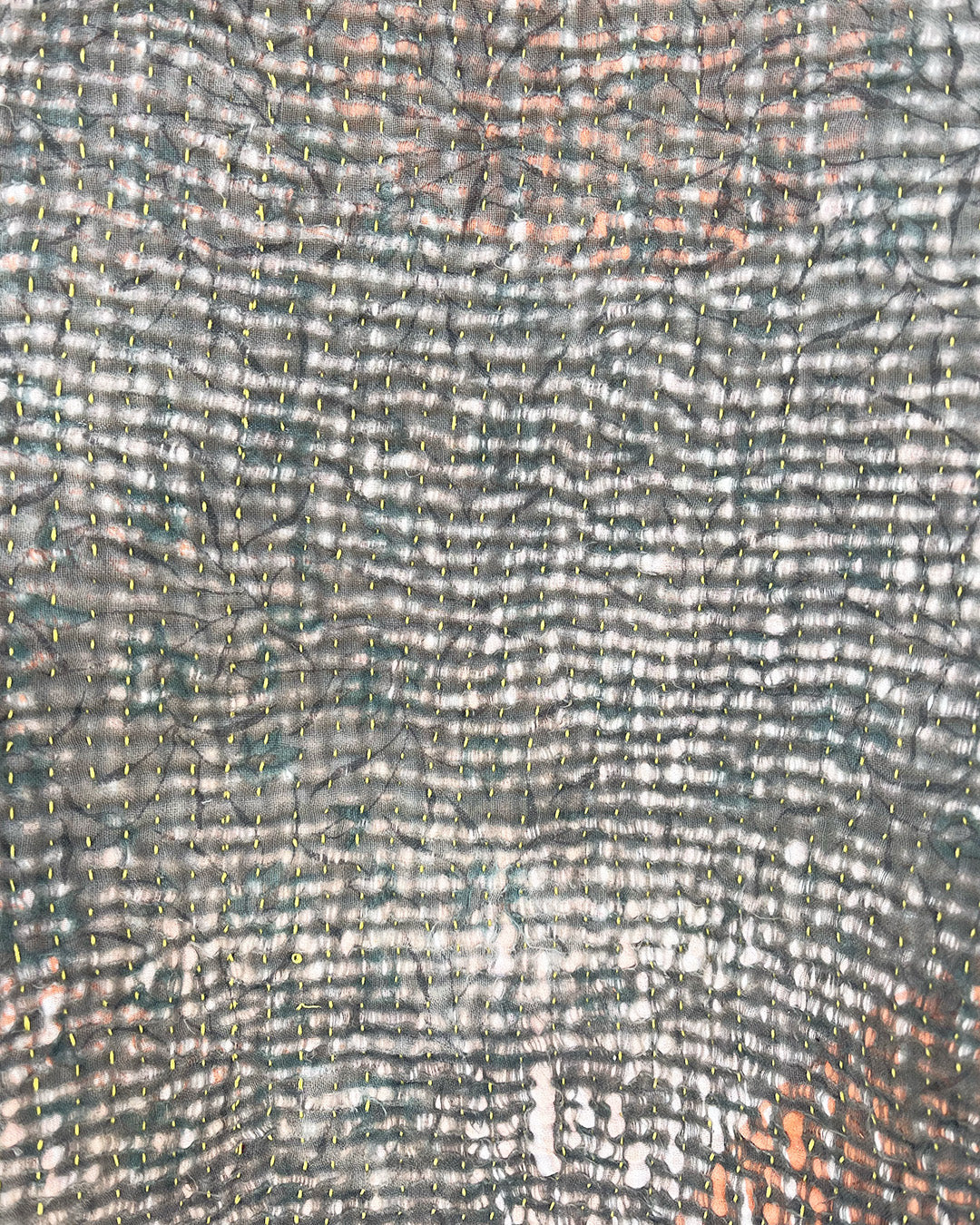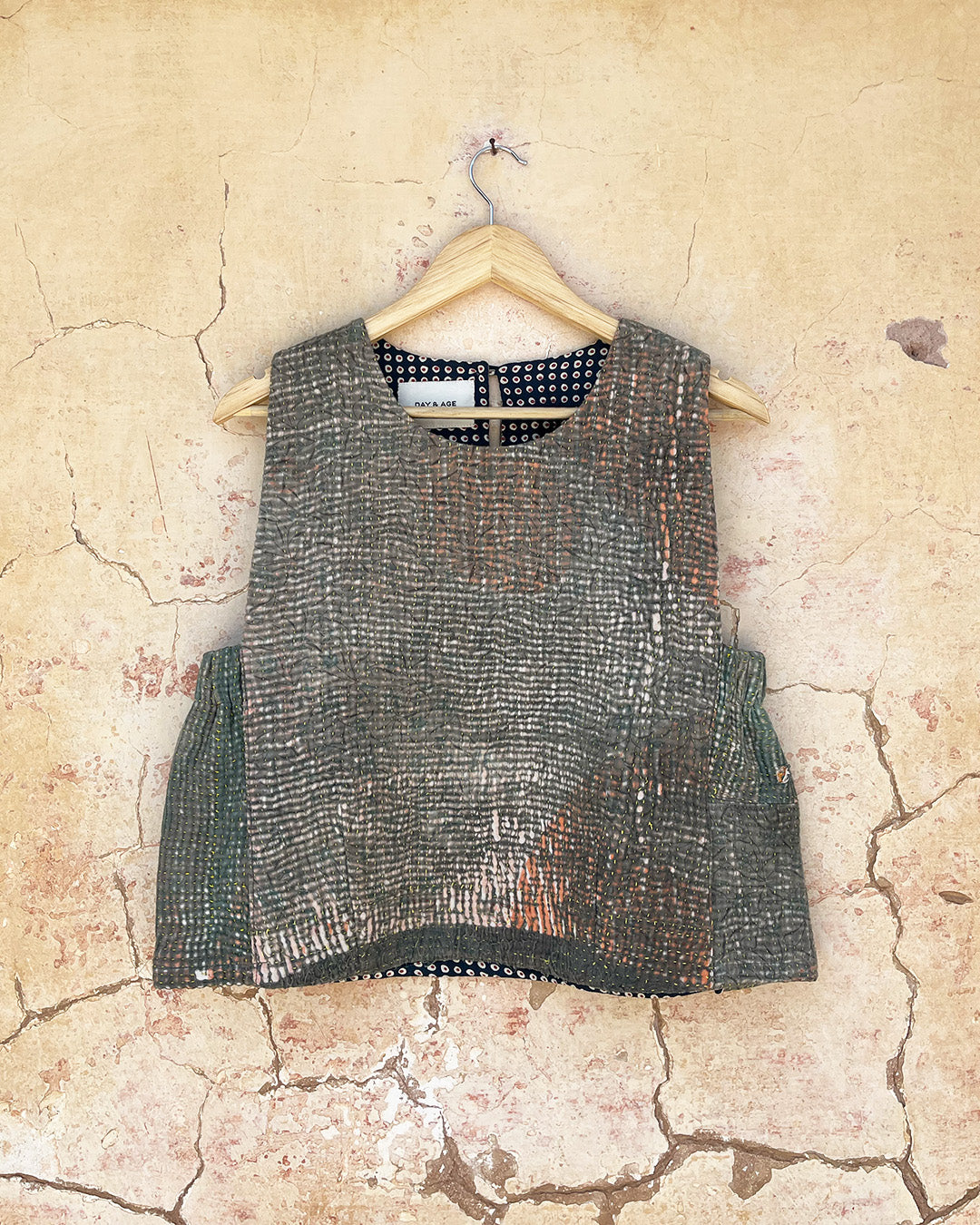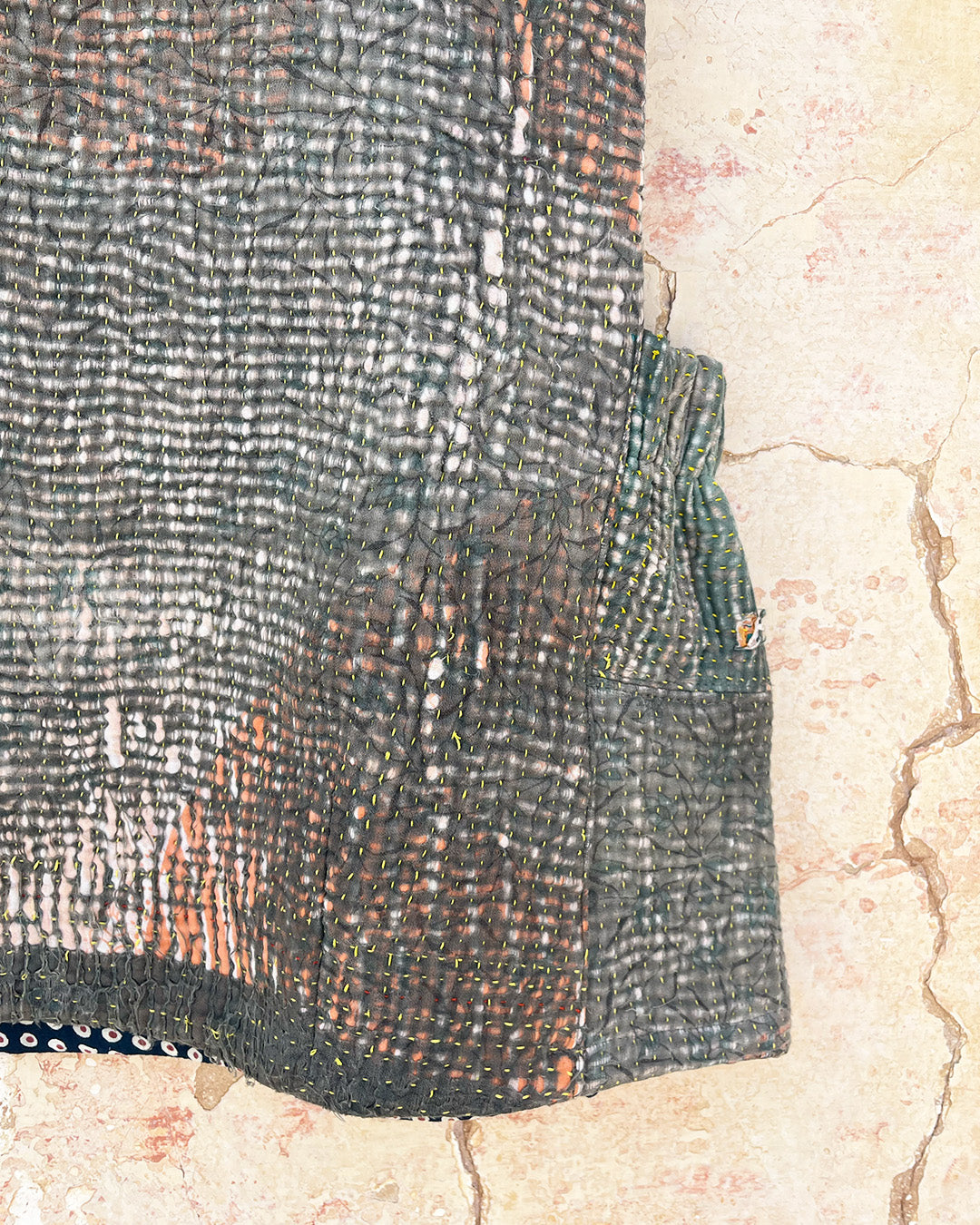 Kantha quilts are crafted from repurposed saris and fabrics and feature repairs, darning, and patchwork. These unique details not only add character but ensure durable, one-of-a-kind garments with a rich up-cycling heritage. We embrace the distressed patches alongside the intricate stitch work in the most unlikely colours.