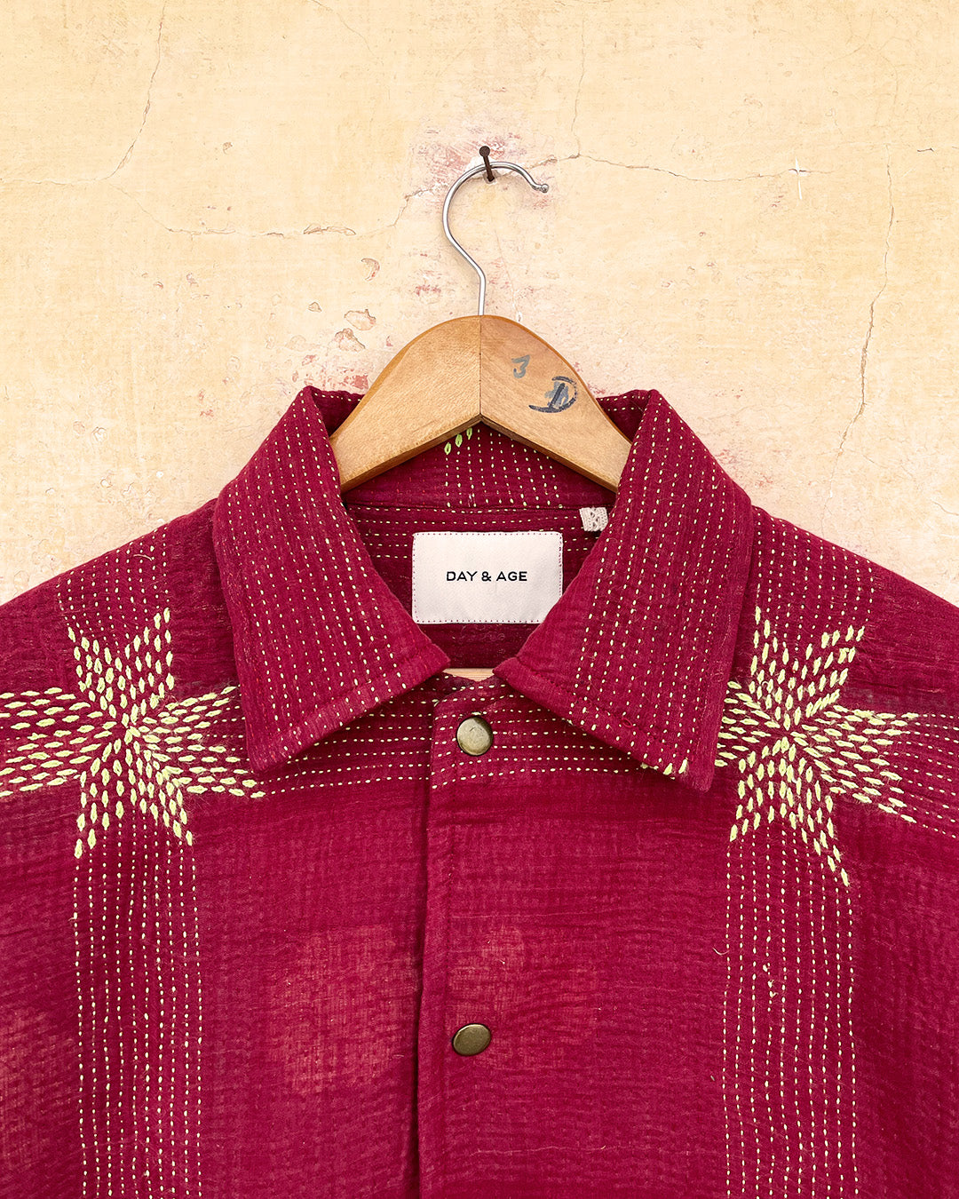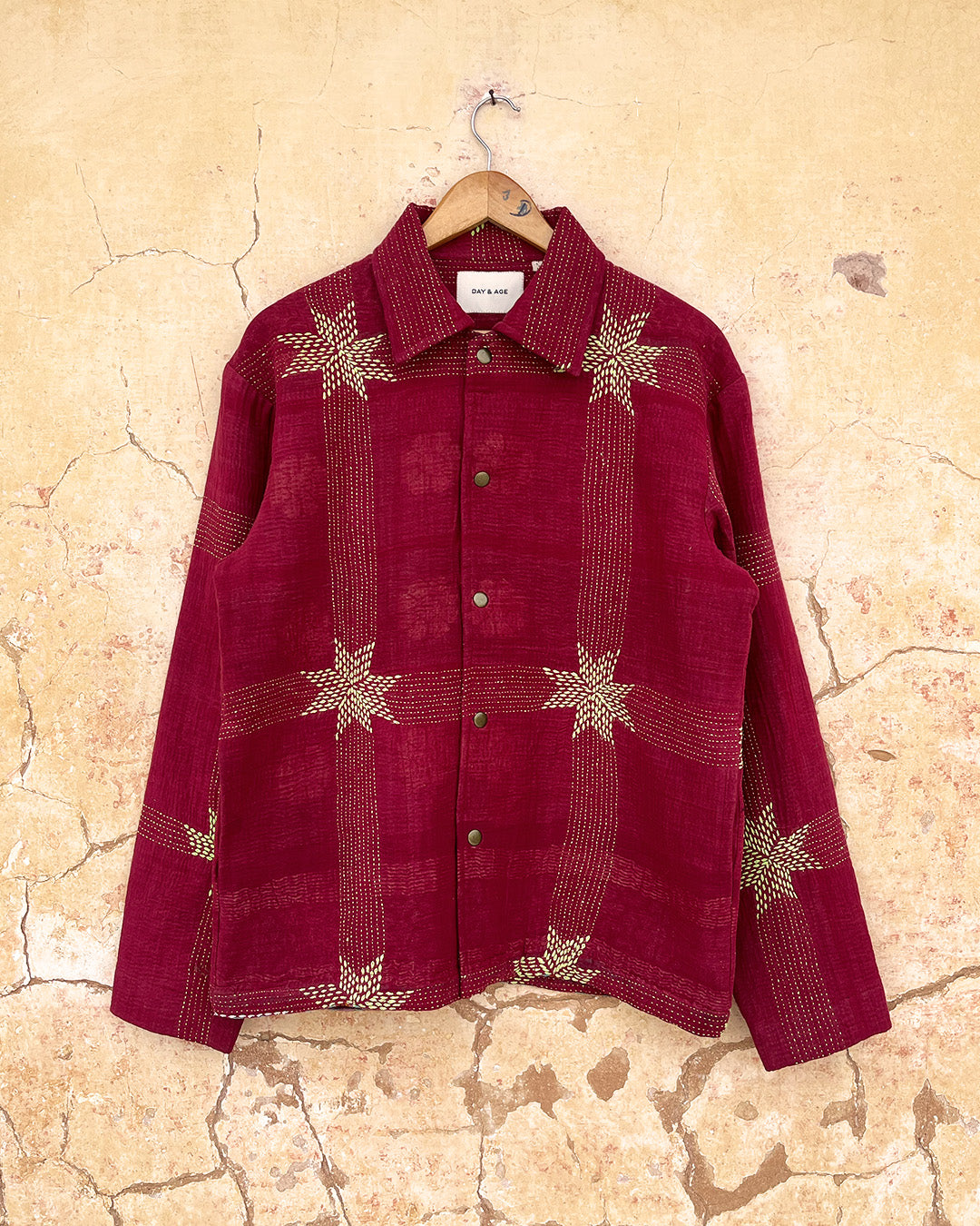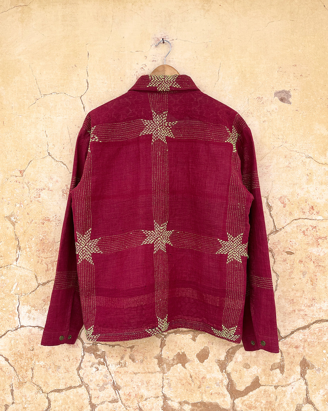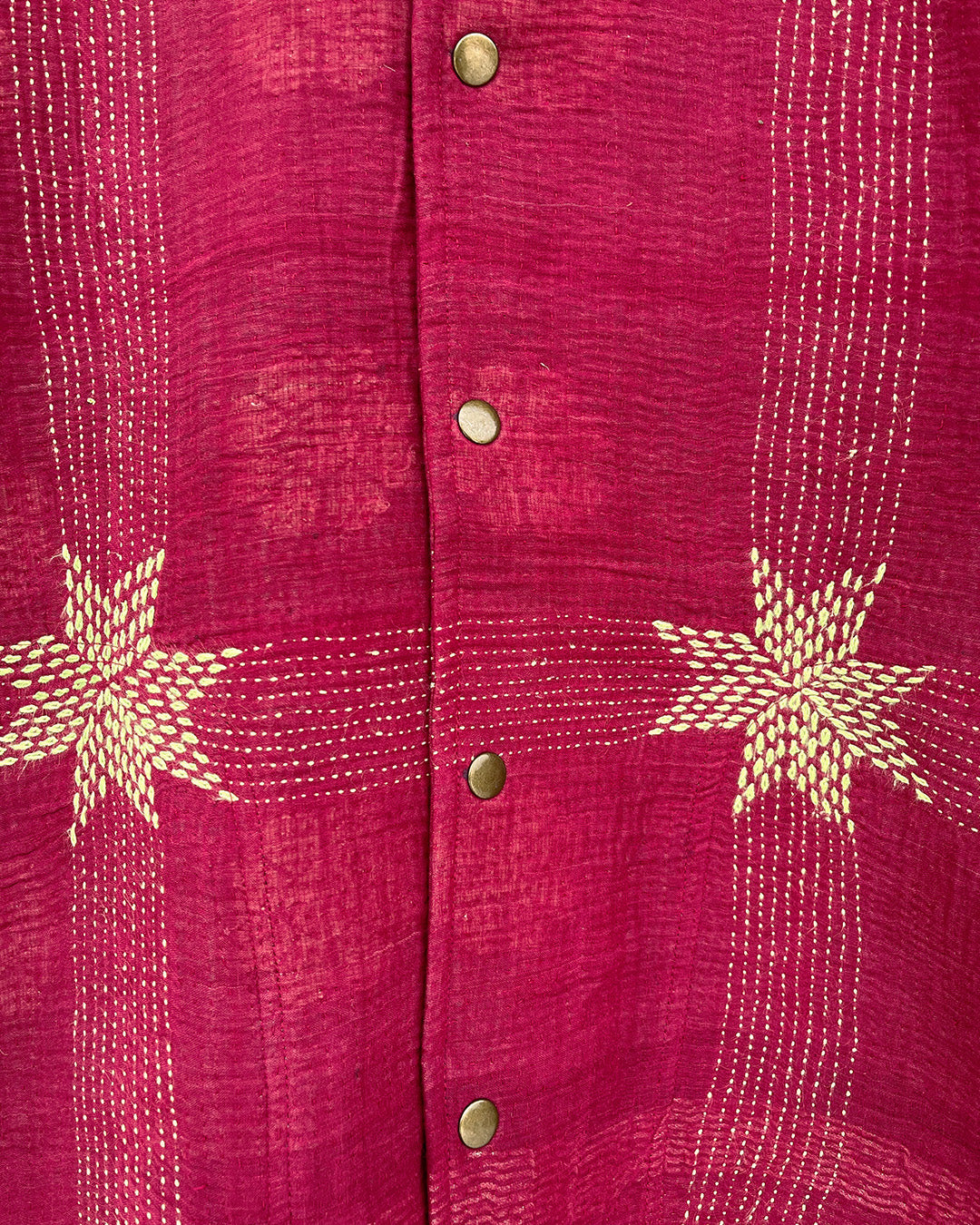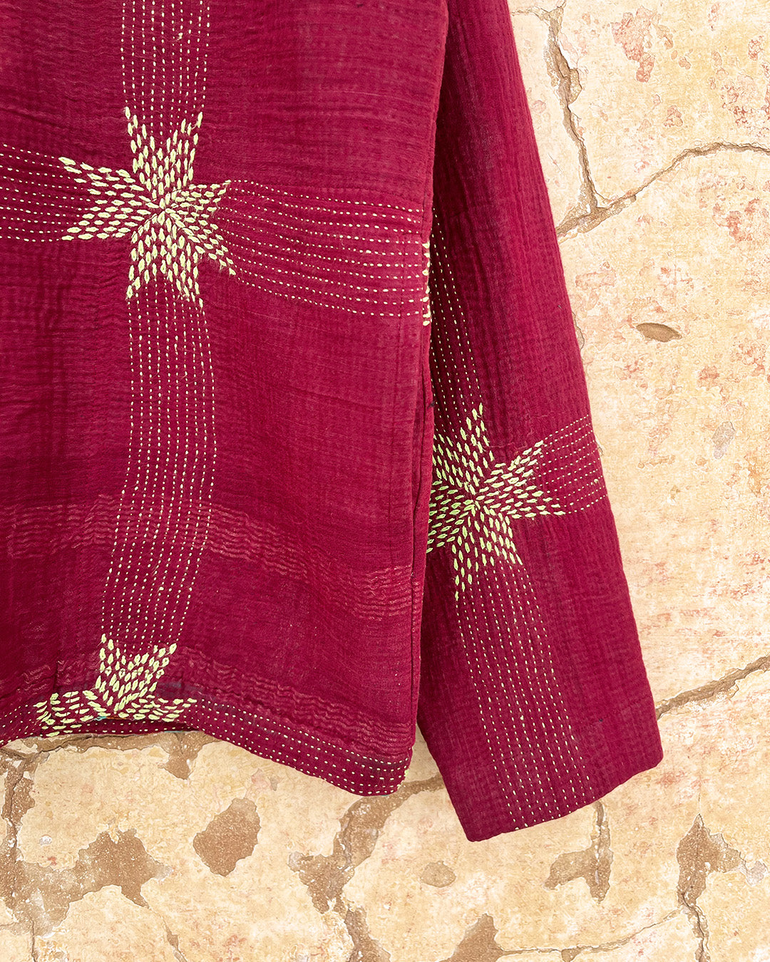 Kantha quilts are crafted from repurposed saris and fabrics and feature repairs, darning, and patchwork. These unique details not only add character but ensure durable, one-of-a-kind garments with a rich up-cycling heritage. We embrace the distressed patches alongside the intricate stitch work in the most unlikely colours.