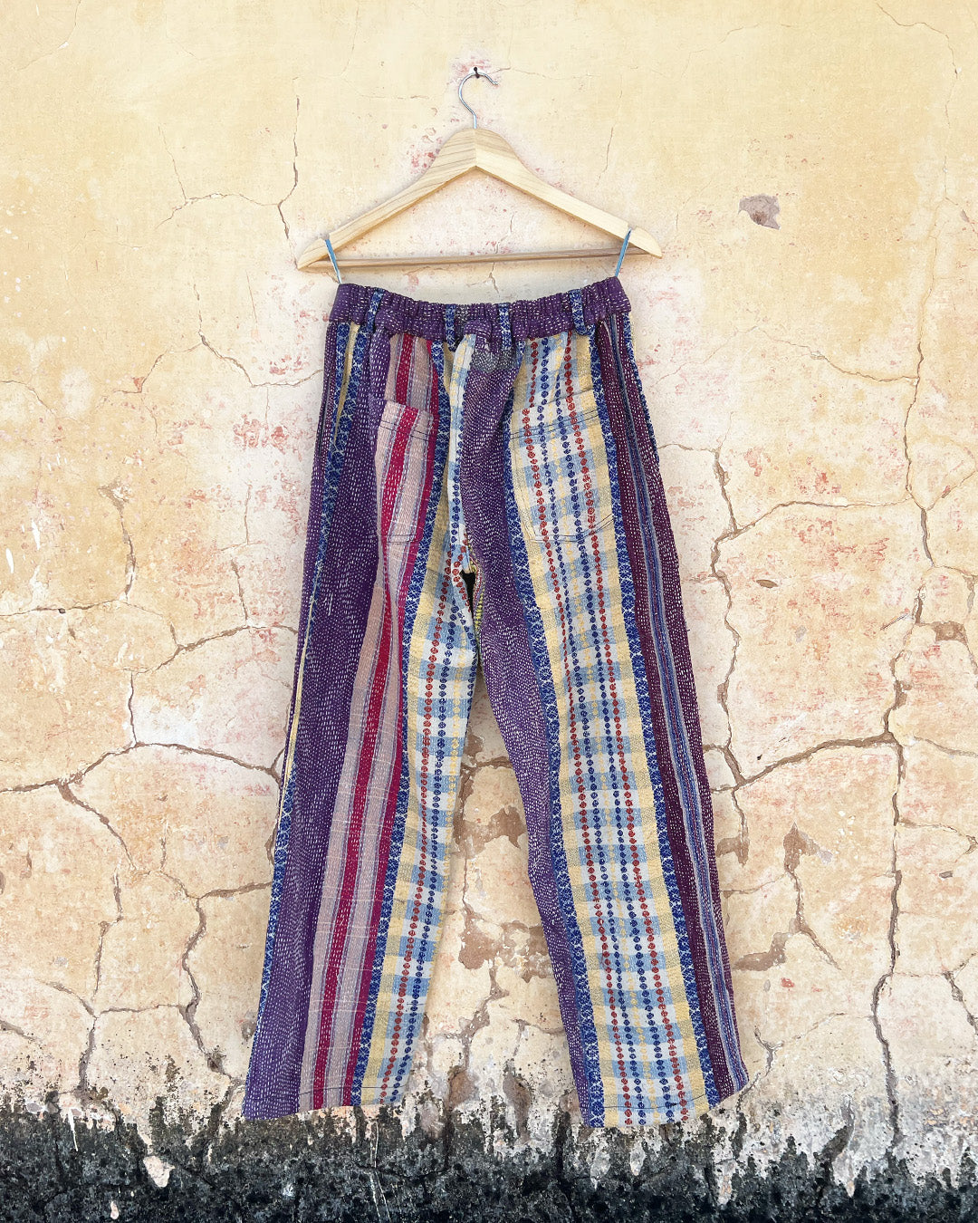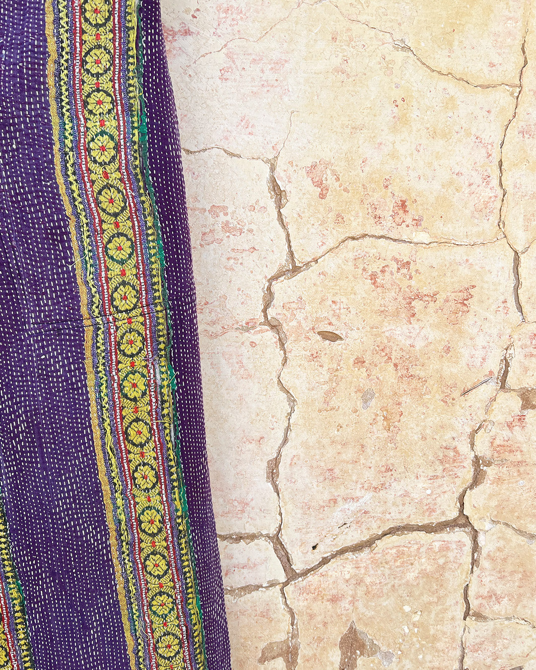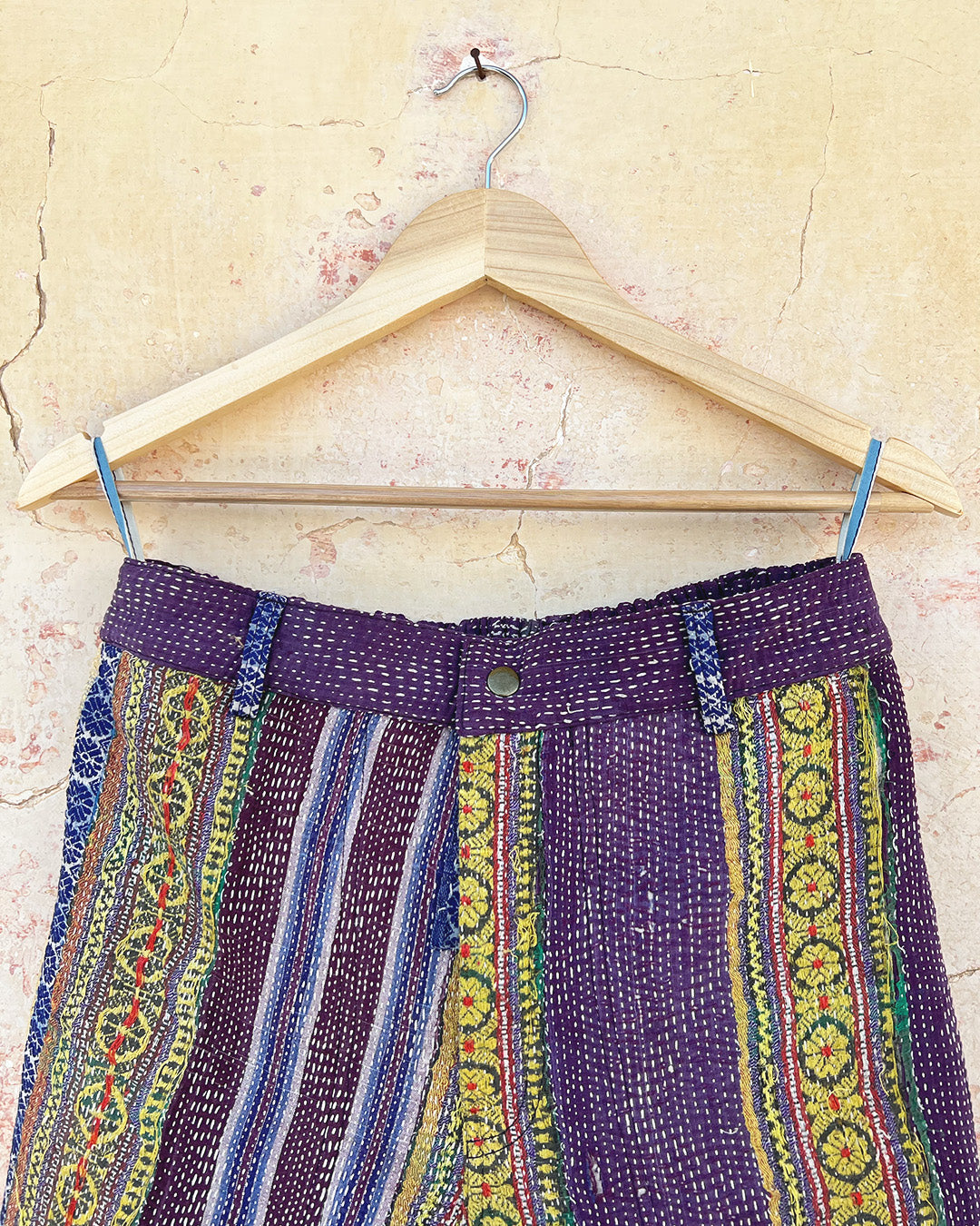 Kantha quilts are crafted from repurposed saris and fabrics and feature repairs, darning, and patchwork. These unique details not only add character but ensure durable, one-of-a-kind garments with a rich up-cycling heritage. We embrace the distressed patches alongside the intricate stitch work in the most unlikely colours.