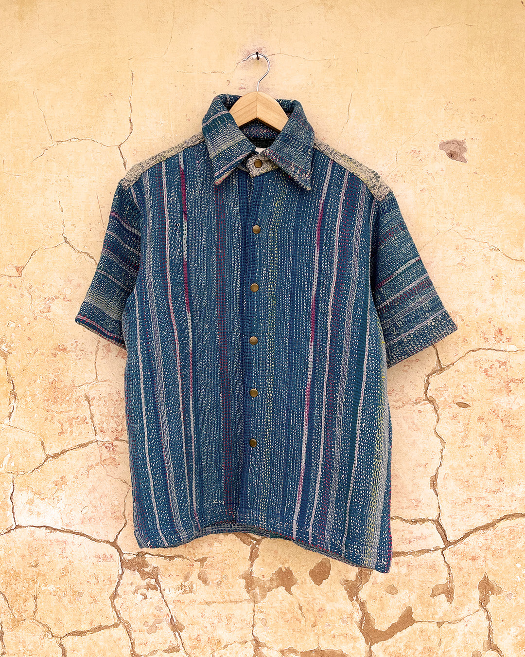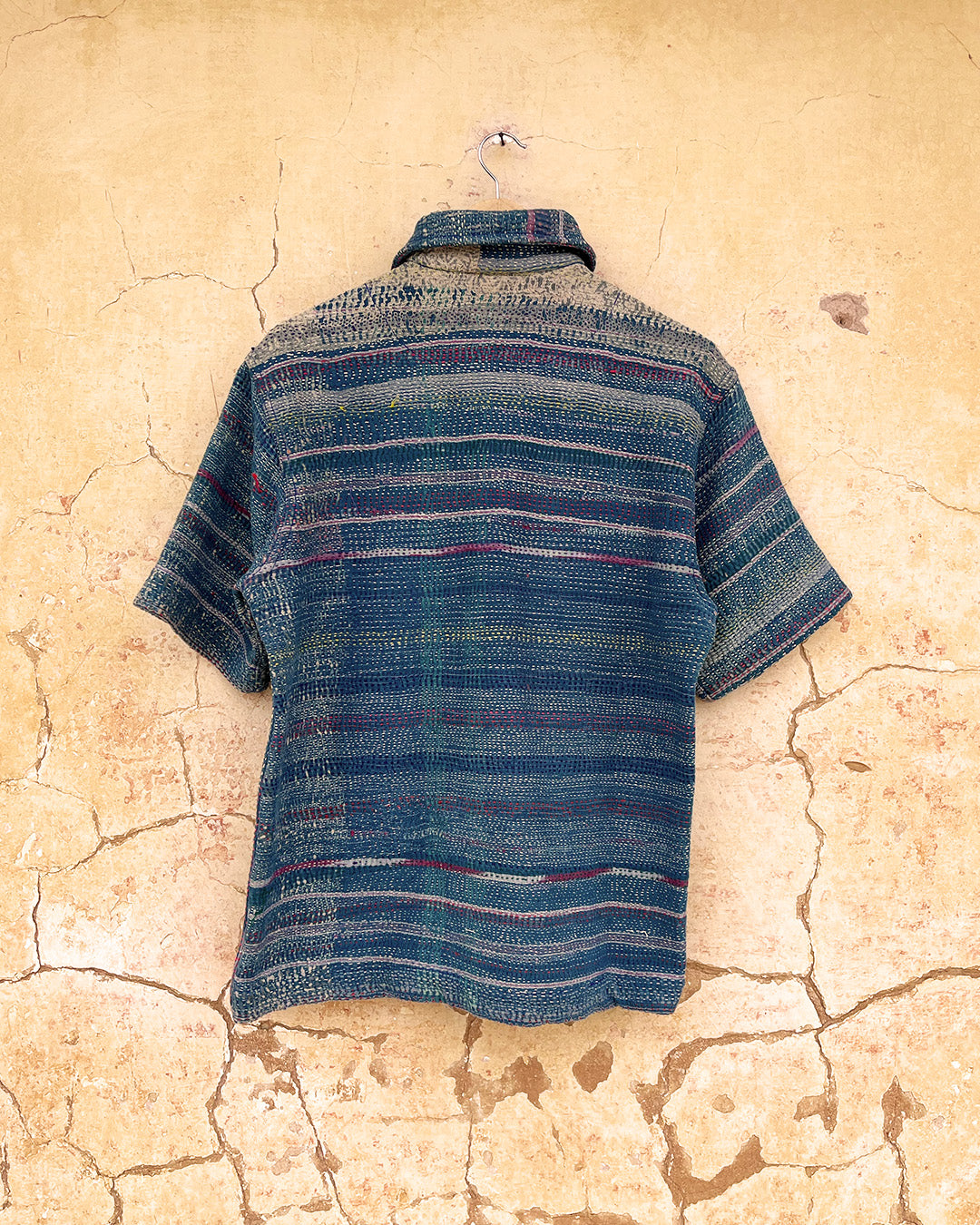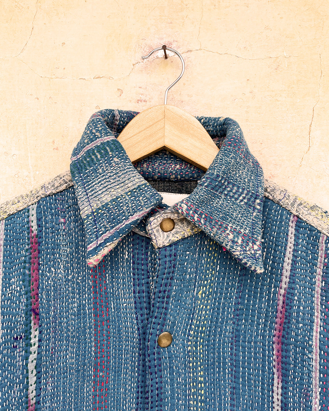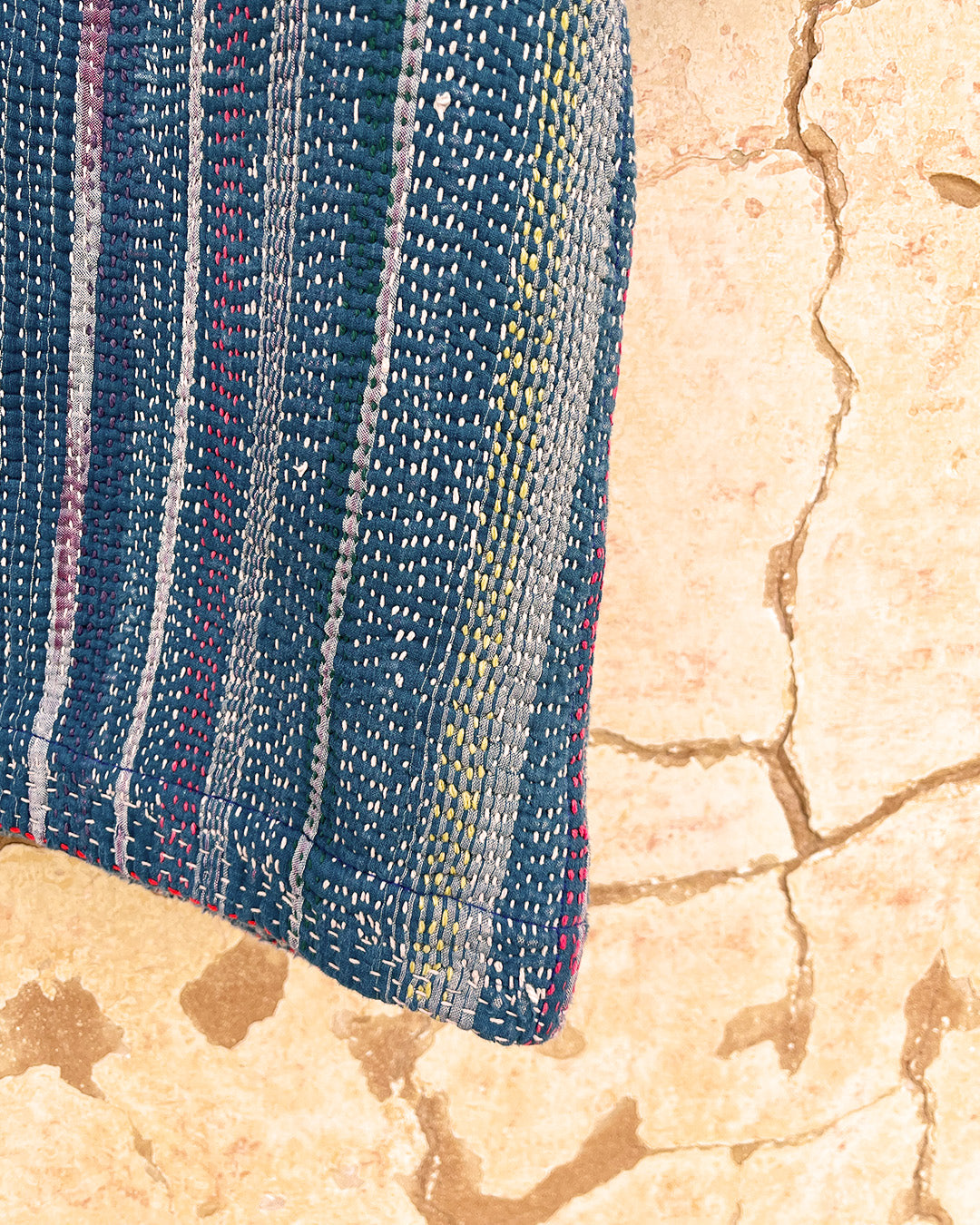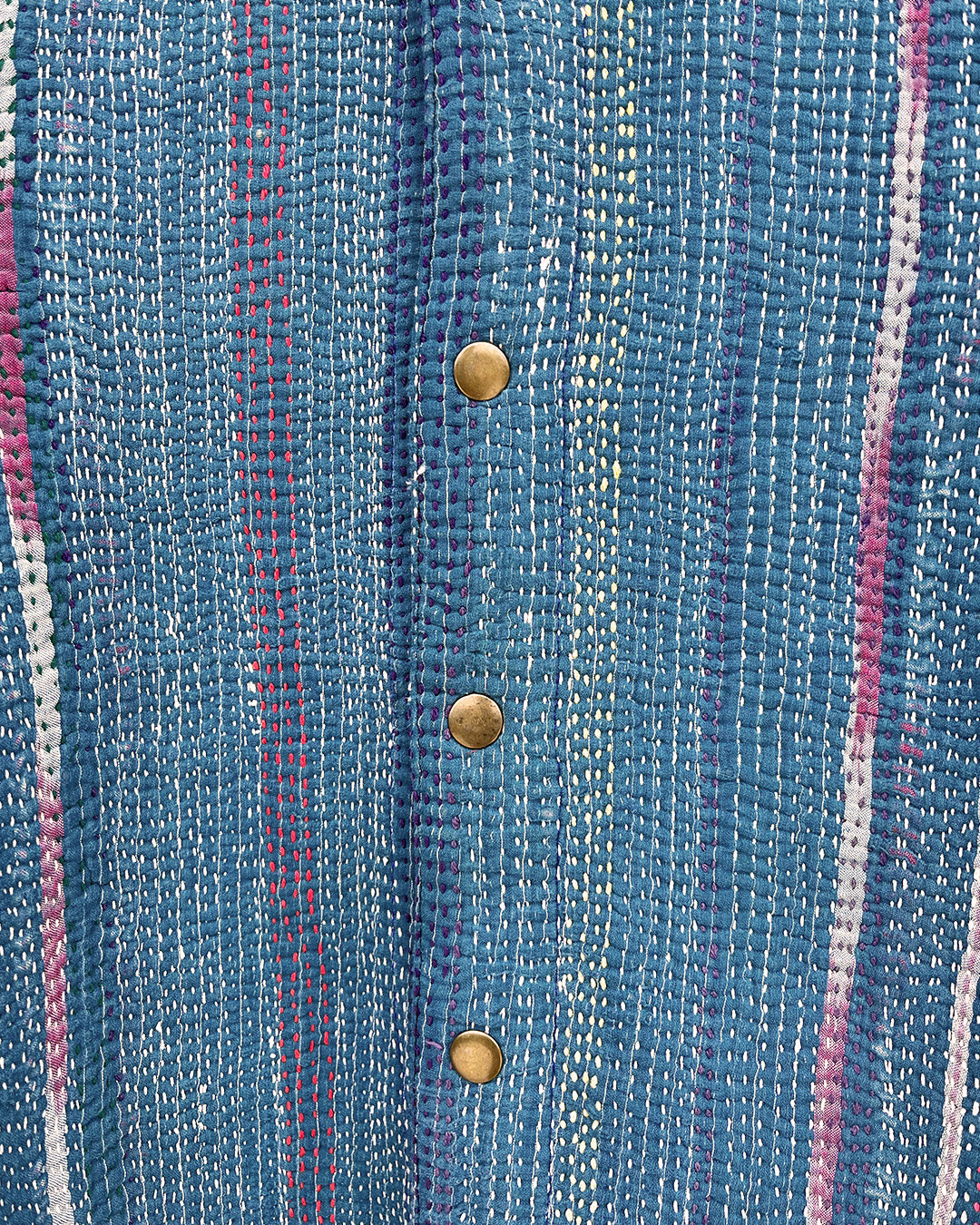 Kantha quilts are crafted from repurposed saris and fabrics and feature repairs, darning, and patchwork. These unique details not only add character but ensure durable, one-of-a-kind garments with a rich up-cycling heritage. We embrace the distressed patches alongside the intricate stitch work in the most unlikely colours.