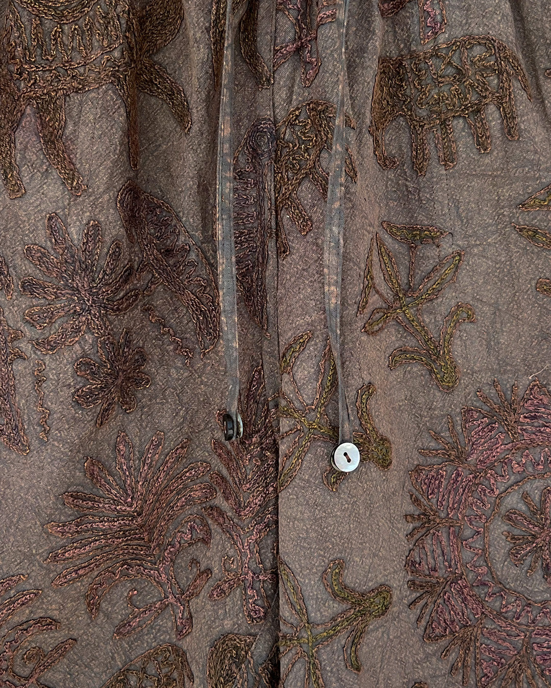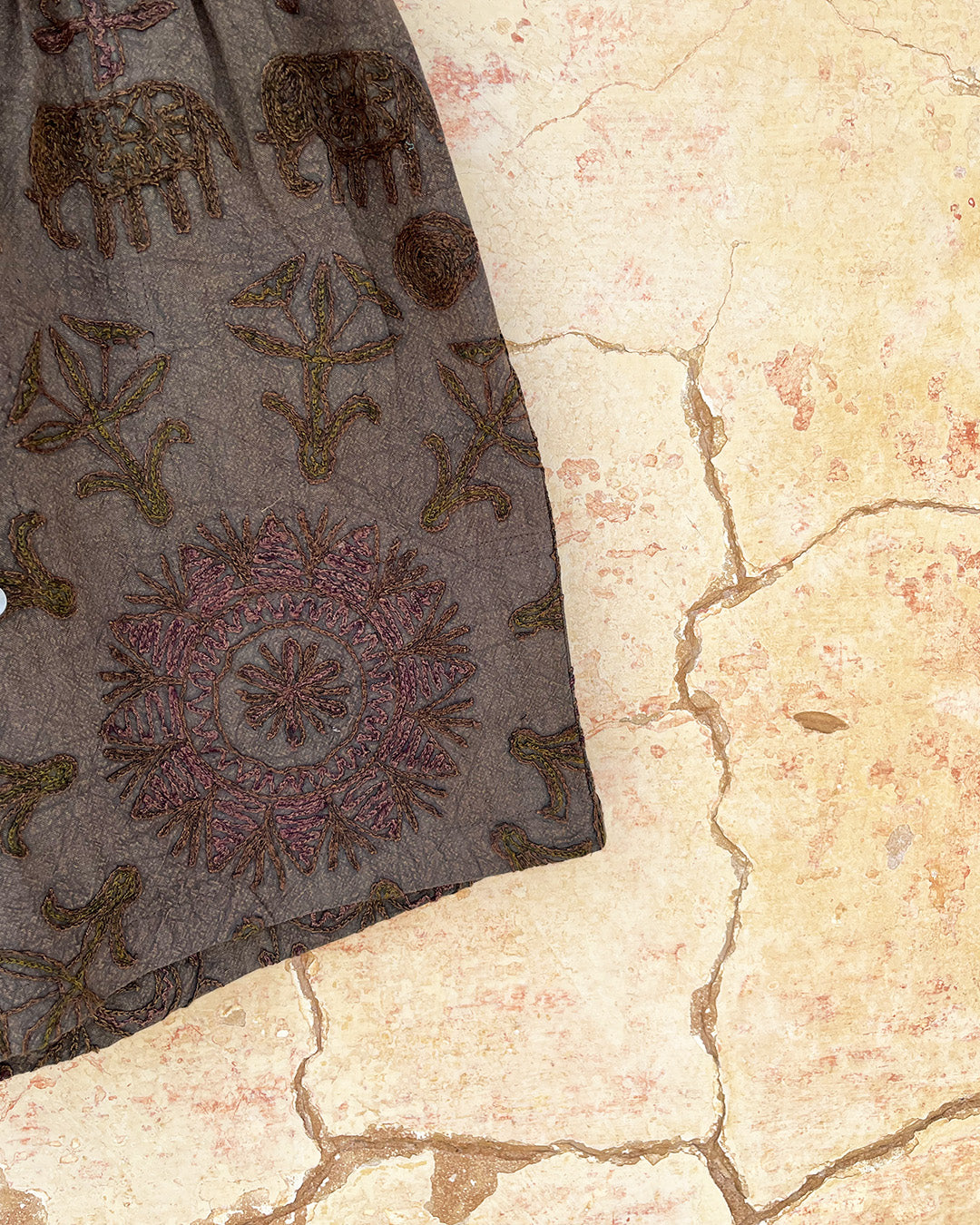 This garment is made from a vintage hand embroidered bedspread from Rajasthan, India. Its textural surface adds character and ensures a durable garment with a rich up-cycling heritage.