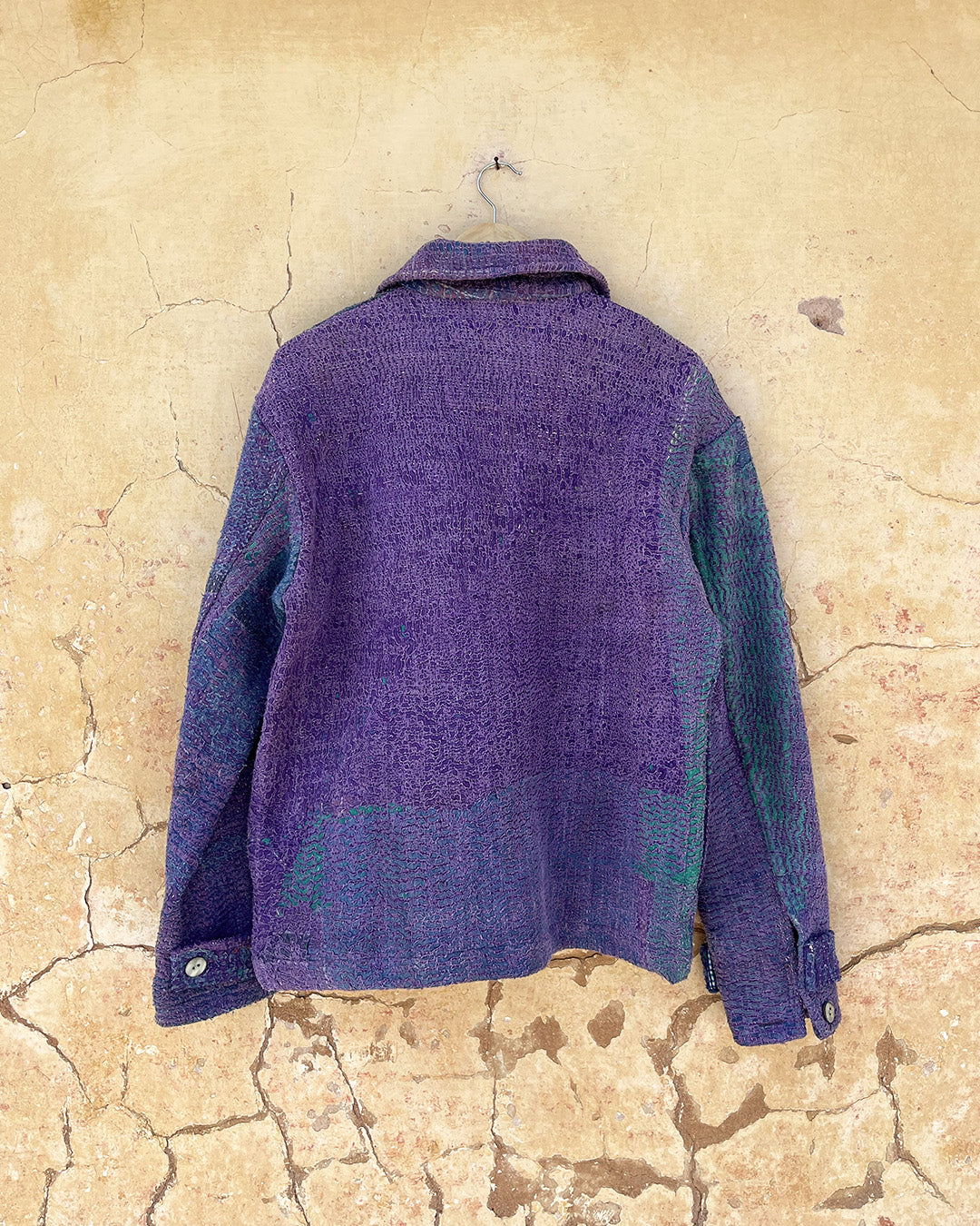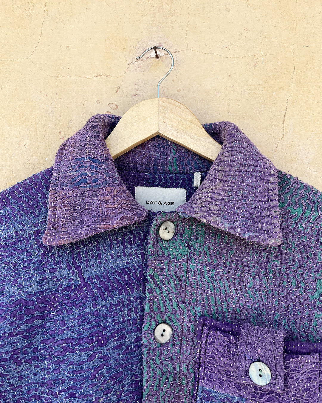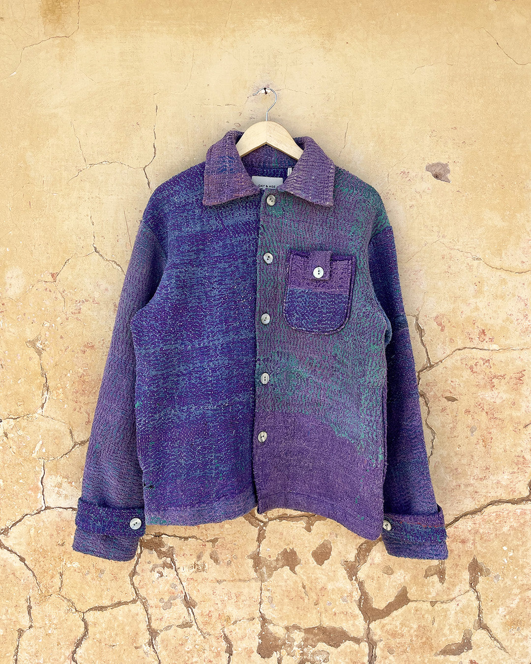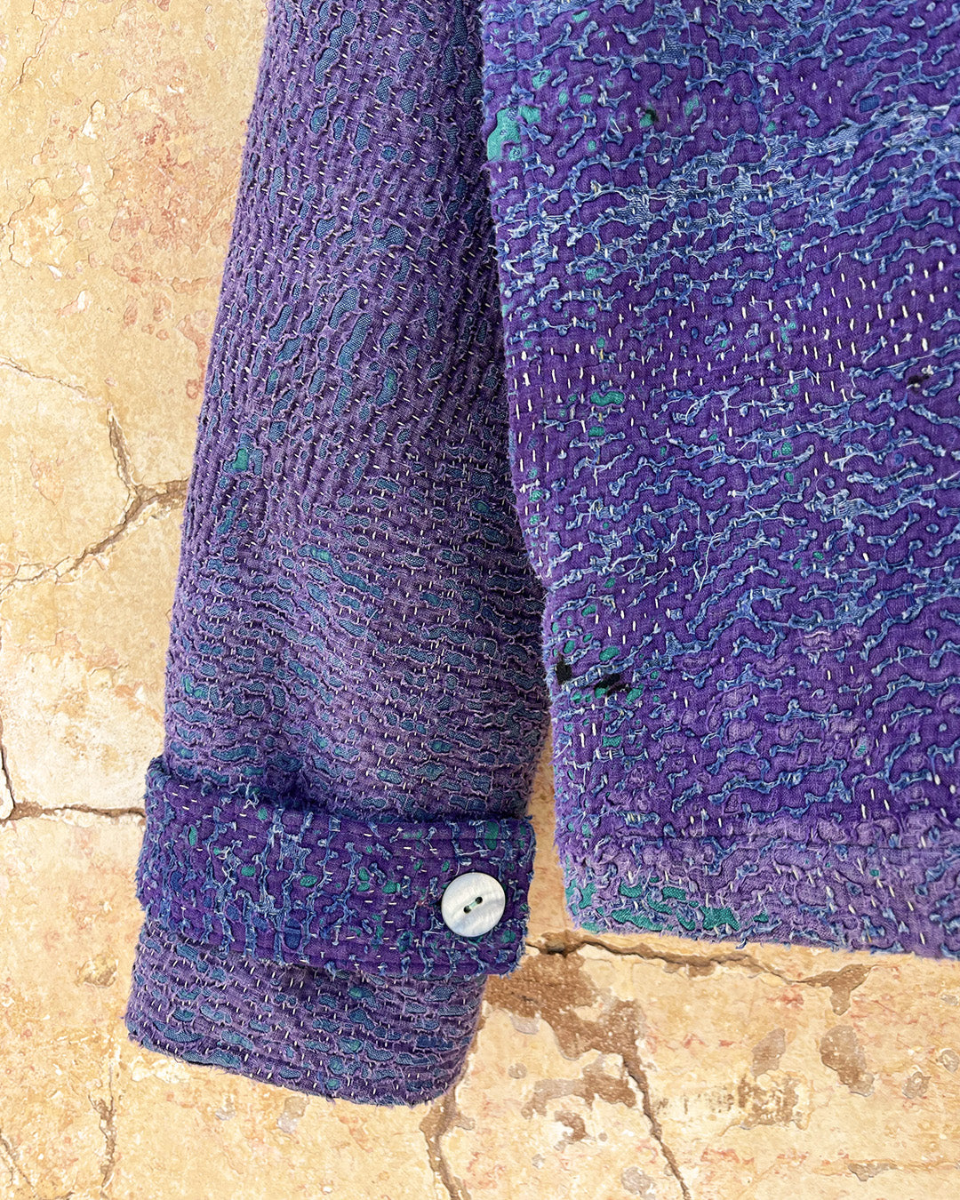 Kantha quilts are crafted from repurposed saris and fabrics and feature repairs, darning, and patchwork. These unique details not only add character but ensure durable, one-of-a-kind garments with a rich up-cycling heritage. We embrace the distressed patches alongside the intricate stitch work in the most unlikely colours.