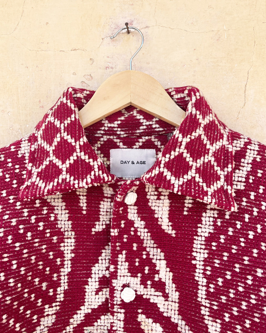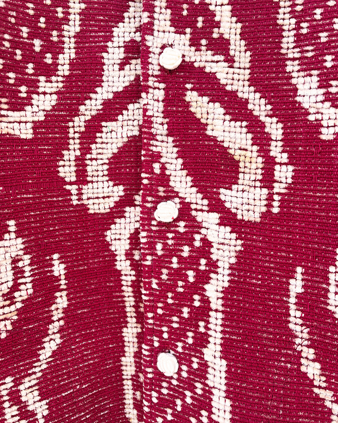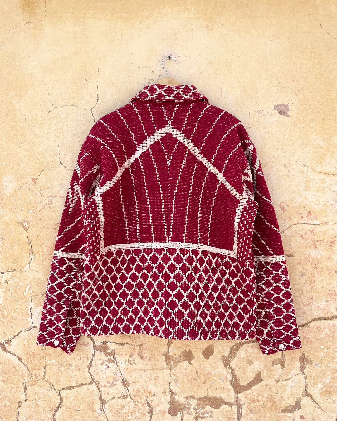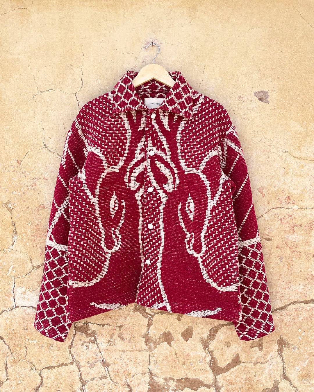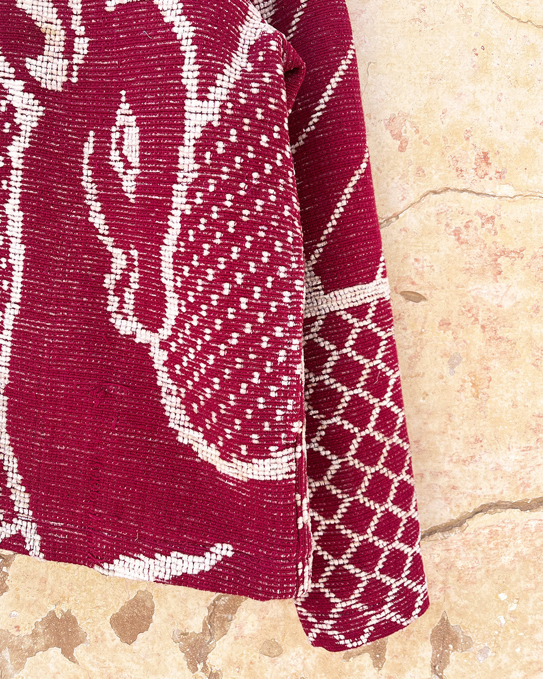 This garment is made from a vintage handwoven jacquard bedspread from India.
