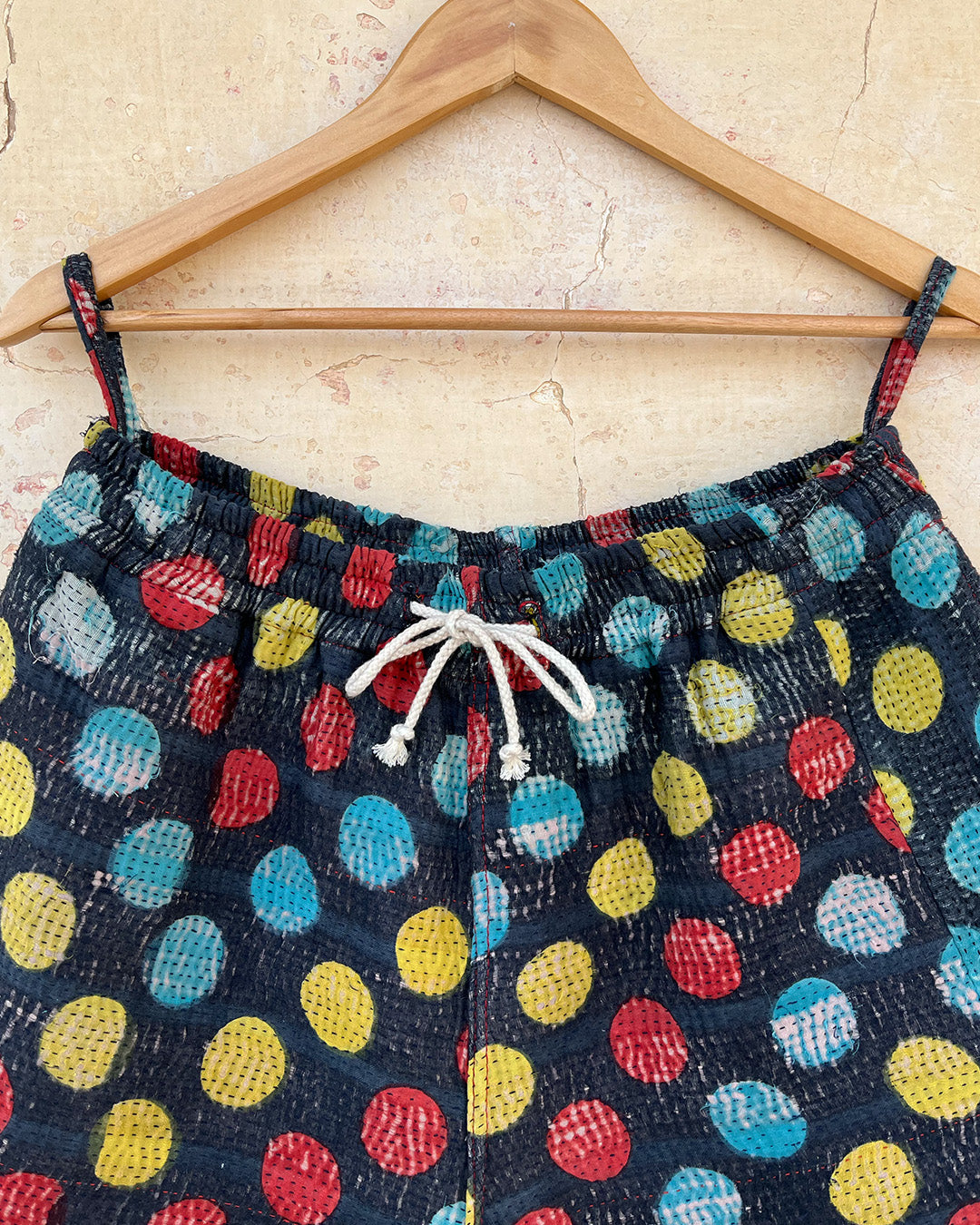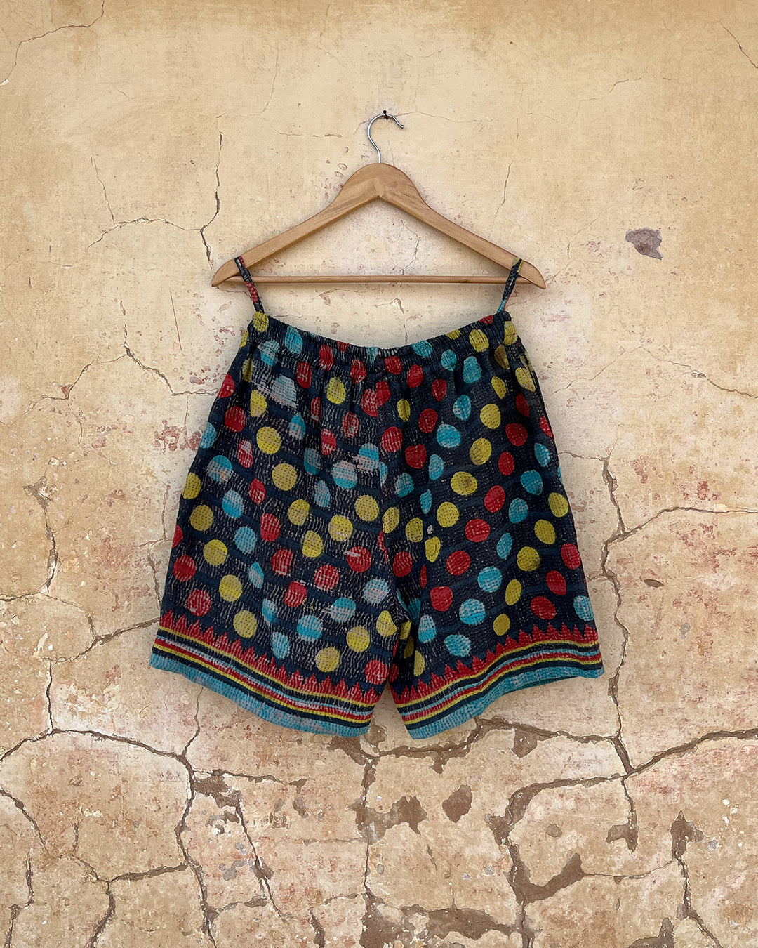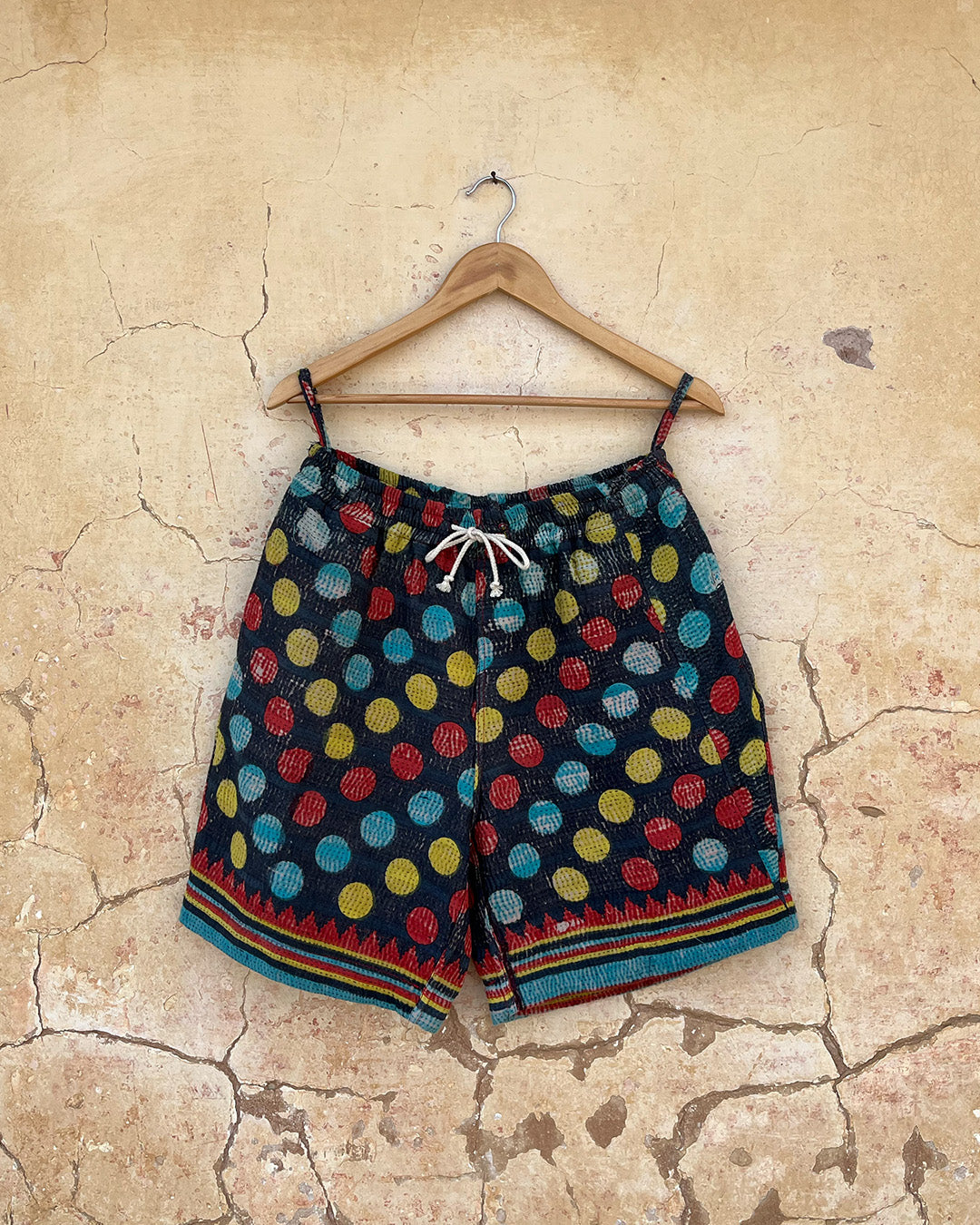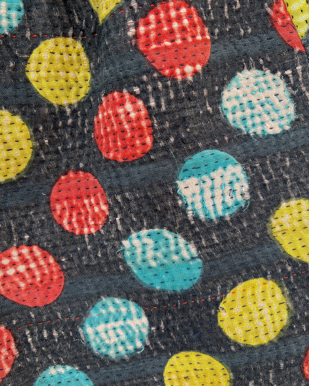 Kantha quilts are crafted from repurposed saris and fabrics and feature repairs, darning, and patchwork. These unique details not only add character but ensure durable, one-of-a-kind garments with a rich up-cycling heritage. We embrace the distressed patches alongside the intricate stitch work in the most unlikely colours.