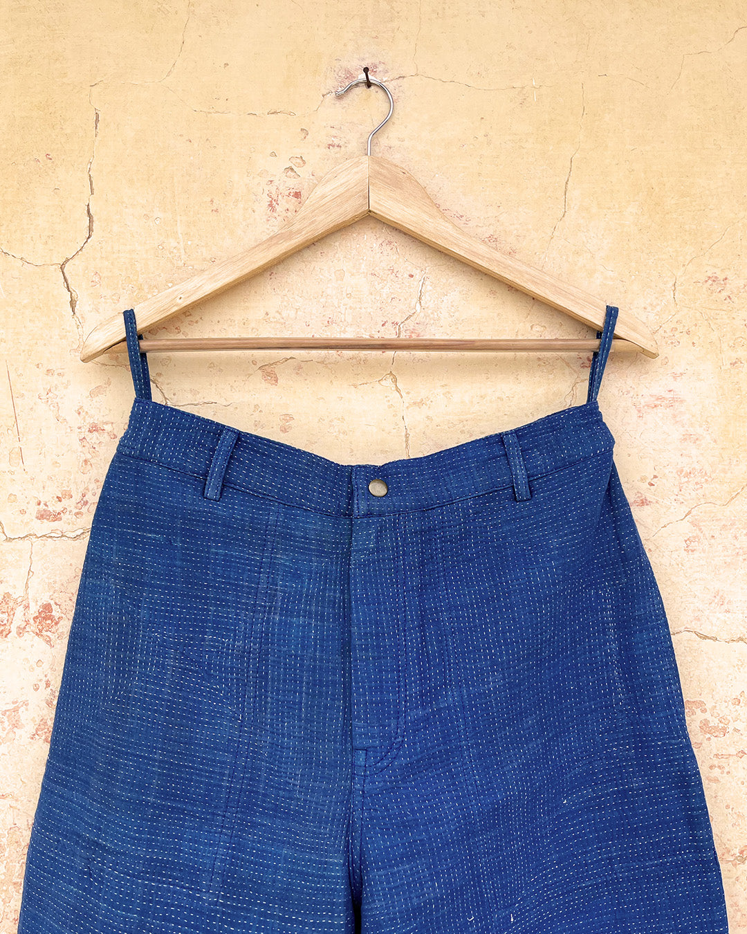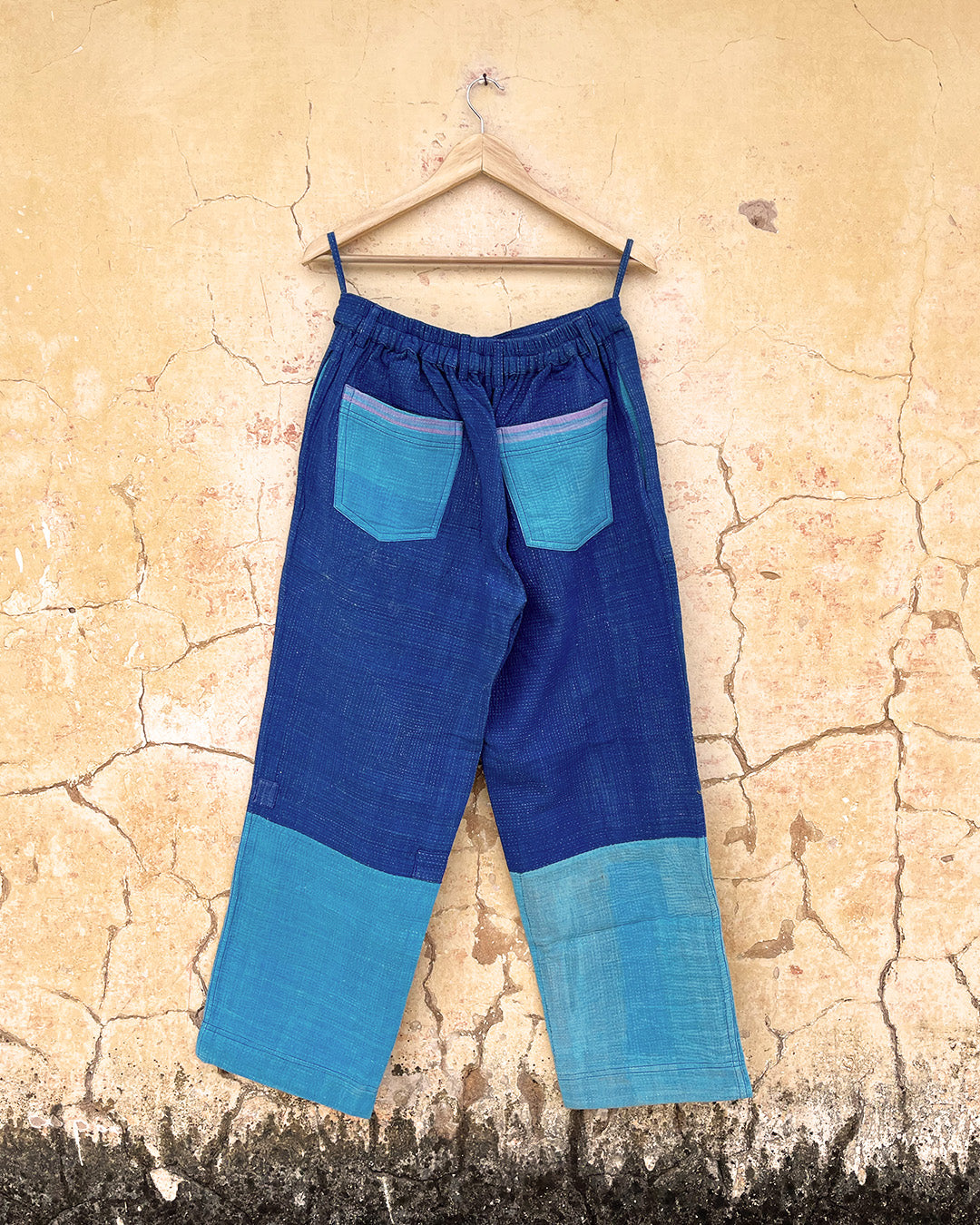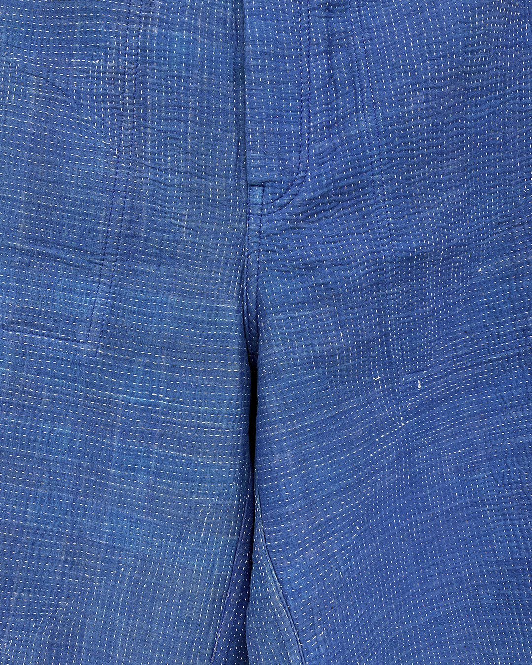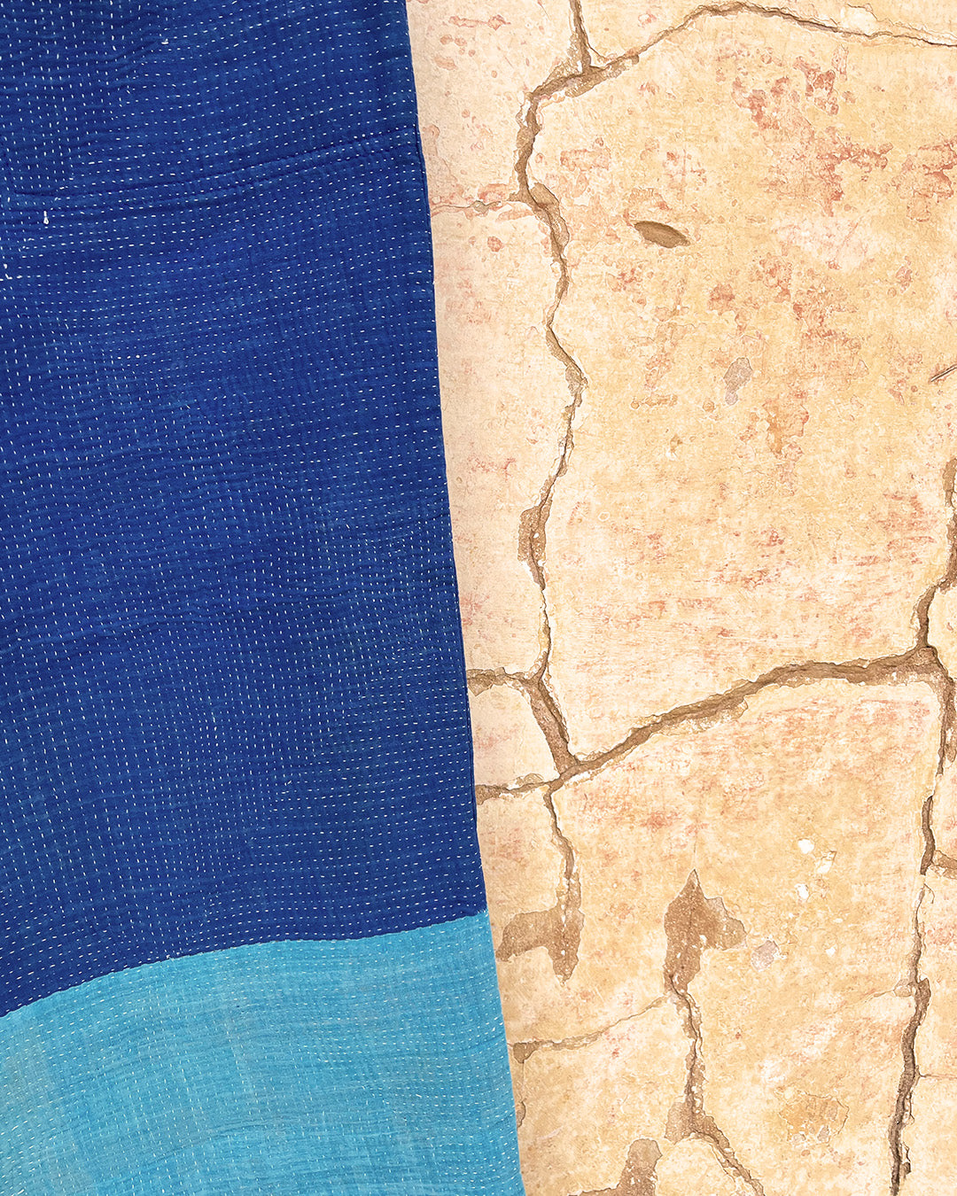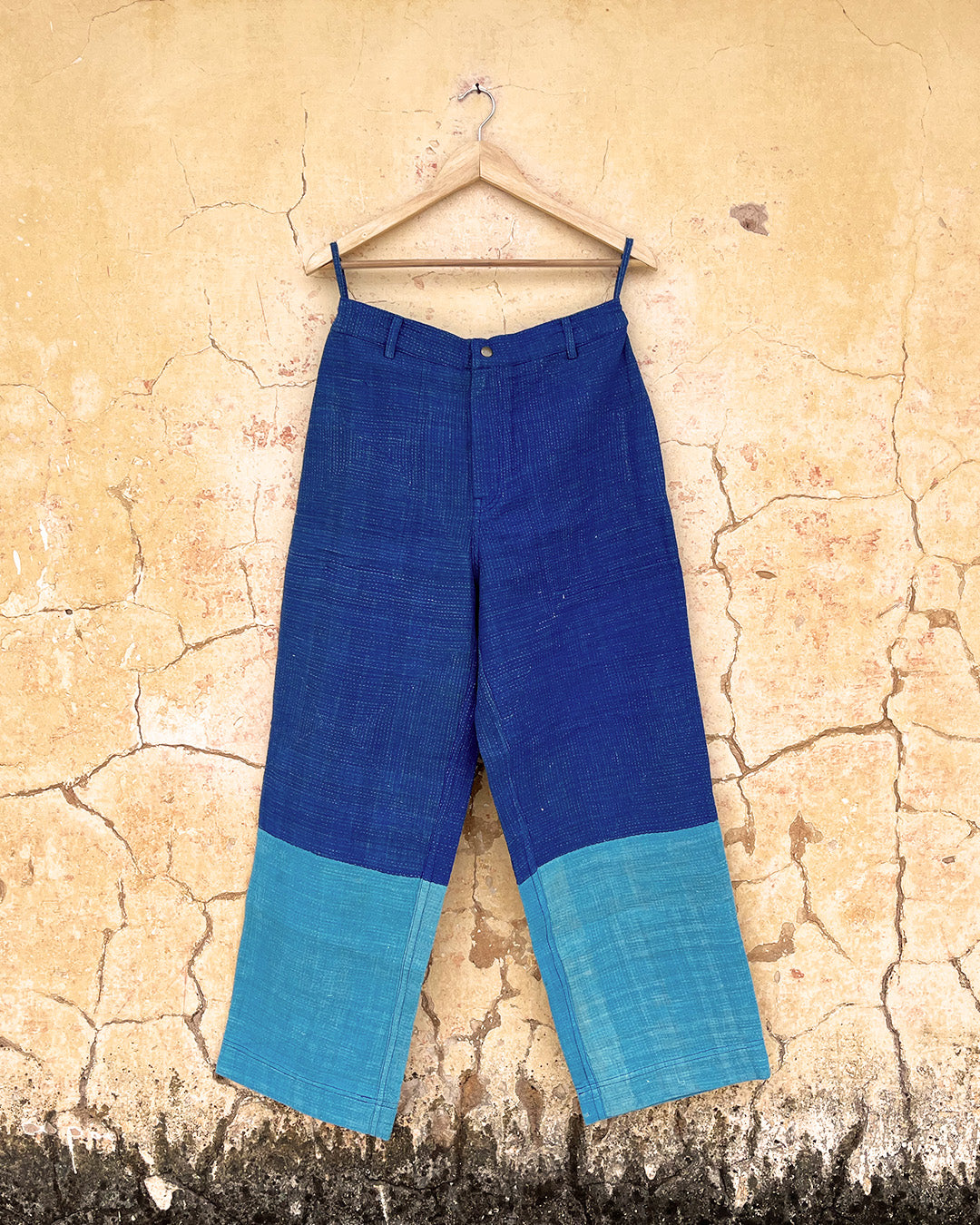 Kantha quilts are crafted from repurposed saris and fabrics and feature repairs, darning, and patchwork. These unique details not only add character but ensure durable, one-of-a-kind garments with a rich up-cycling heritage. We embrace the distressed patches alongside the intricate stitch work in the most unlikely colours.