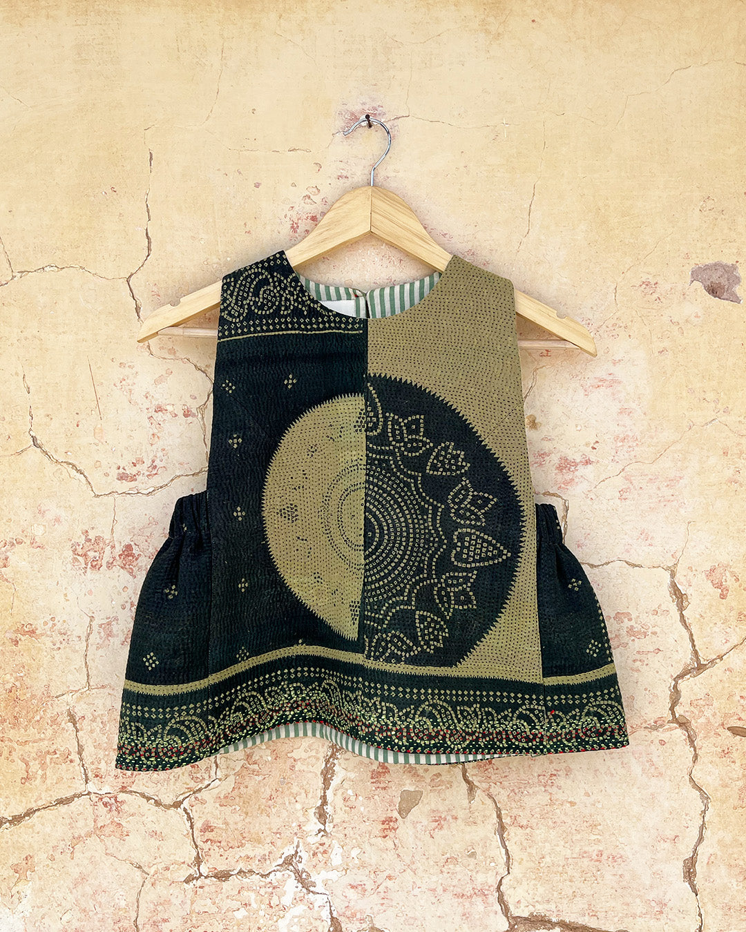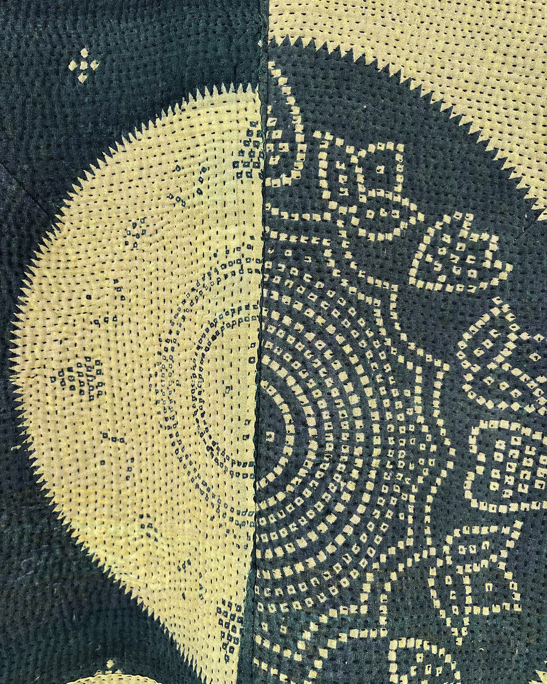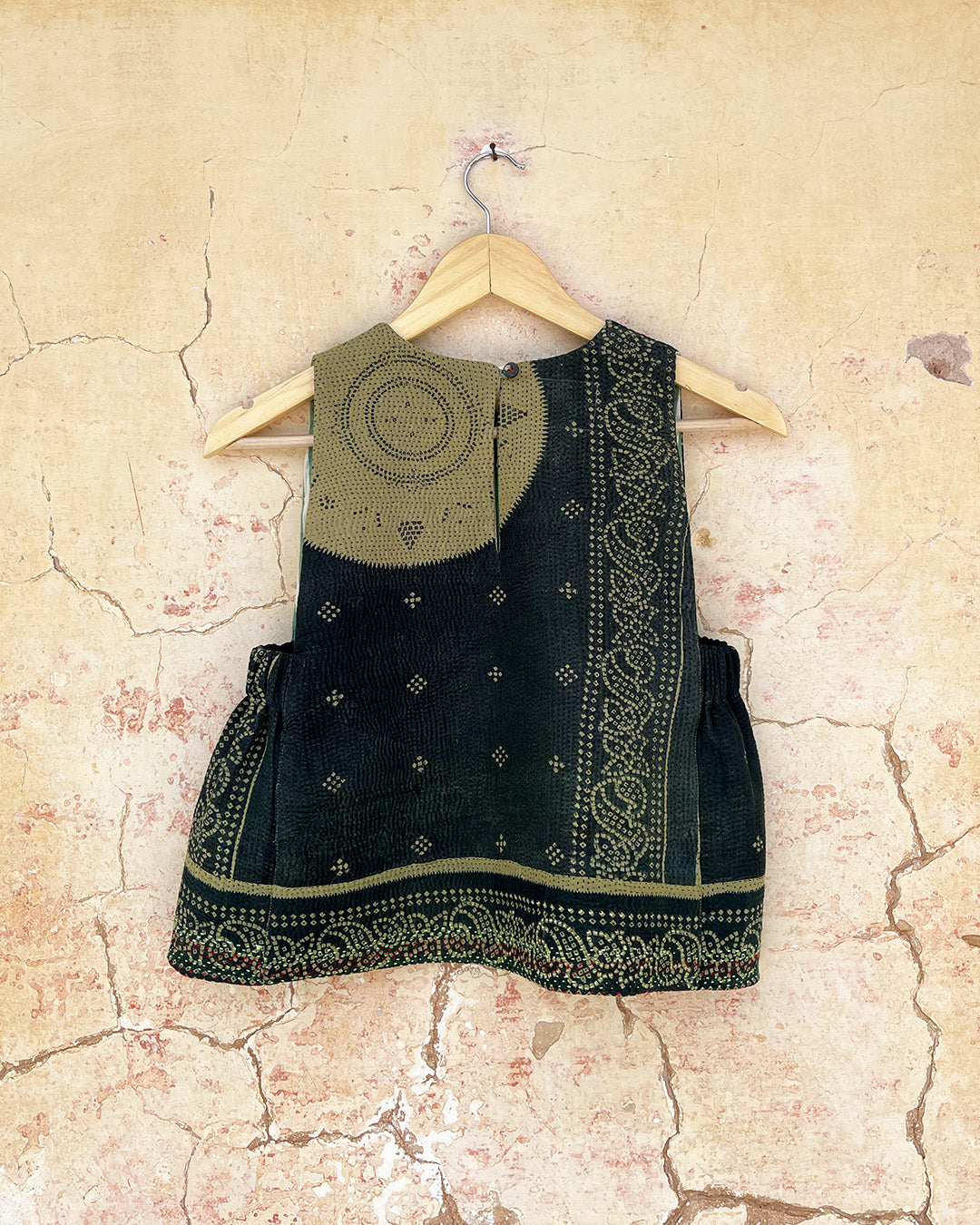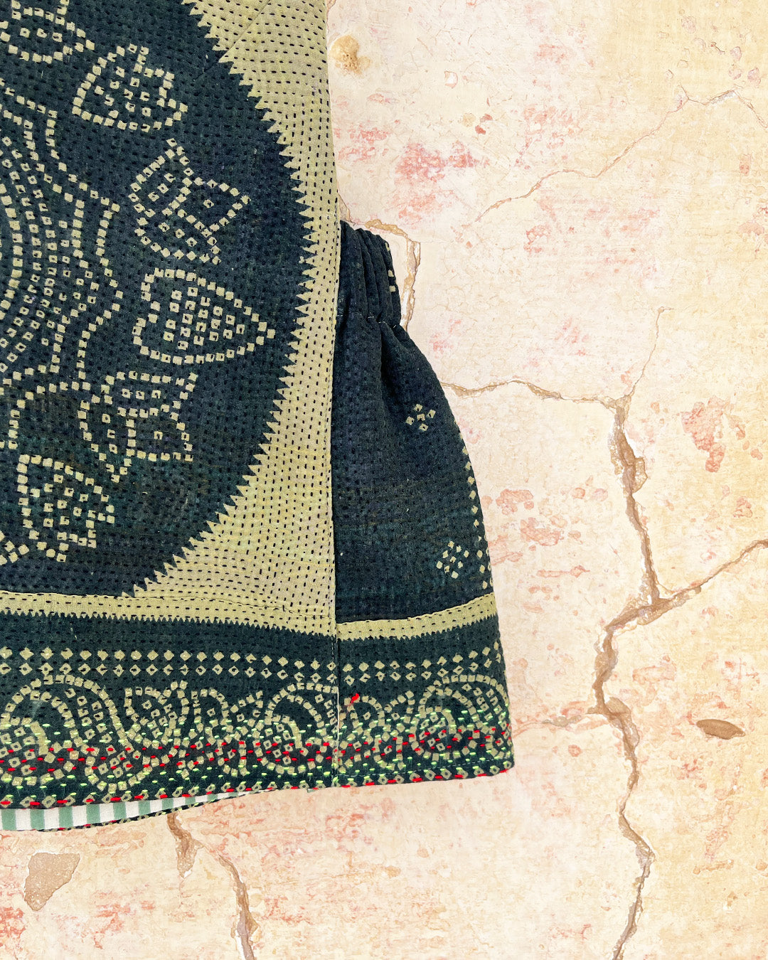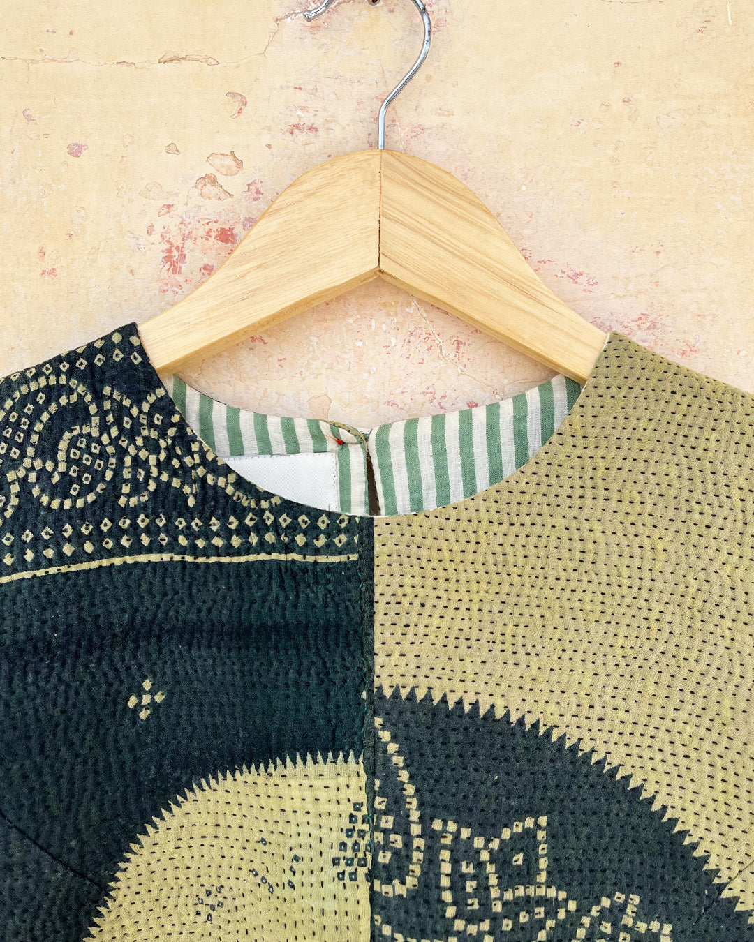 Kantha quilts are crafted from repurposed saris and fabrics and feature repairs, darning, and patchwork. These unique details not only add character but ensure durable, one-of-a-kind garments with a rich up-cycling heritage. We embrace the distressed patches alongside the intricate stitch work in the most unlikely colours.
