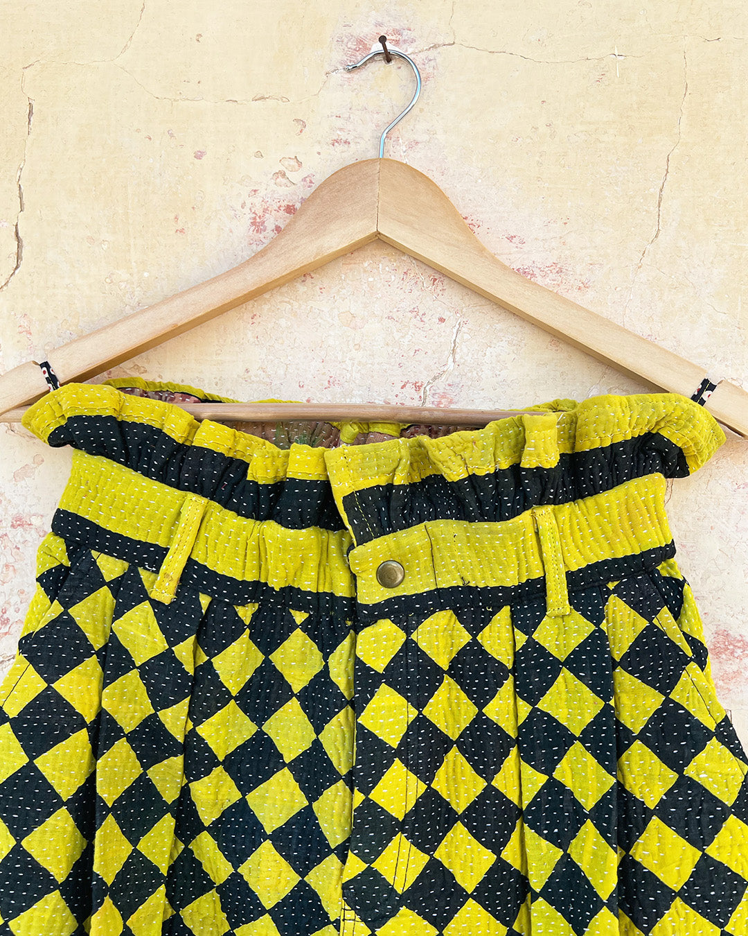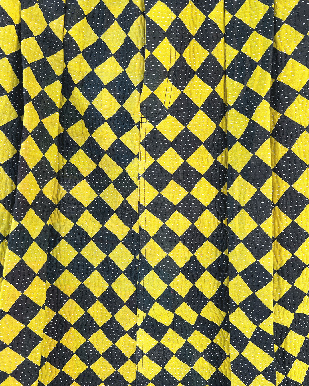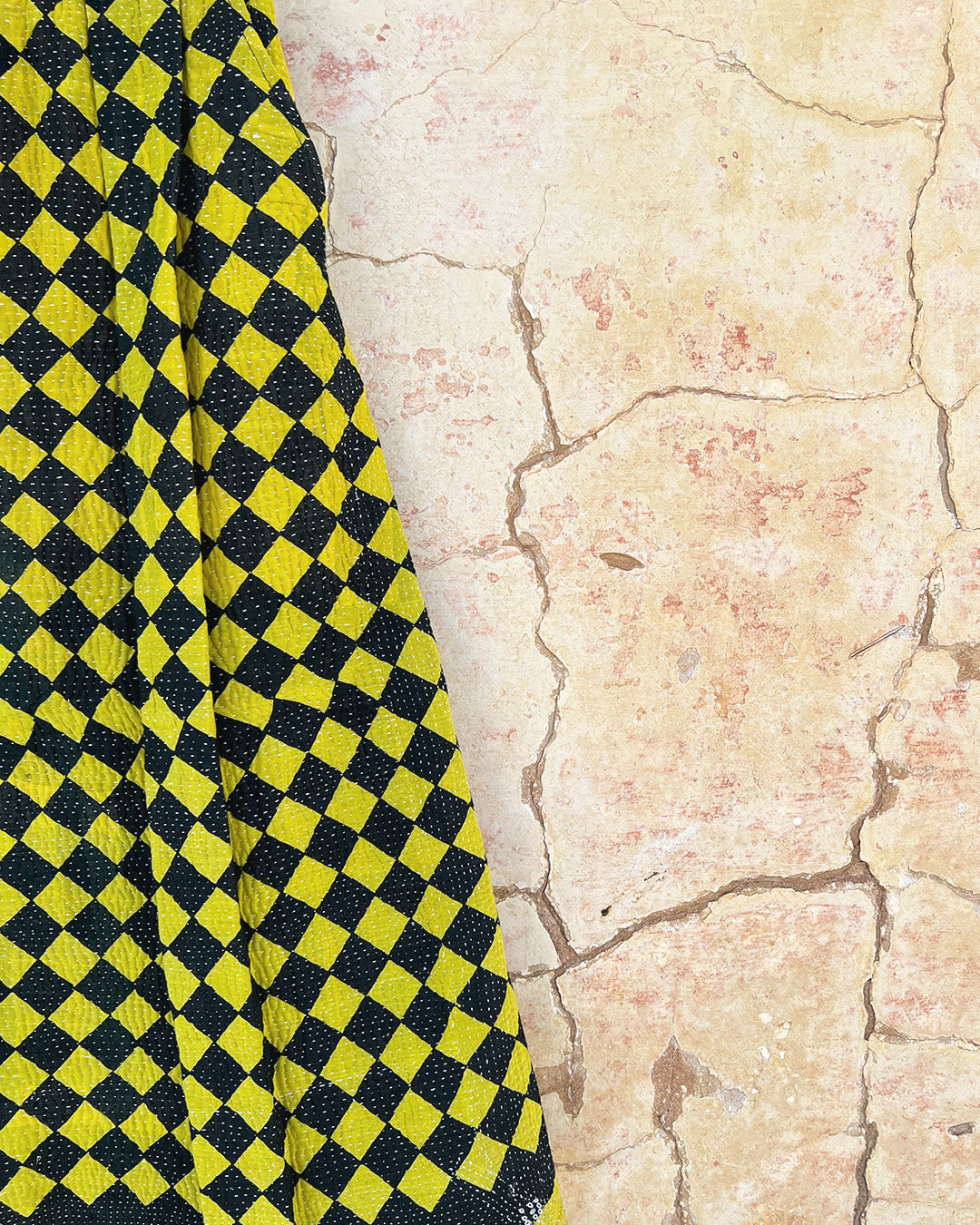 Kantha quilts are crafted from repurposed saris and fabrics and feature repairs, darning, and patchwork. These unique details not only add character but ensure durable, one-of-a-kind garments with a rich up-cycling heritage. We embrace the distressed patches alongside the intricate stitch work in the most unlikely colours.
