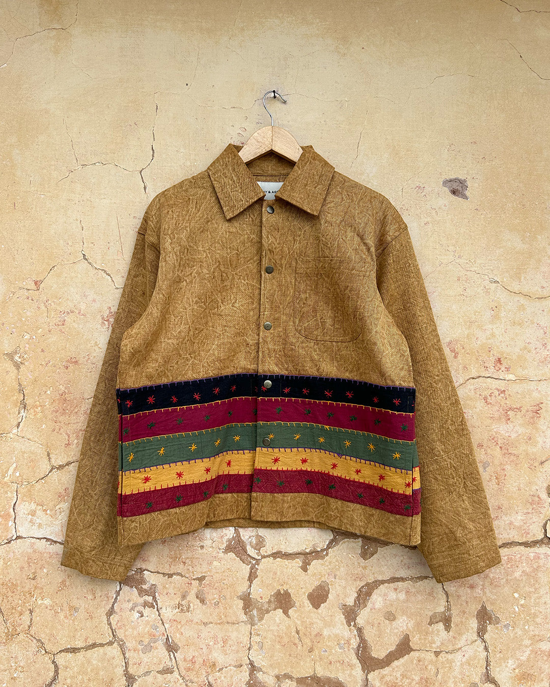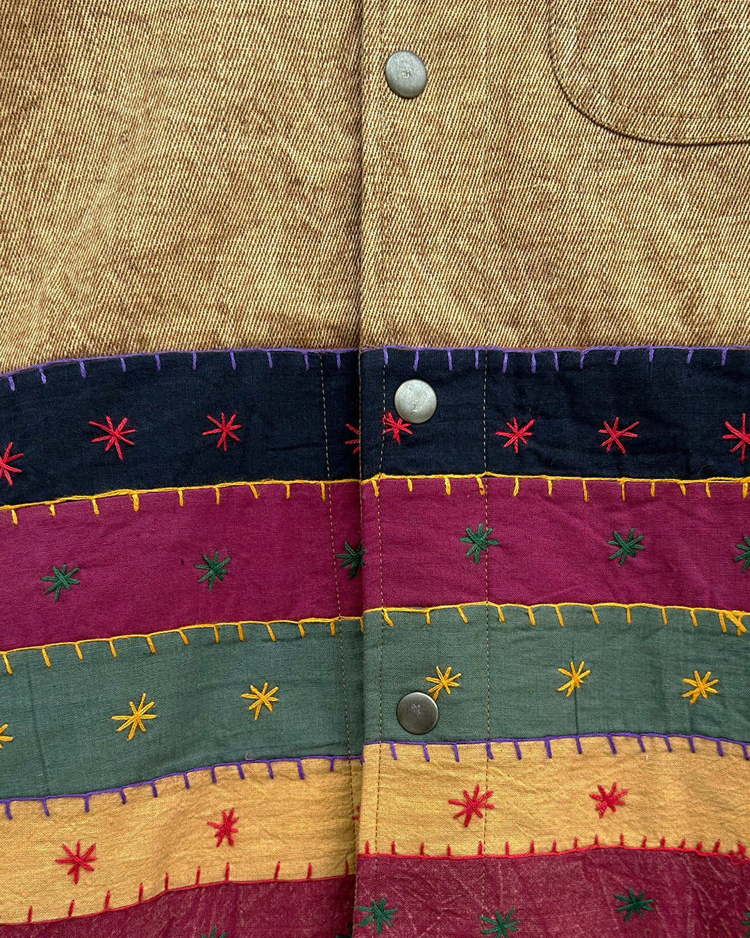 Garments of the Parallels Collection are made from one-of-a kind vintage patchwork bedspreads from Rajasthan. They feature multicolour strips and shapes patched together using blanket stitch and adorned with hand embroidered star-like motifs.