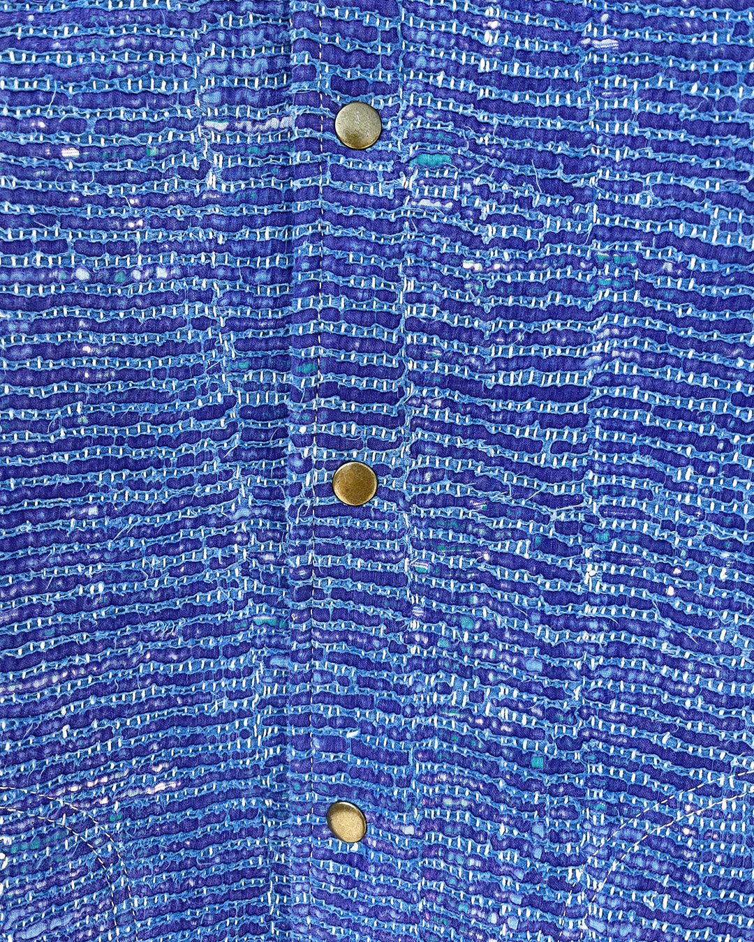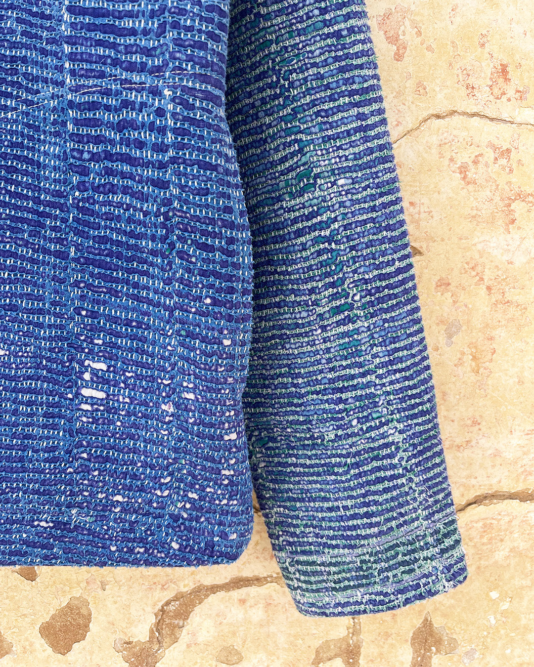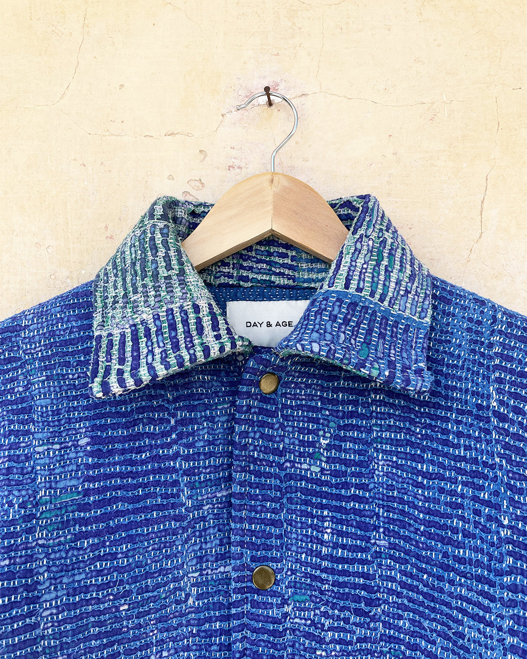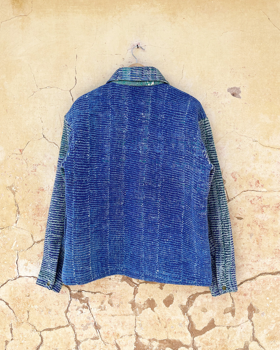 Kantha quilts are crafted from repurposed saris and fabrics and feature repairs, darning, and patchwork. These unique details not only add character but ensure durable, one-of-a-kind garments with a rich up-cycling heritage. We embrace the distressed patches alongside the intricate stitch work in the most unlikely colours.