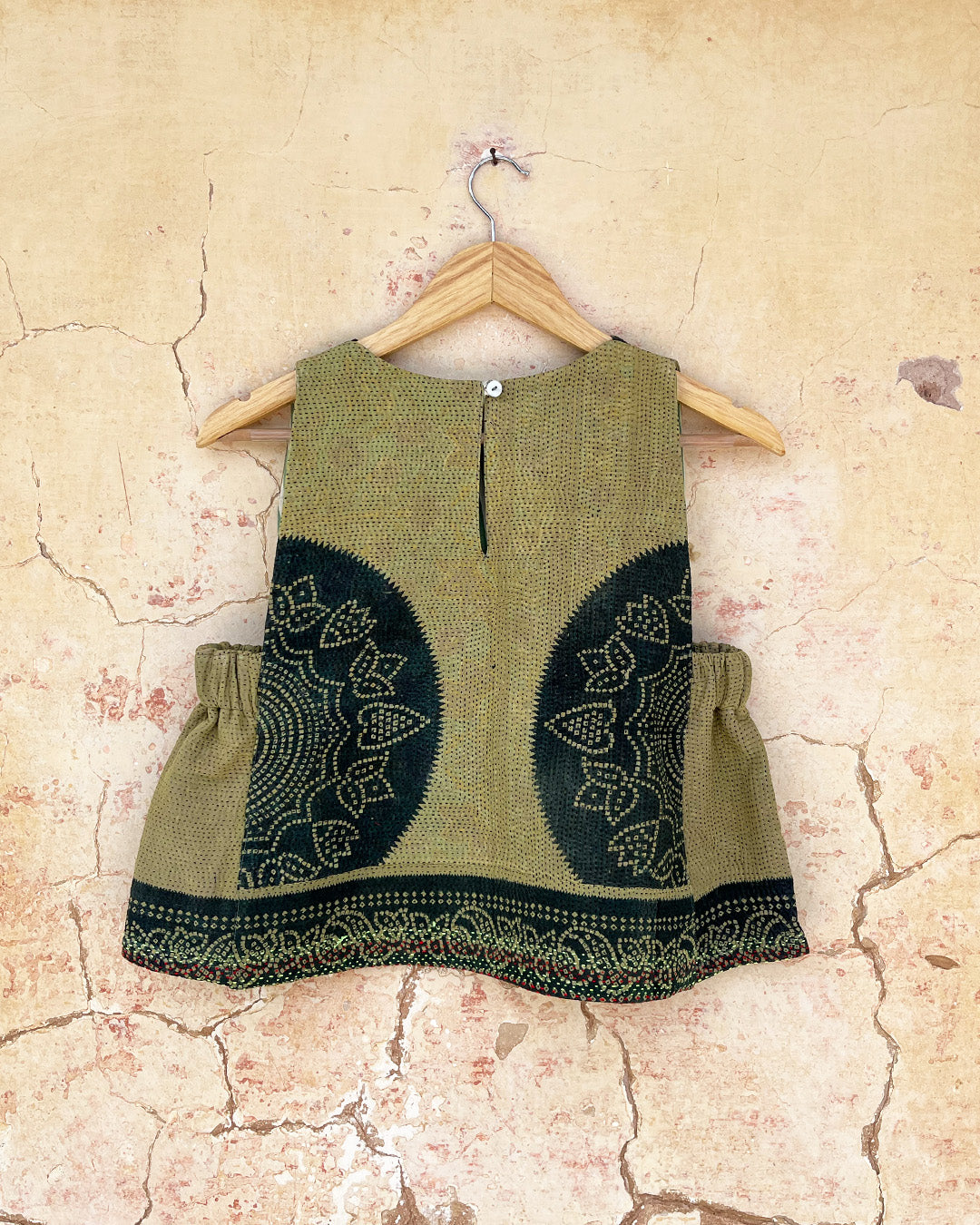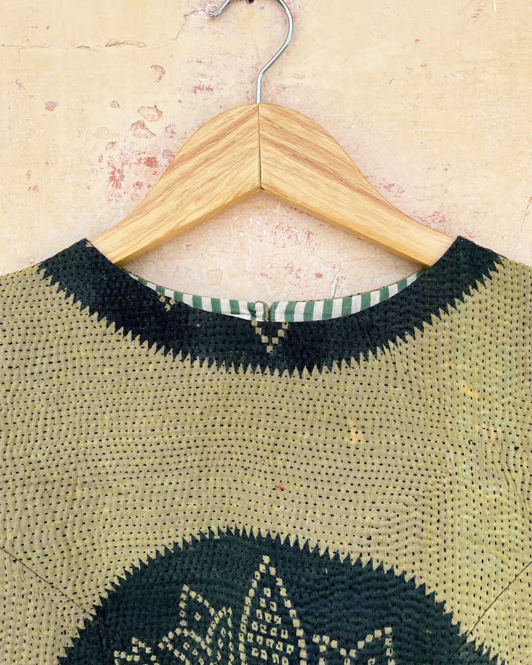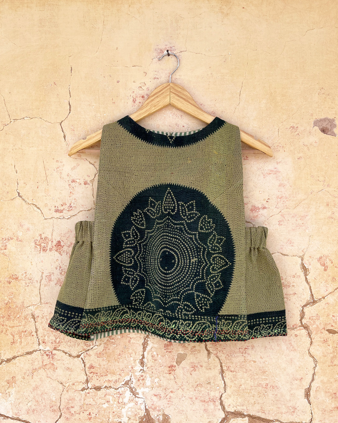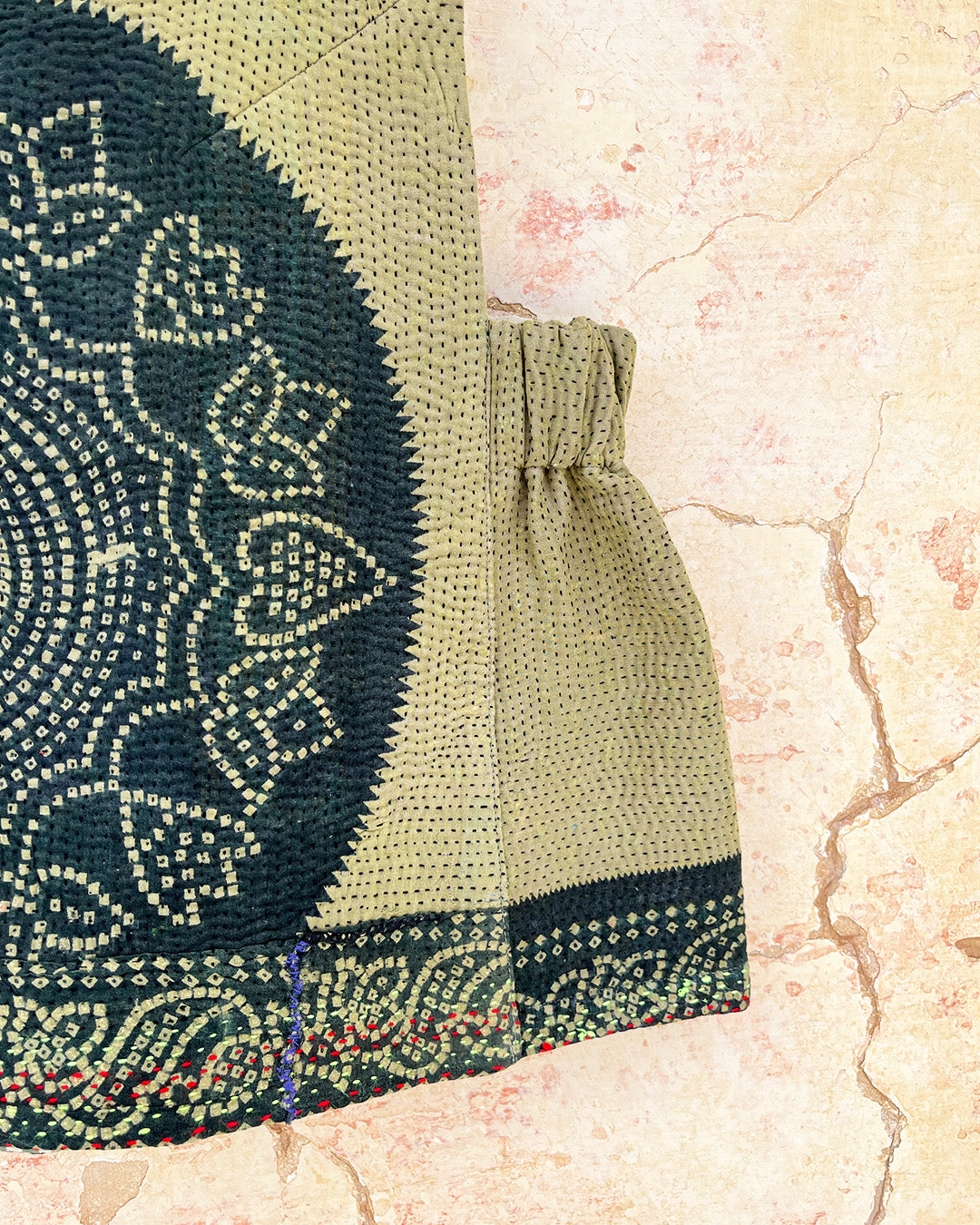 Kantha quilts are crafted from repurposed saris and fabrics and feature repairs, darning, and patchwork. These unique details not only add character but ensure durable, one-of-a-kind garments with a rich up-cycling heritage. We embrace the distressed patches alongside the intricate stitch work in the most unlikely colours.