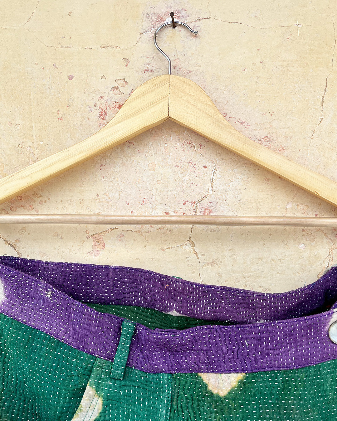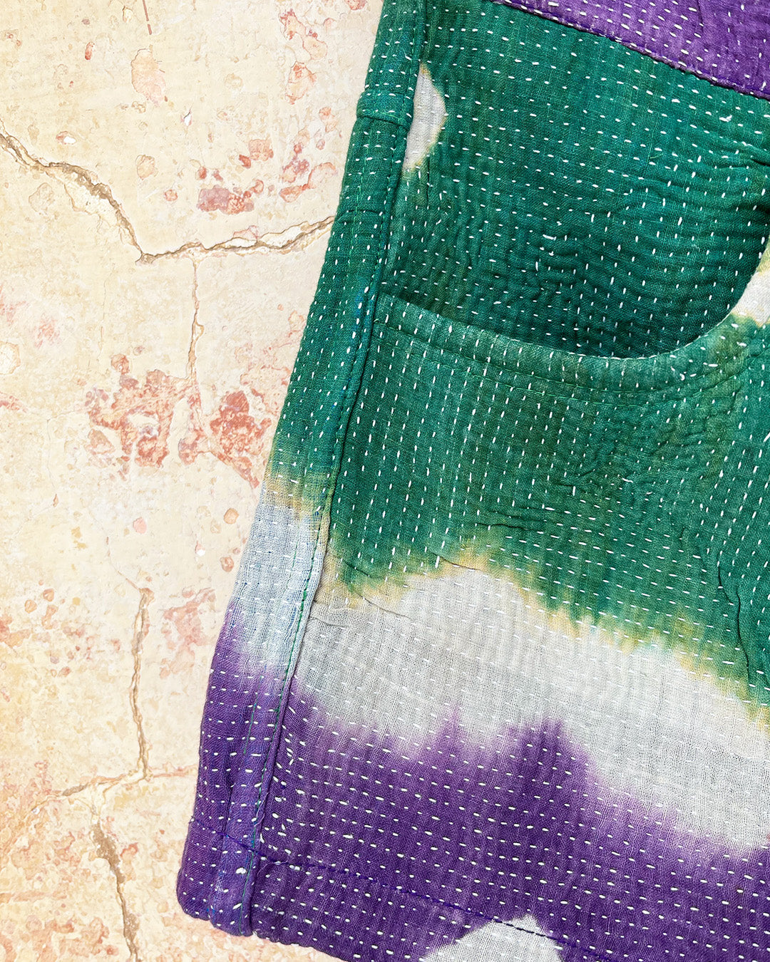 Kantha quilts are crafted from repurposed saris and fabrics and feature repairs, darning, and patchwork. These unique details not only add character but ensure durable, one-of-a-kind garments with a rich up-cycling heritage. We embrace the distressed patches alongside the intricate stitch work in the most unlikely colours.