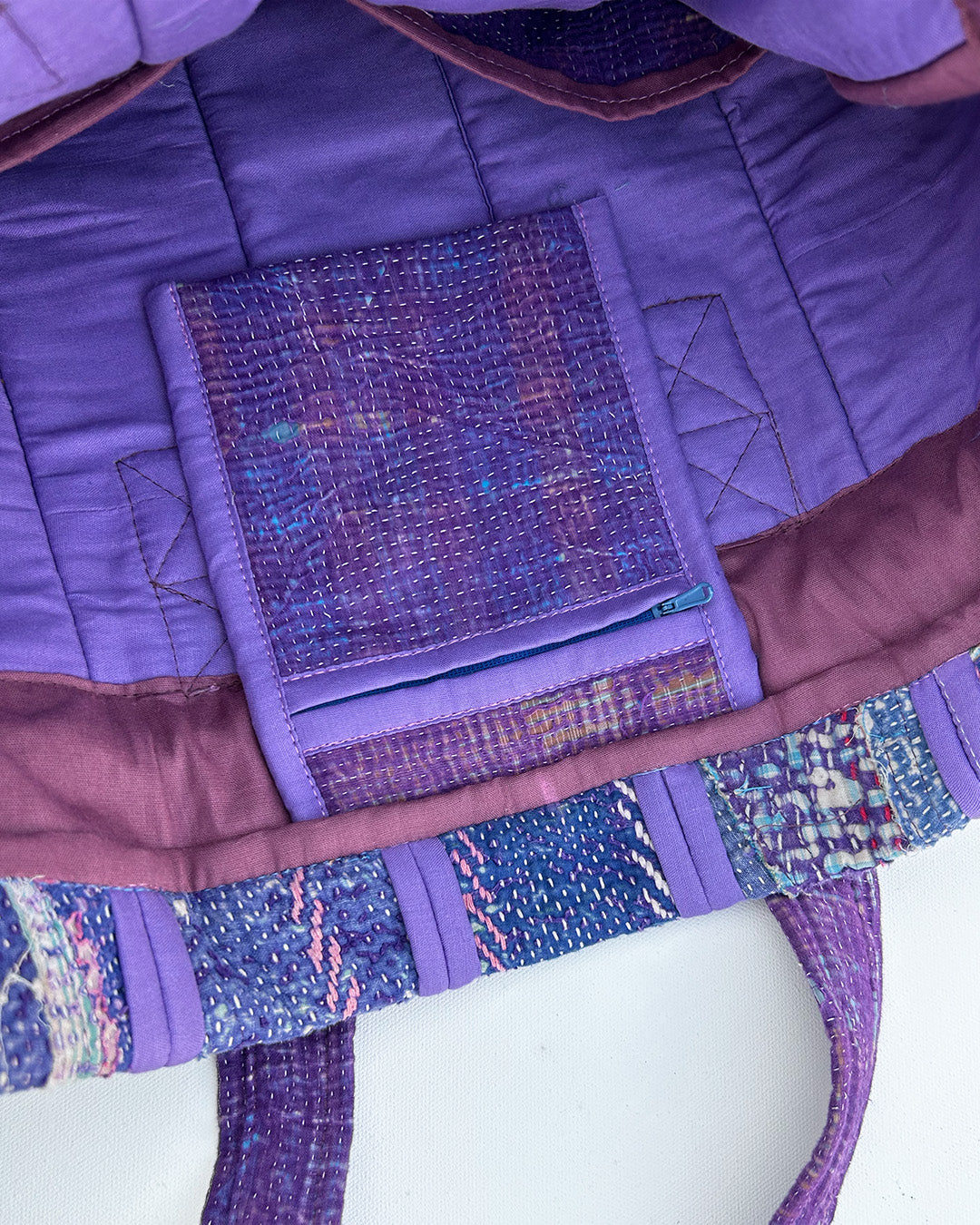Kantha quilts are crafted from repurposed saris and fabrics and feature repairs, darning, and patchwork. These unique details not only add character but ensure durable, one-of-a-kind garments with a rich up-cycling heritage. We embrace the distressed patches alongside the intricate stitch work in the most unlikely colours.