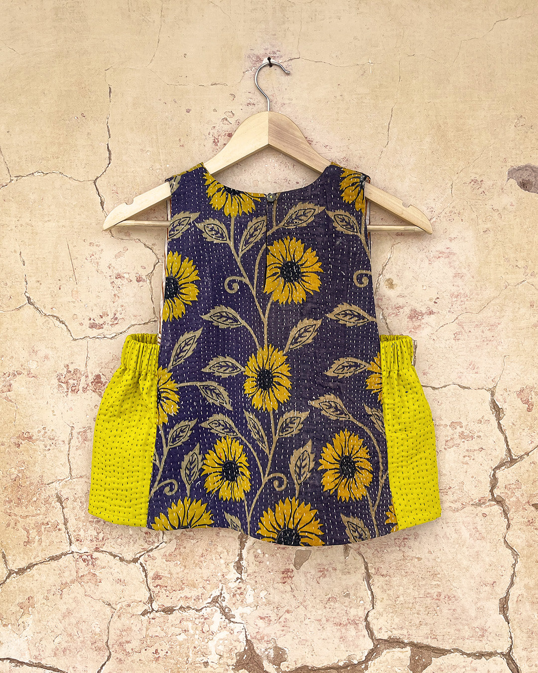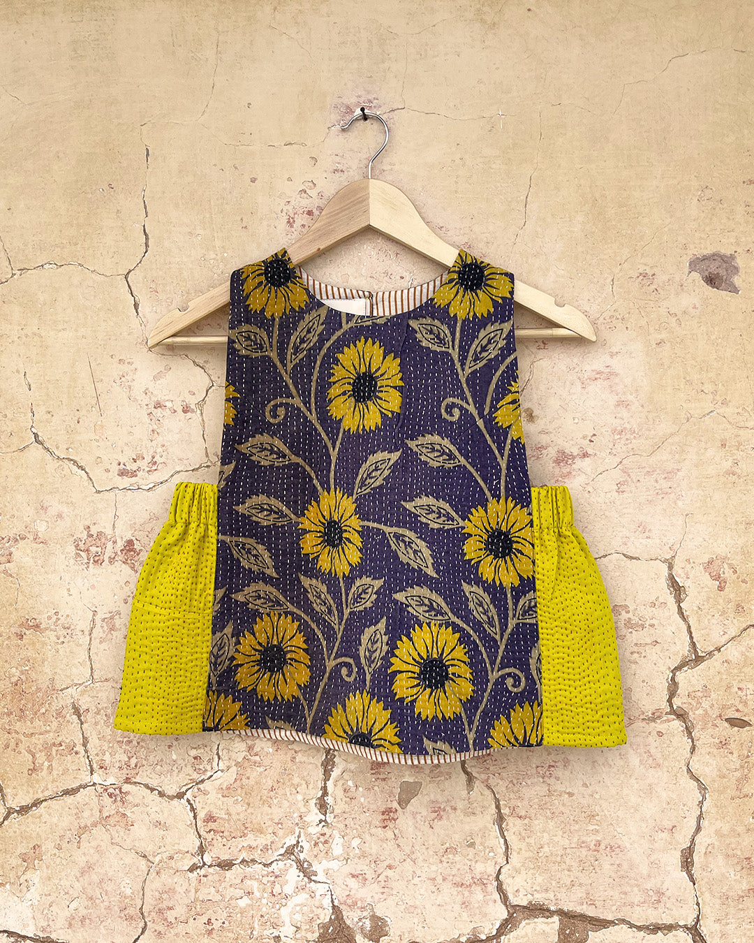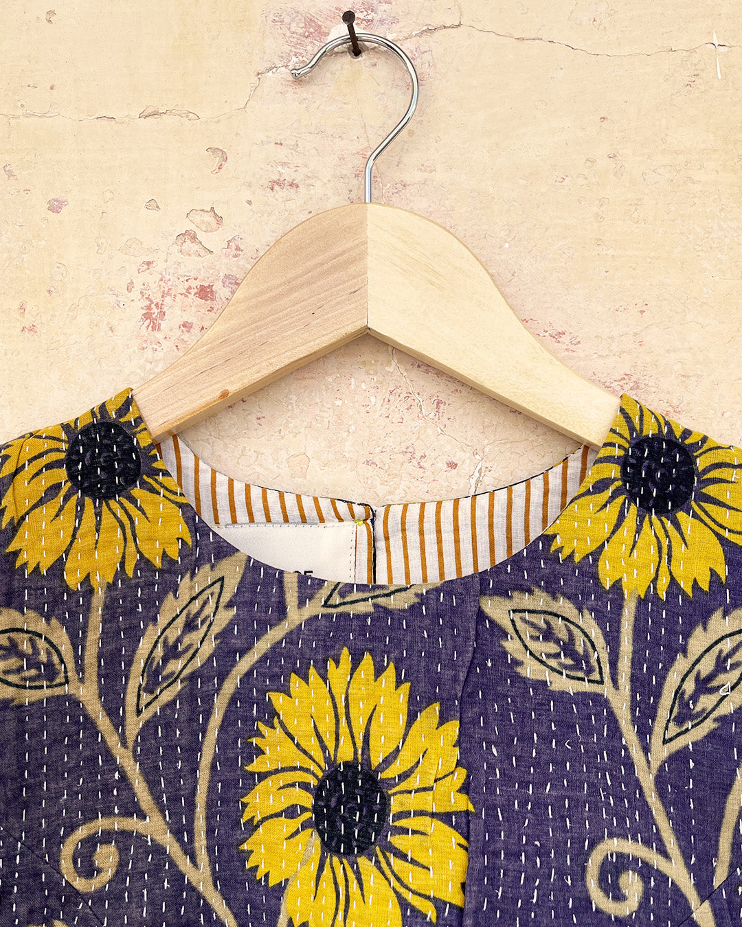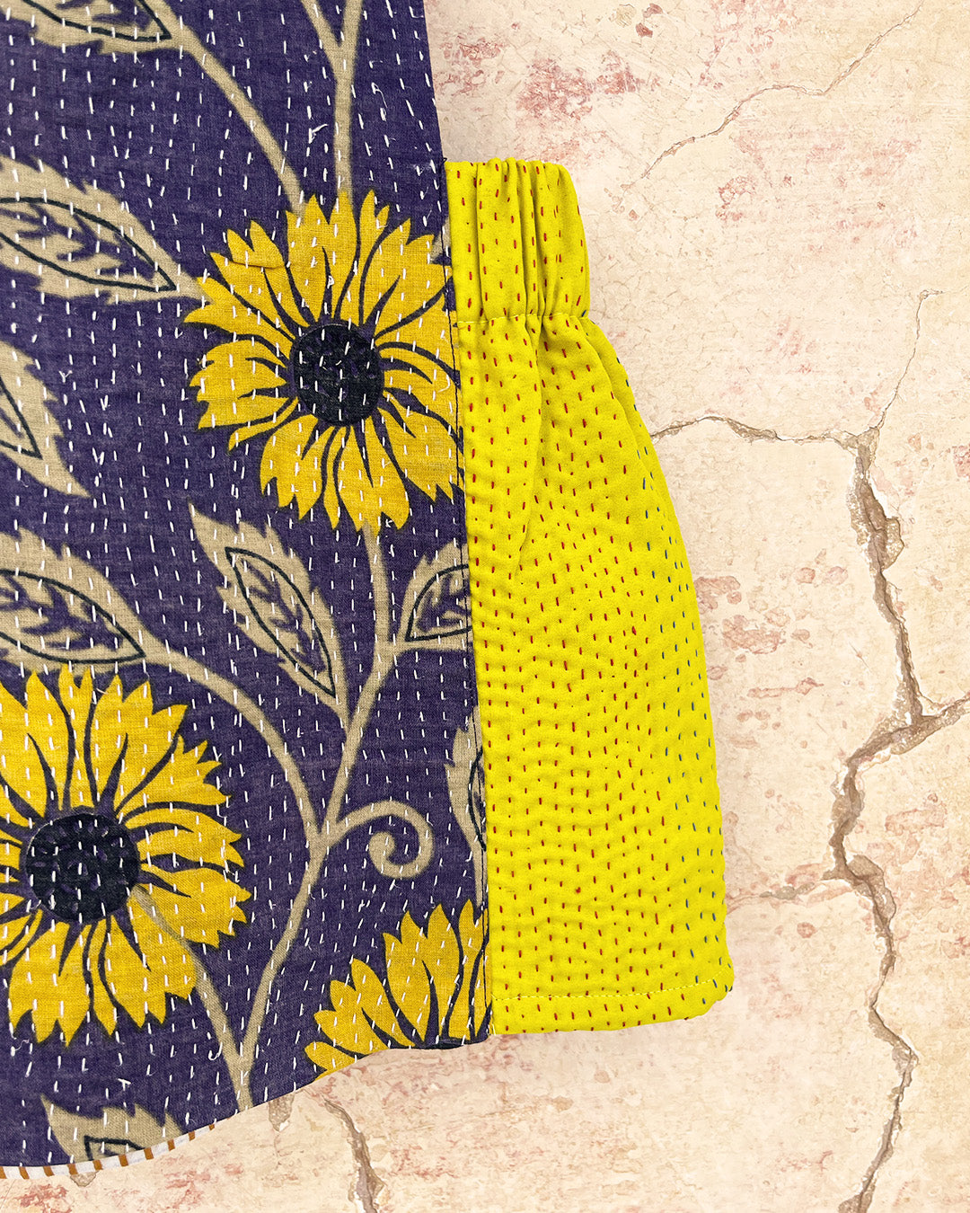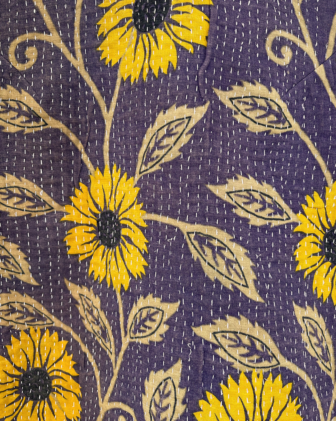 Kantha quilts are crafted from repurposed saris and fabrics and feature repairs, darning, and patchwork. These unique details not only add character but ensure durable, one-of-a-kind garments with a rich up-cycling heritage. We embrace the distressed patches alongside the intricate stitch work in the most unlikely colours.