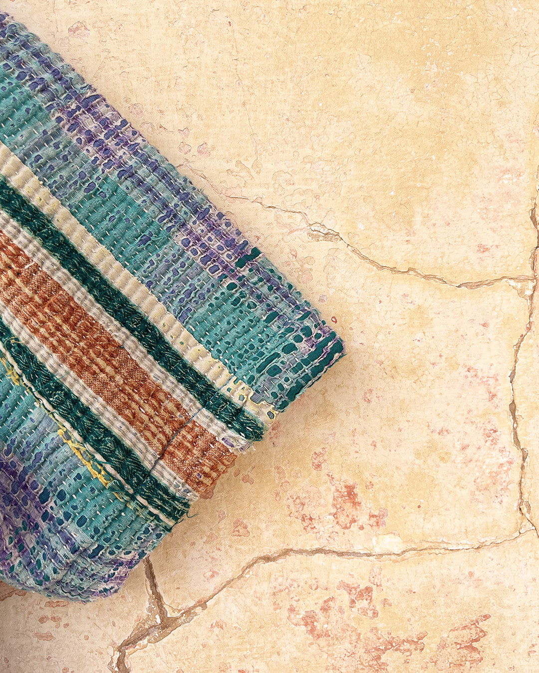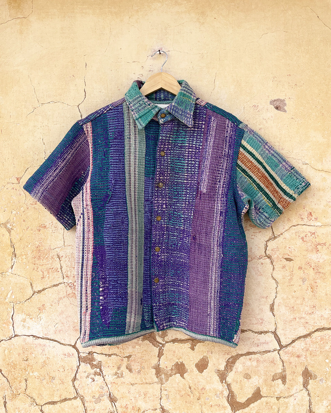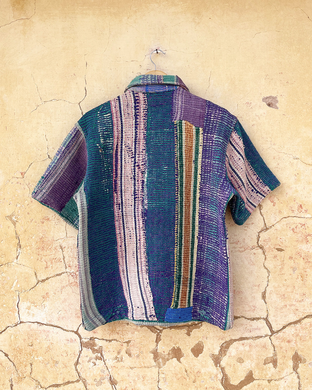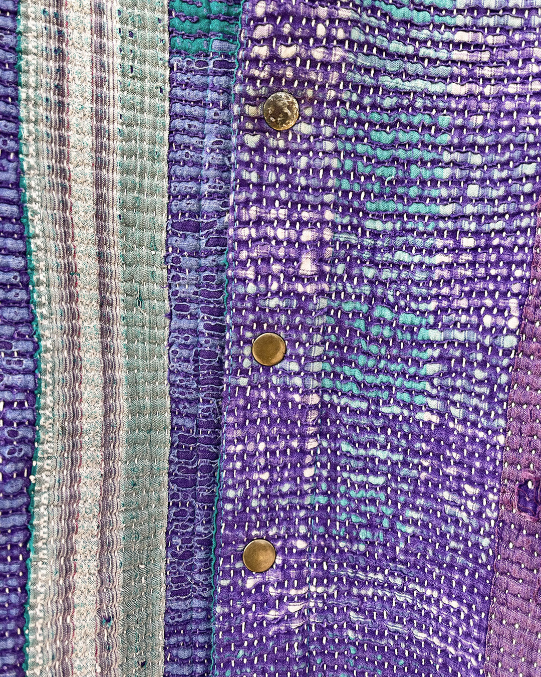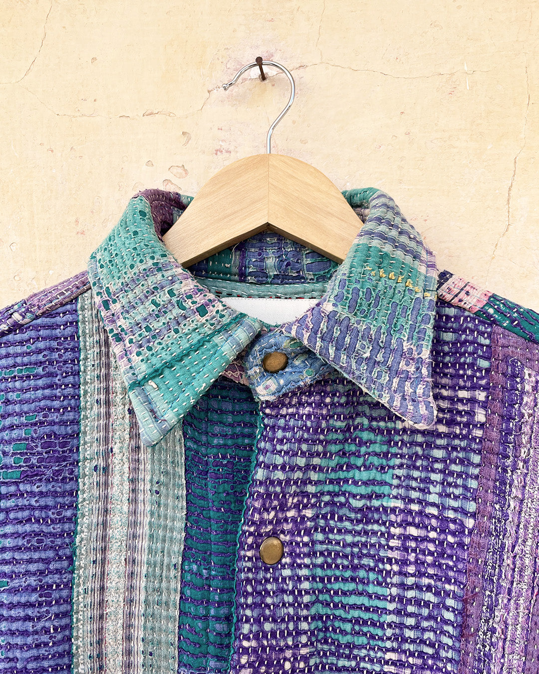 These are made from Kantha quilts where repurposed tie-dyed saris and fabrics have been used. These quilts feature repairs, darning, and patchwork. These unique details not only add character but ensure durable, one-of-a-kind garments with a rich up-cycling heritage. We embrace the distressed patches alongside the intricate stitch work in the most unlikely colours.