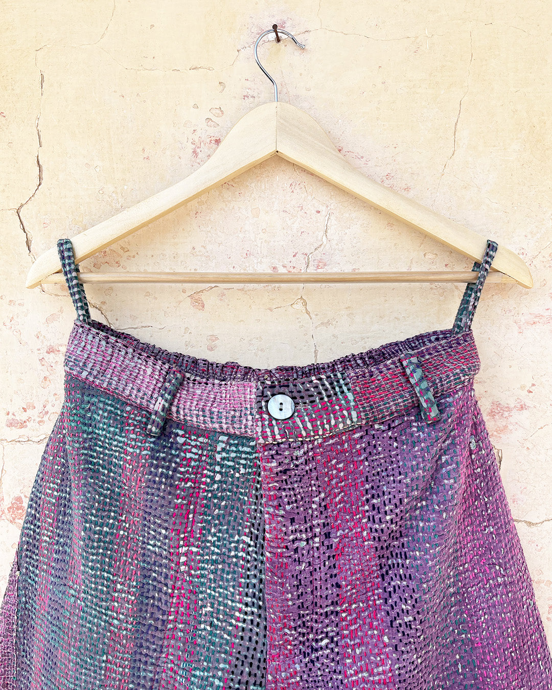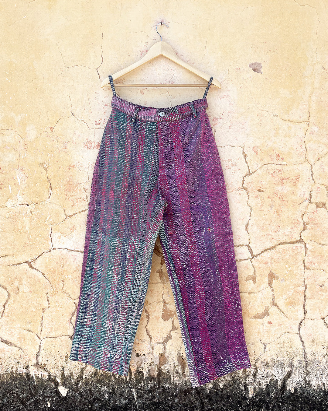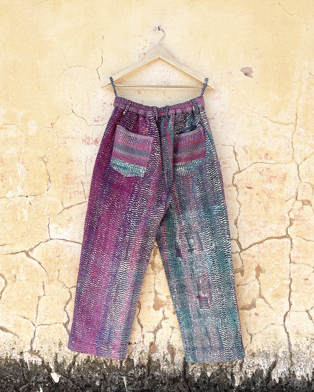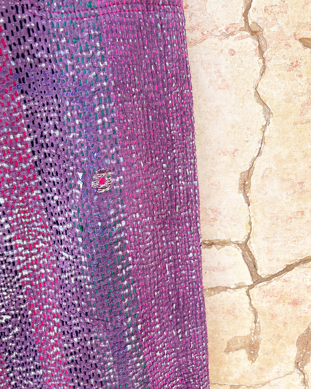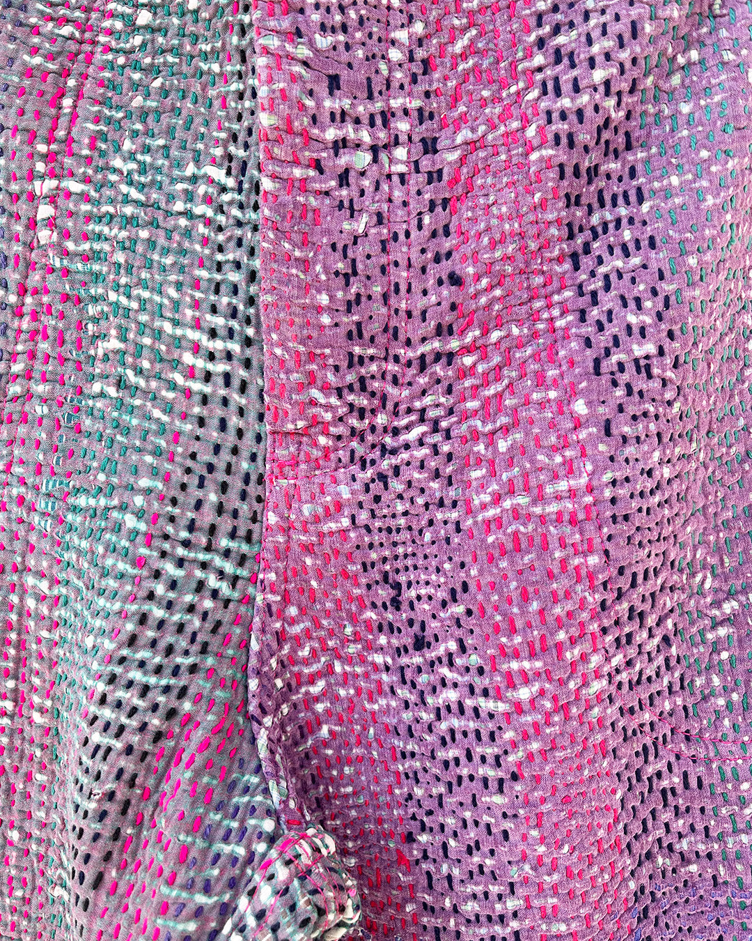 Kantha quilts are crafted from repurposed saris and fabrics and feature repairs, darning, and patchwork. These unique details not only add character but ensure durable, one-of-a-kind garments with a rich up-cycling heritage. We embrace the distressed patches alongside the intricate stitch work in the most unlikely colours.