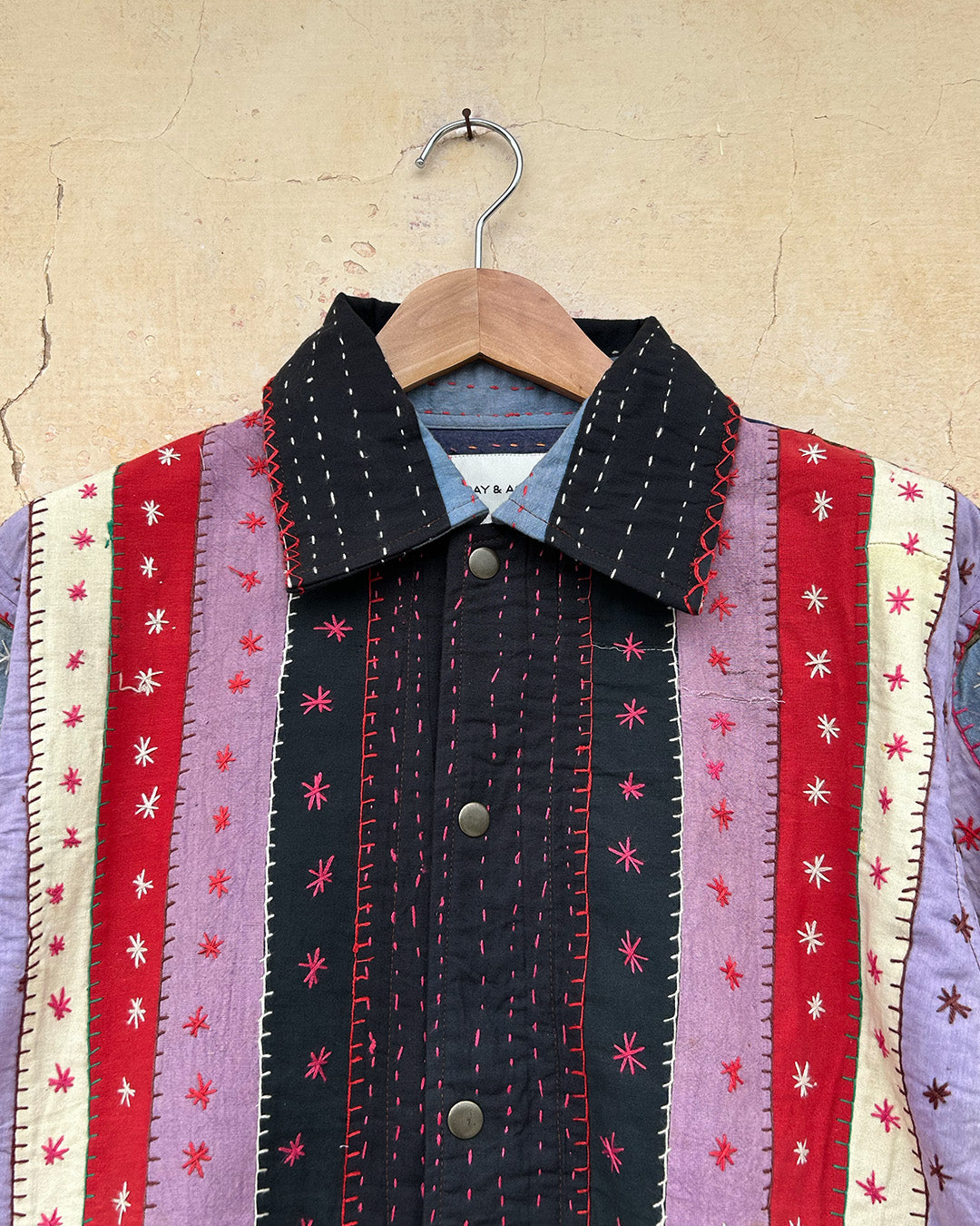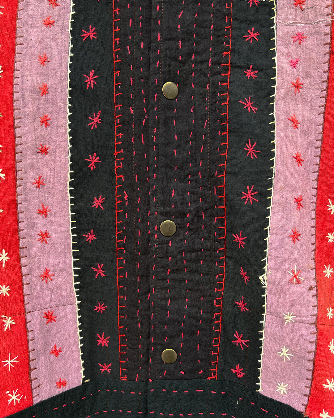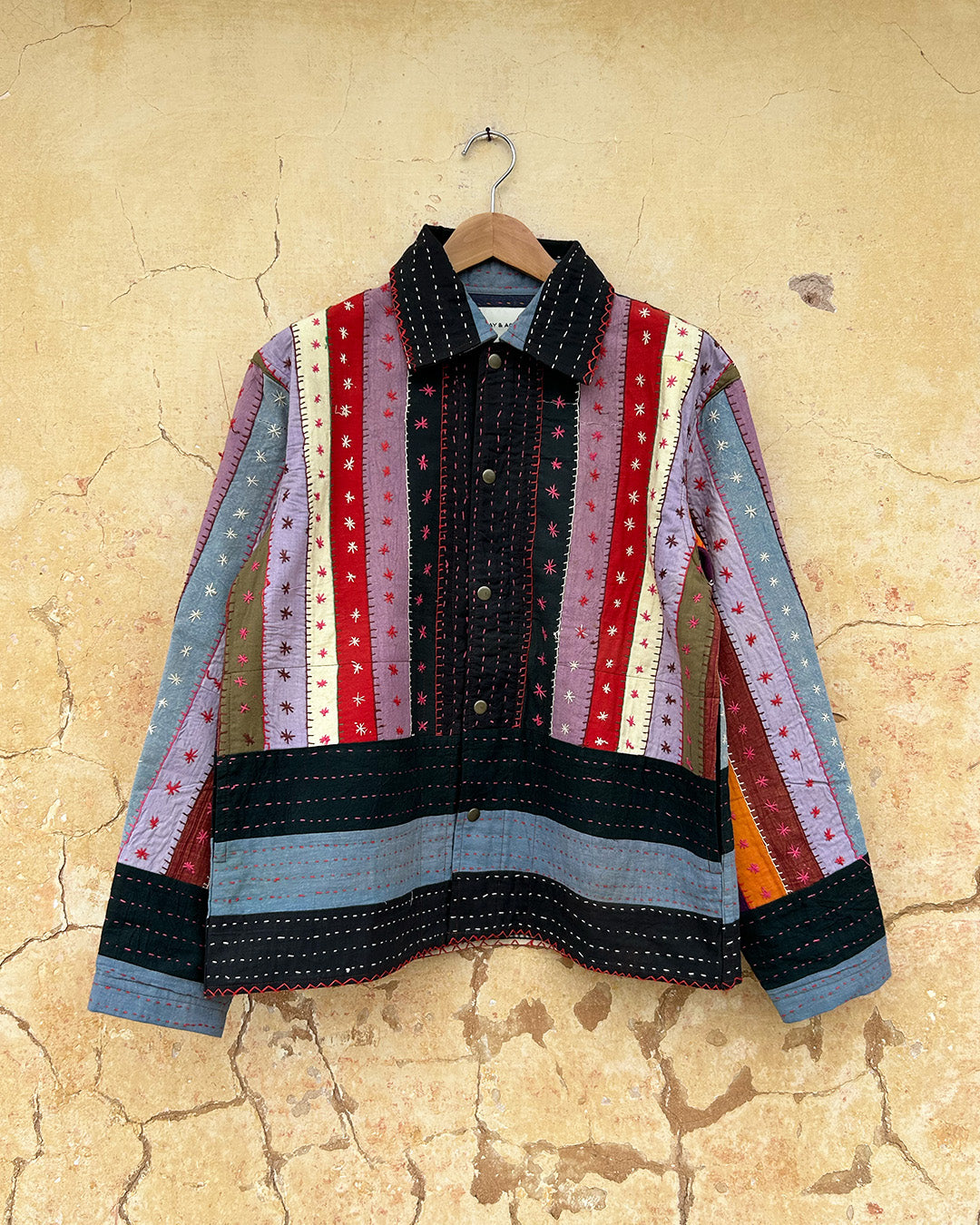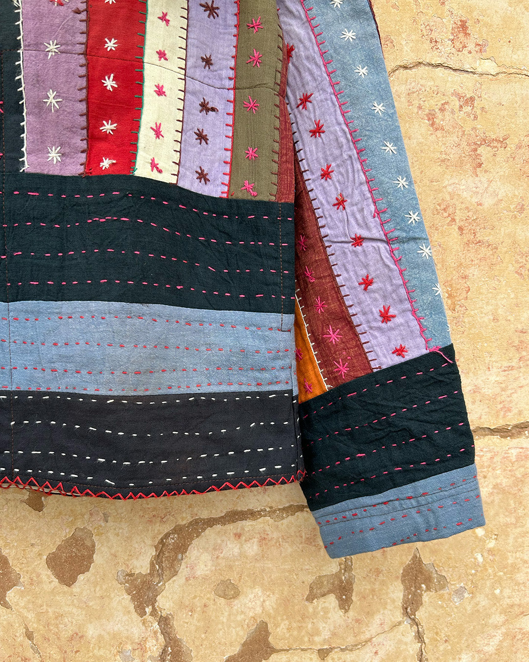 Garments of the Parallels Collection are made from one-of-a kind vintage patchwork bedspreads from Rajasthan. They feature multicolour strips and shapes patched together using blanket stitch and adorned with hand embroidered star-like motifs.