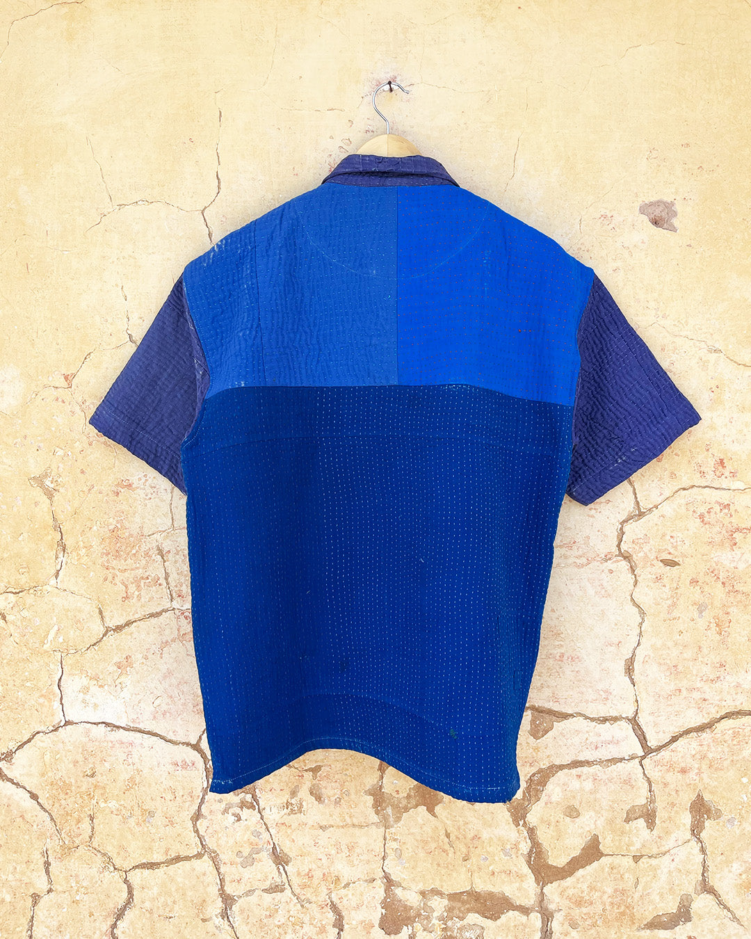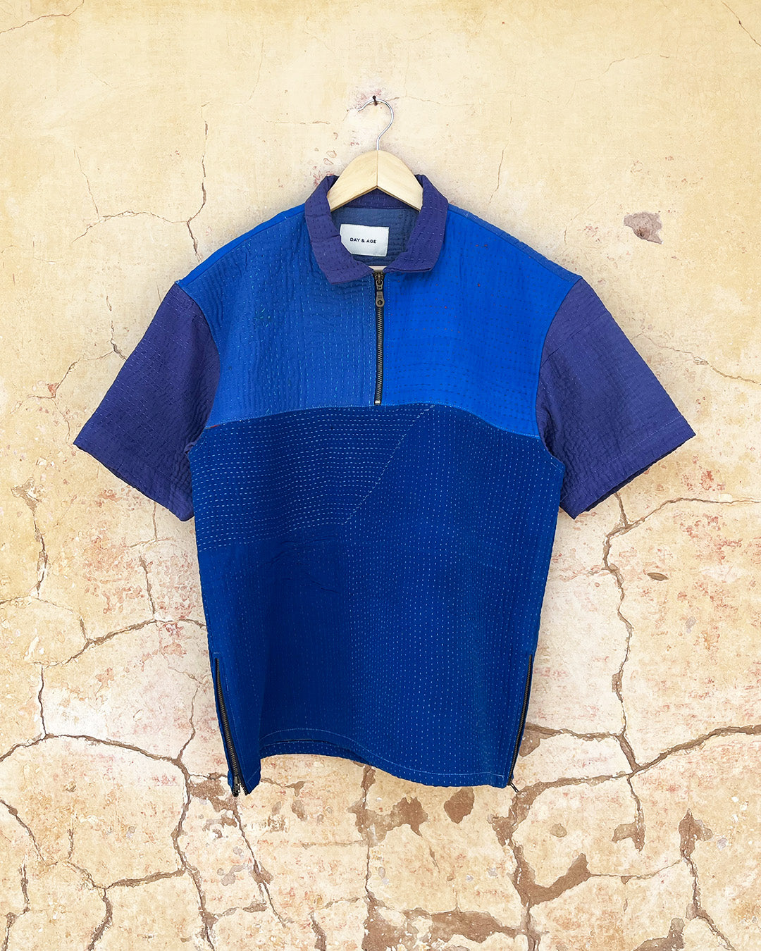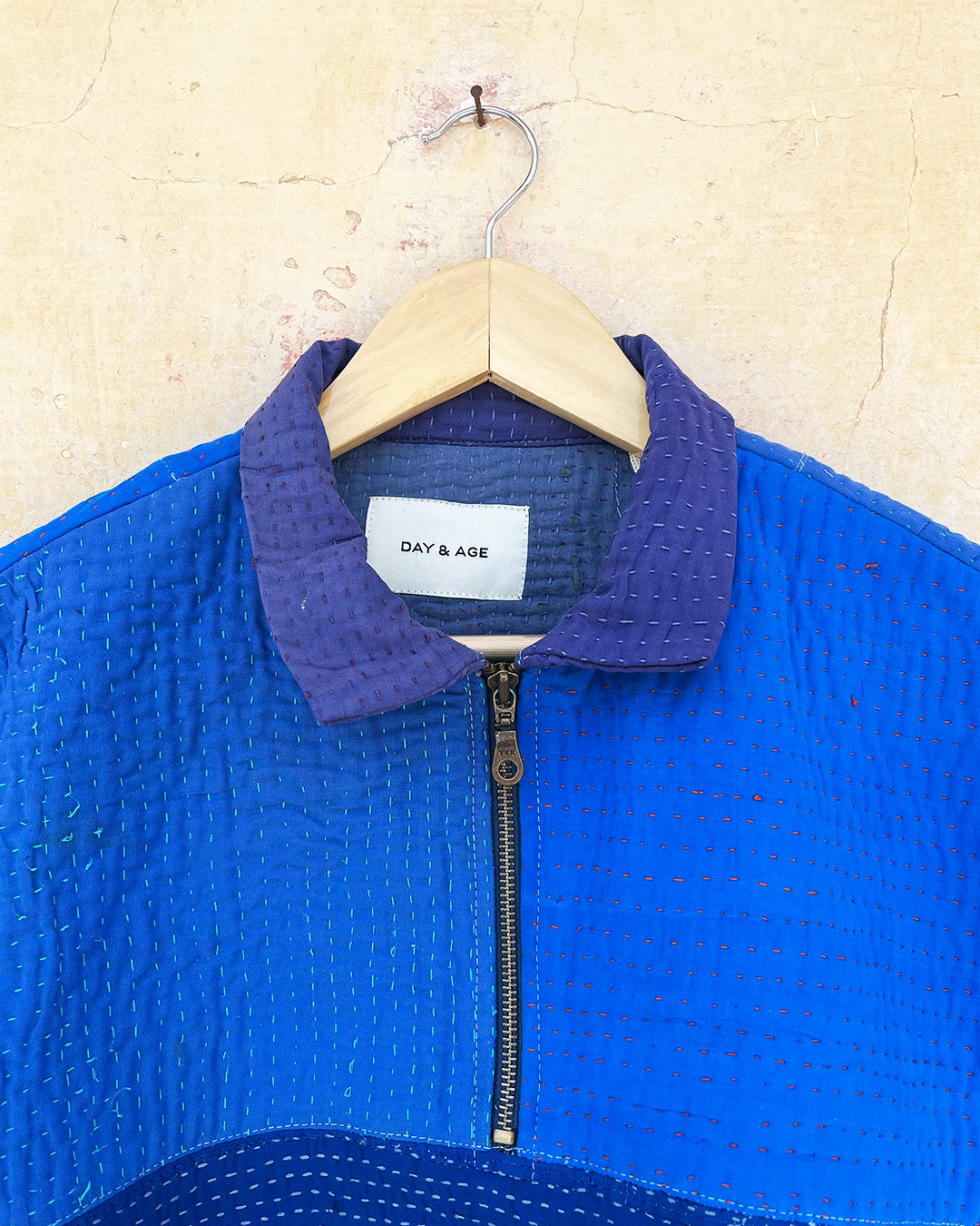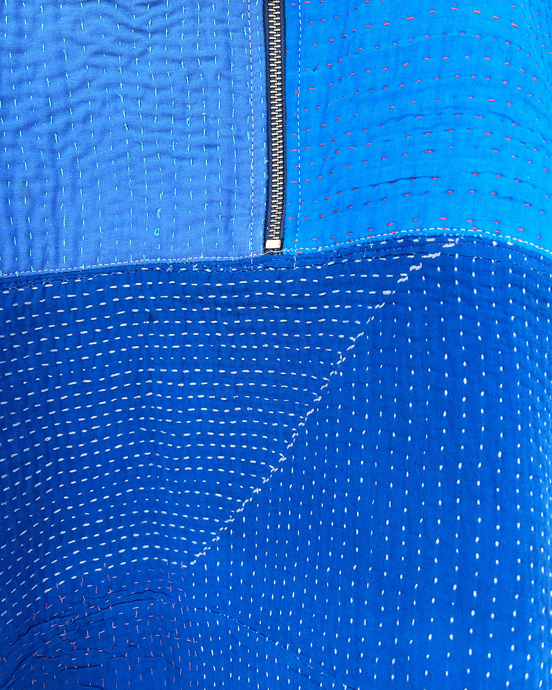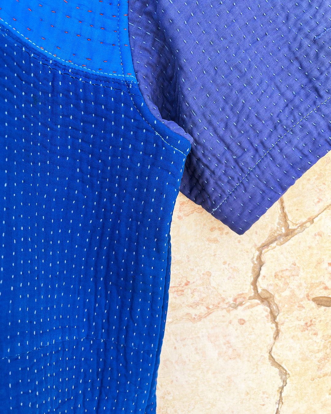 Kantha quilts are crafted from repurposed saris and fabrics and feature repairs, darning, and patchwork. These unique details not only add character but ensure durable, one-of-a-kind garments with a rich up-cycling heritage. We embrace the distressed patches alongside the intricate stitch work in the most unlikely colours.