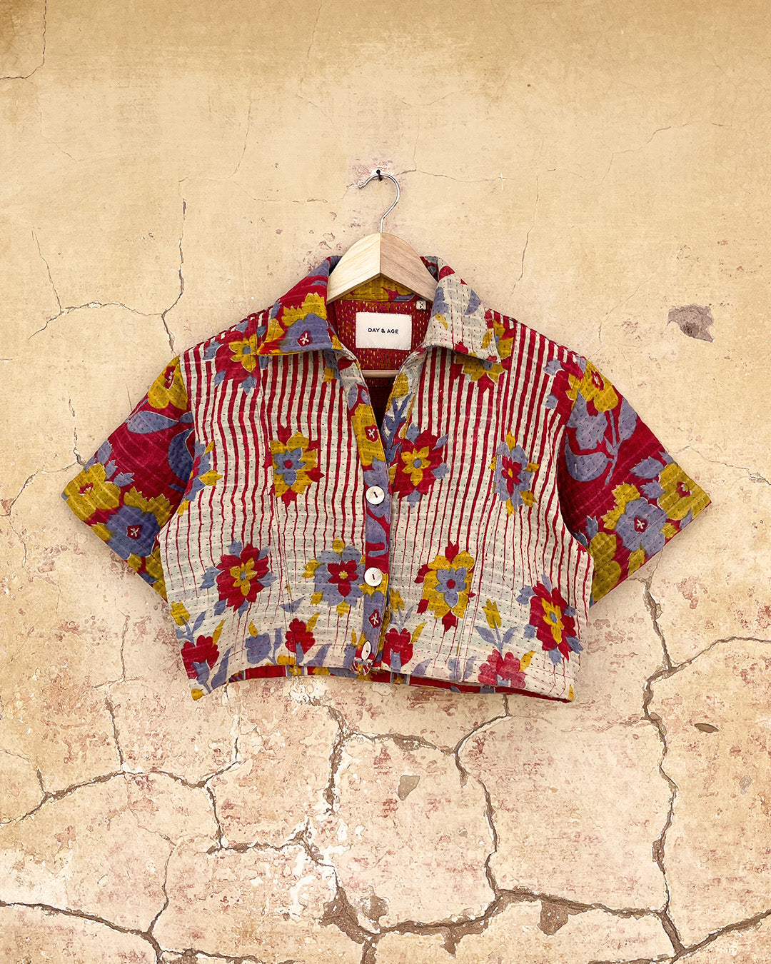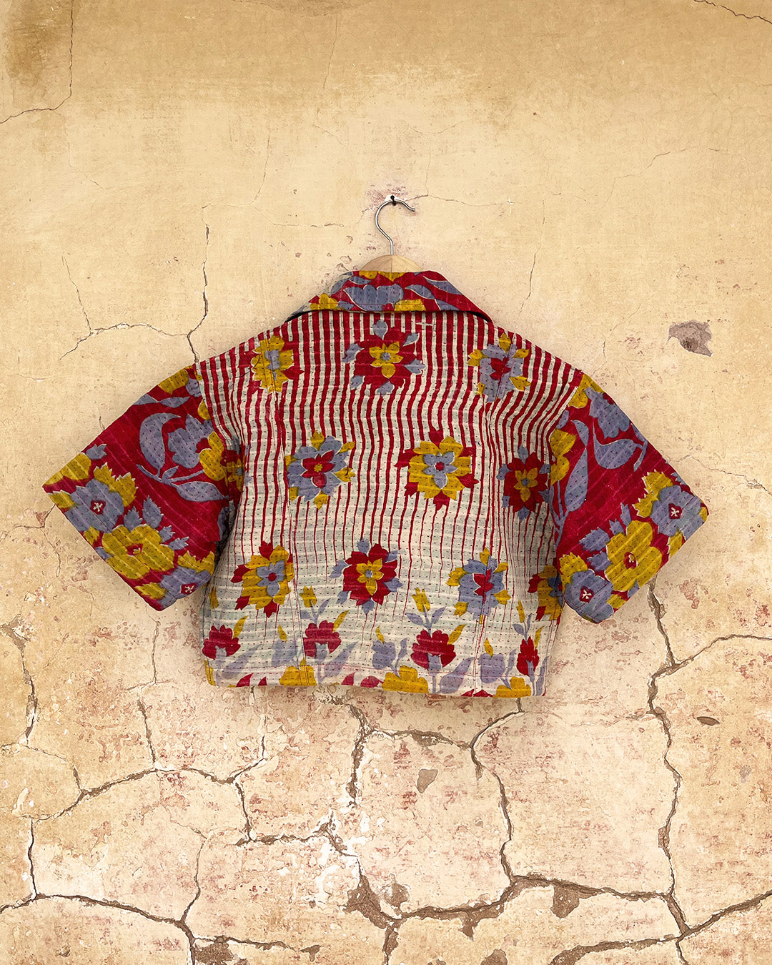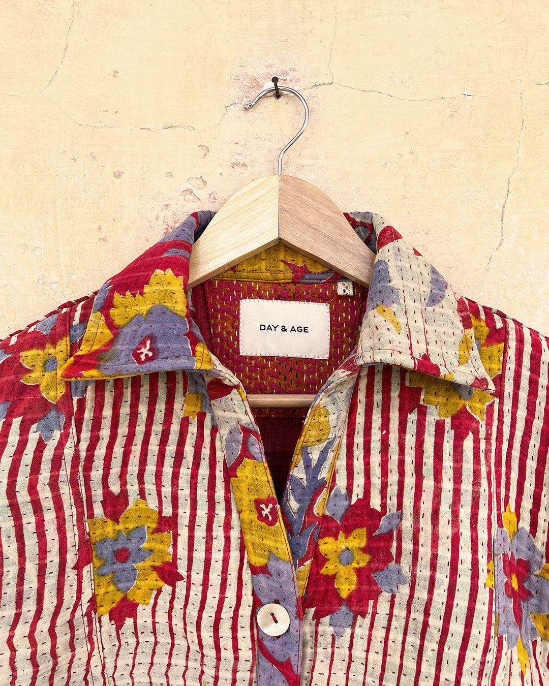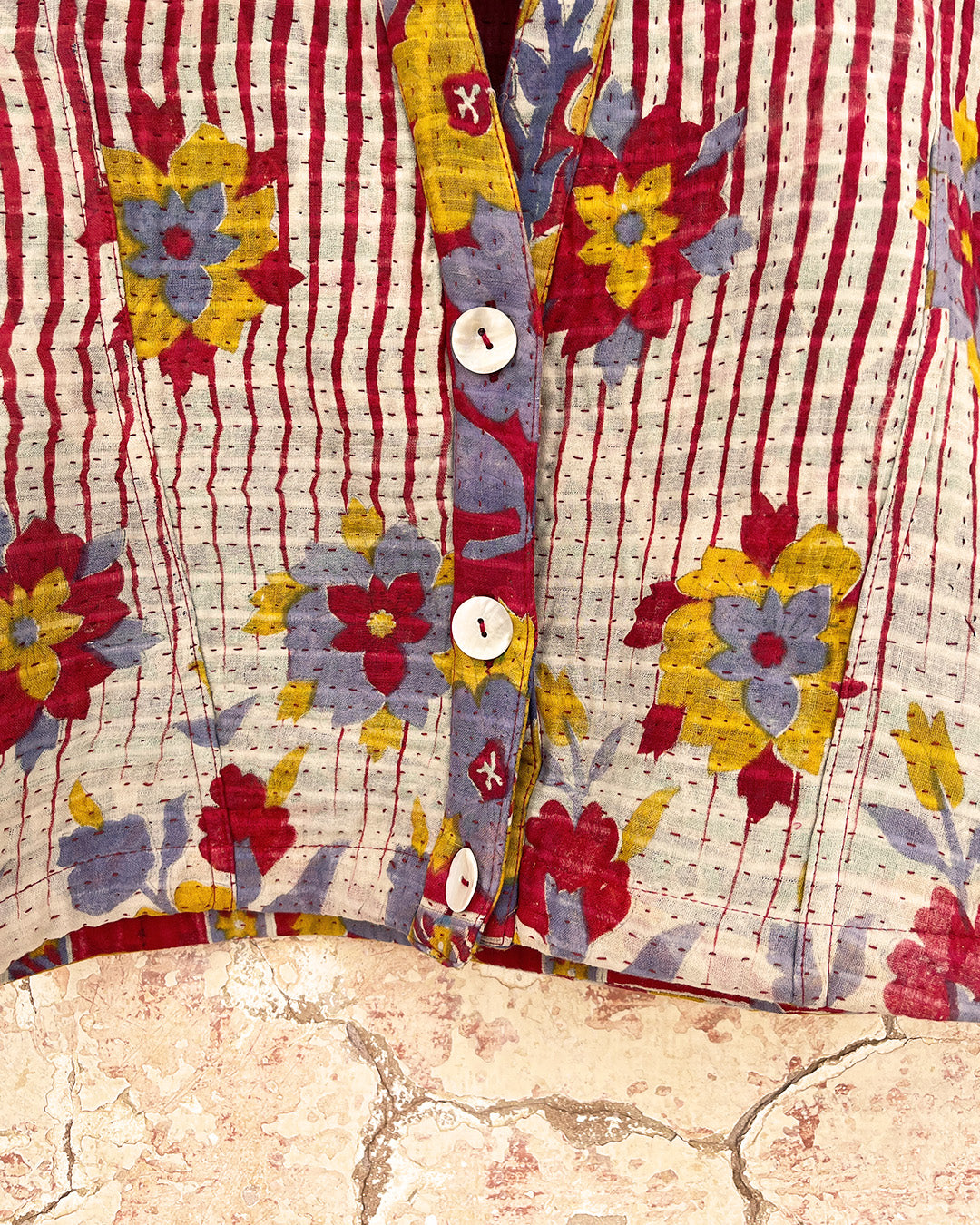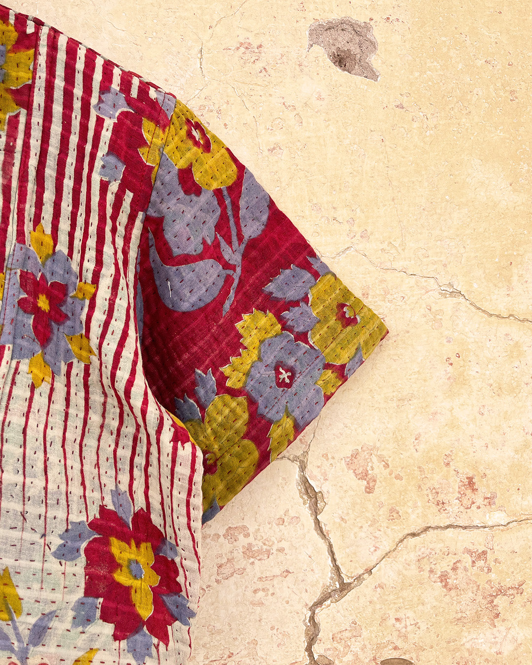 Kantha quilts are crafted from repurposed saris and fabrics and feature repairs, darning, and patchwork. These unique details not only add character but ensure durable, one-of-a-kind garments with a rich up-cycling heritage. We embrace the distressed patches alongside the intricate stitch work in the most unlikely colours.